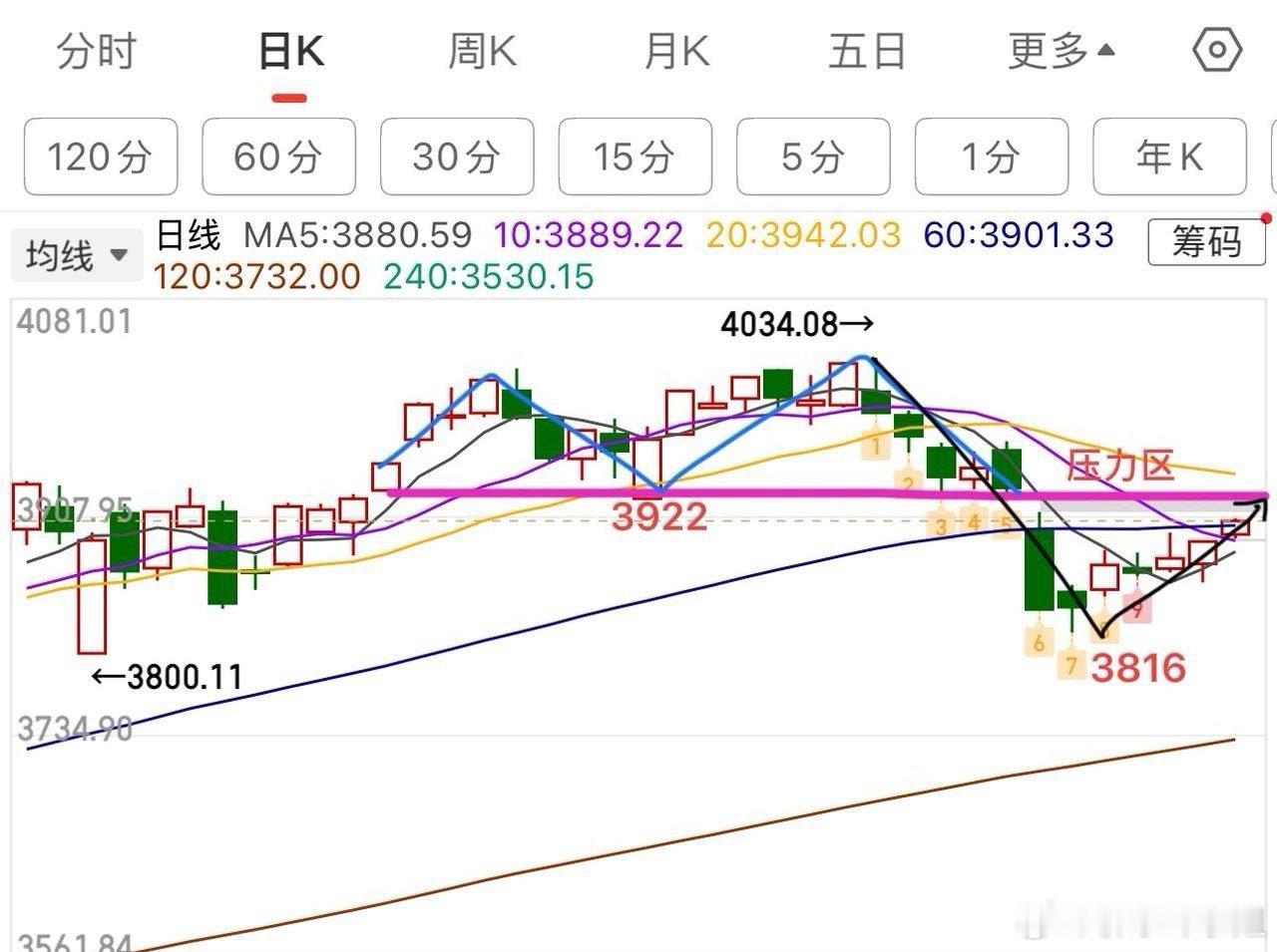 从3816开始的向上反弹,仍当作是跌破3922颈线的反抽,注意3922仍是关键压力,也是5周均线压力,一次性突破难度较大,大概率还会有反复。从均线的角度观察,5日线拐头,而10日线方向还是向下,所以均线方向不统一,震荡就还会延续。当作跌破3922颈线反弹看待,注意3922颈线/缺口压力,但也不需要太担心,总体中枢震荡在延续,只不过级别放大了,回调依旧可以需求机会。A股半日放量2504亿A股三大股指集体高开 军工板块领涨a股