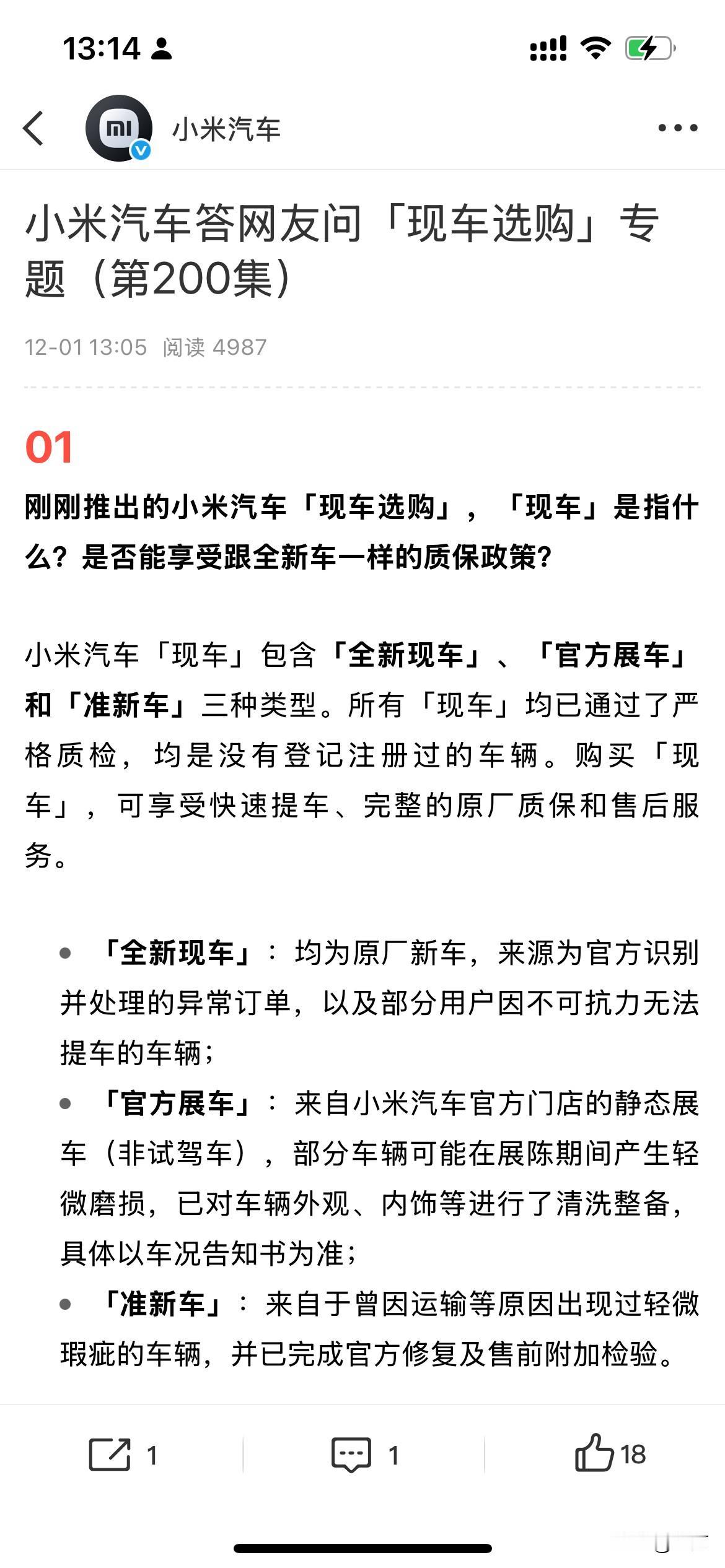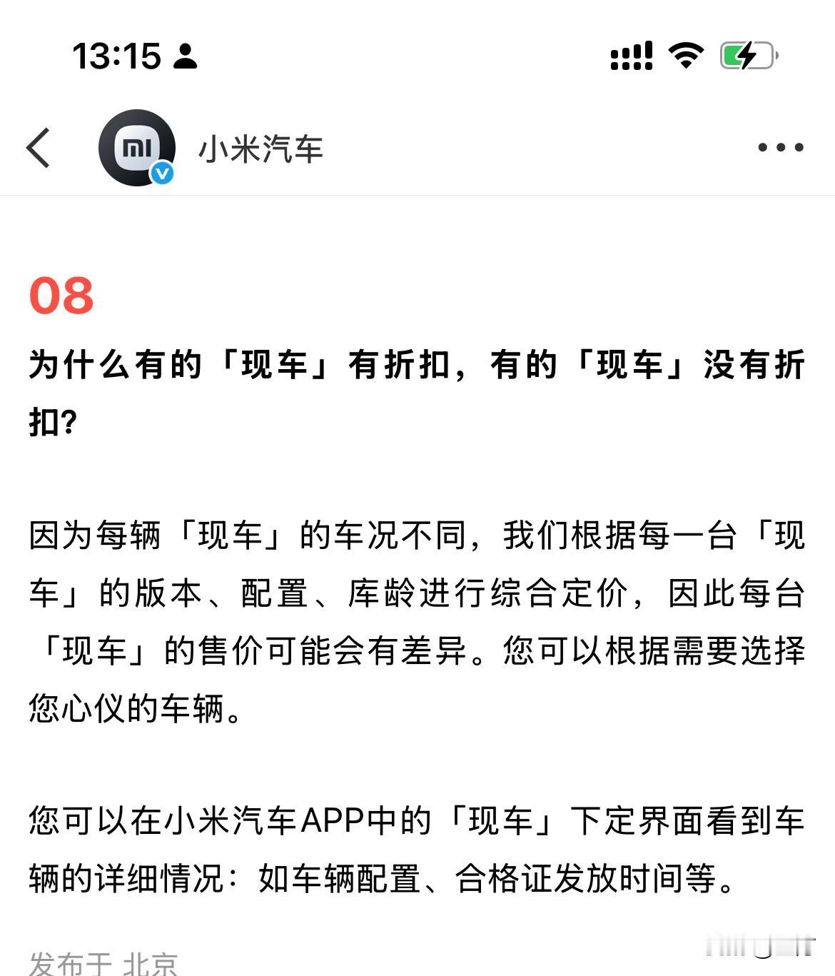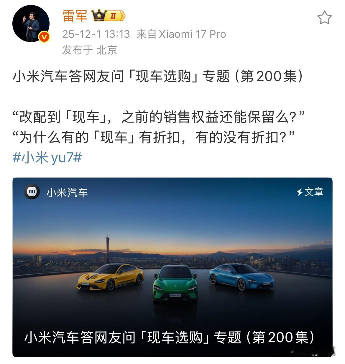 雷军解释: “为啥有的现车有折扣,而另外的却没有。”。 因为今天早上,雷军发了一条微博,让很多人注意到了,现在他们有部分展车、新车以及现车出来,可以马上提走的那种,而且还有部分现车可以打折。 所以就有很多用户提出了各种各样的问题,包括为什么同样是新车或者现车,还有些能够打折,有些不能够打折。 于是雷军转发了他们小米汽车官方对这些问题的汇总,给大家进行的比较认真的分析和解答。 简单地说,就是现在放在仓库里面的车,每一台的配置以及放的时间长短不一样,包括有的是在历次活动当中的展车,所以各个批次,各个型号的区别是很大的,所以每个车的折扣力度也不一样,售价也不一样,这种样的区别还是比较大的。 但是唯一不同的是,这些都是新车,都是一手车,而且没有使用过的,所以在这个基础上可以打折,对于很多人来说是有吸引力的,因此大家下了单要提车的人,可以去附近的小米专卖店问一问看一看。 说不定还能够减点便宜,同时也拿到新车,关键是马上就要过年了,能够提前到拿到新车,确实是一件愉快的事情,不过在整个环节的过程中,一定要认真地检查车辆,这一点也是必须的。