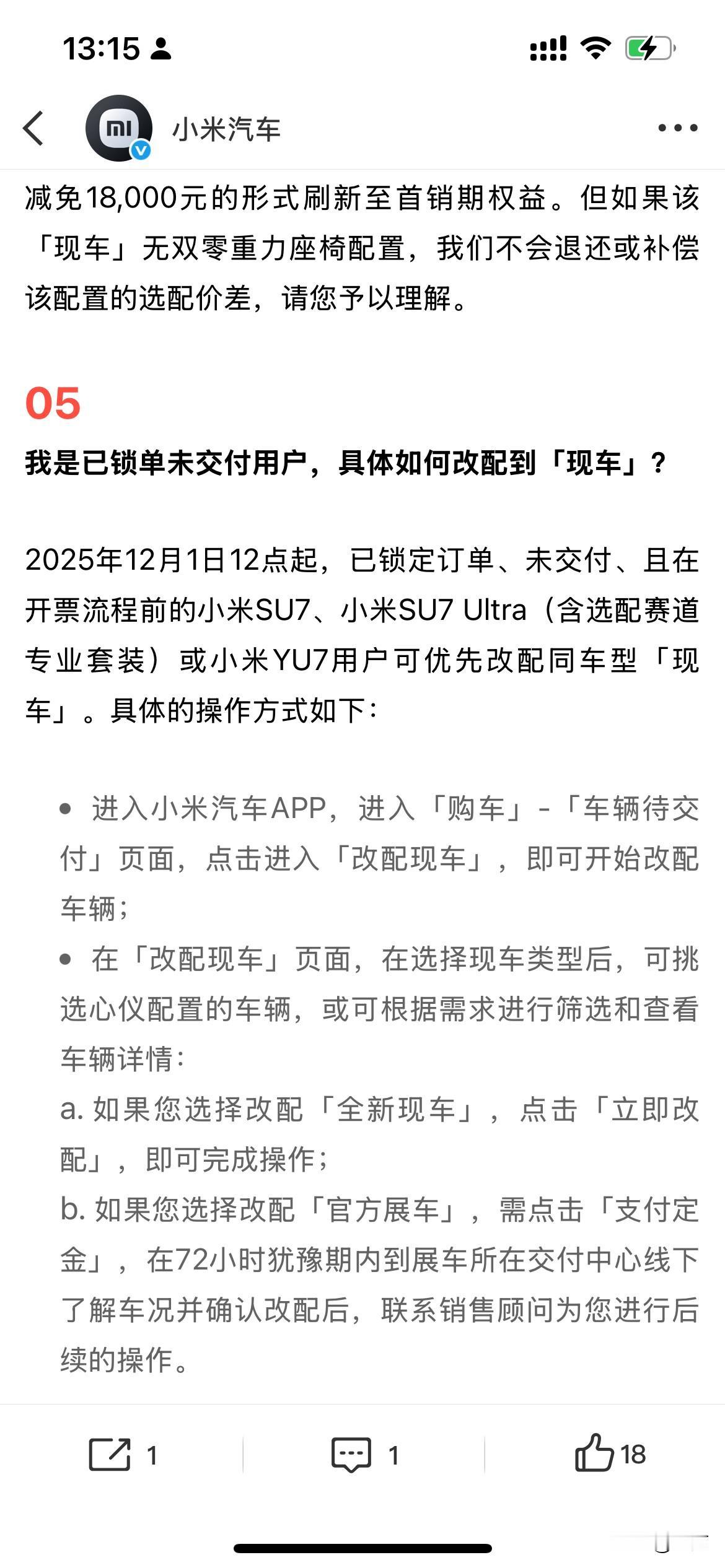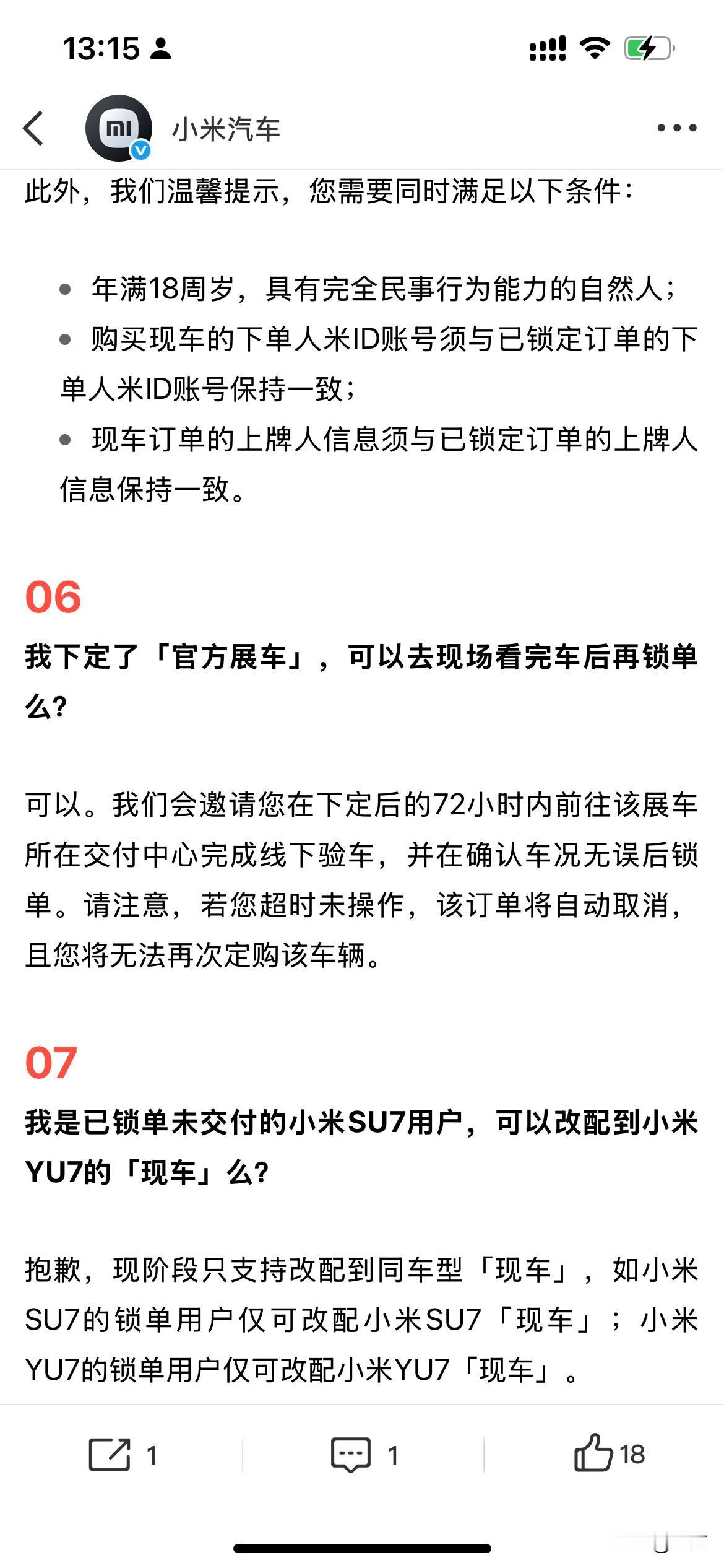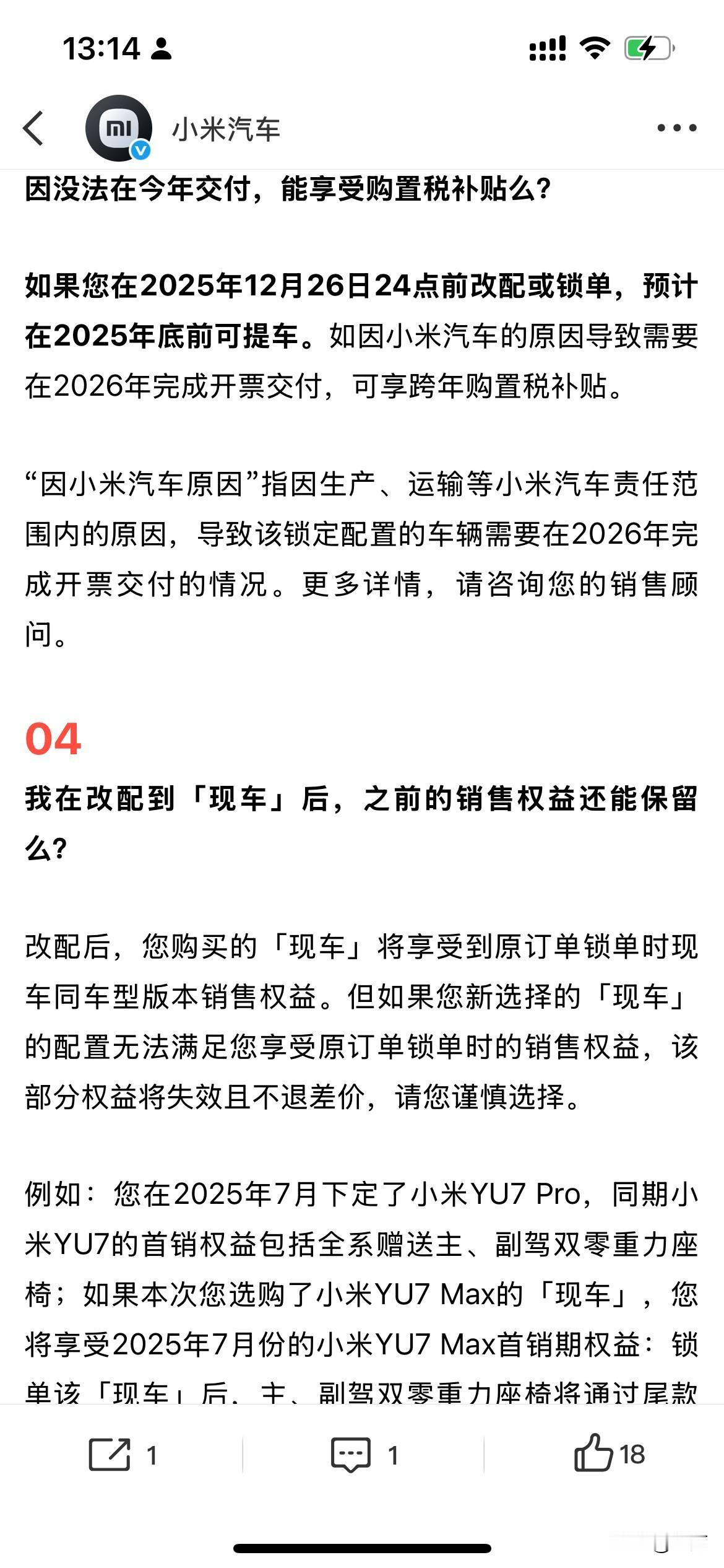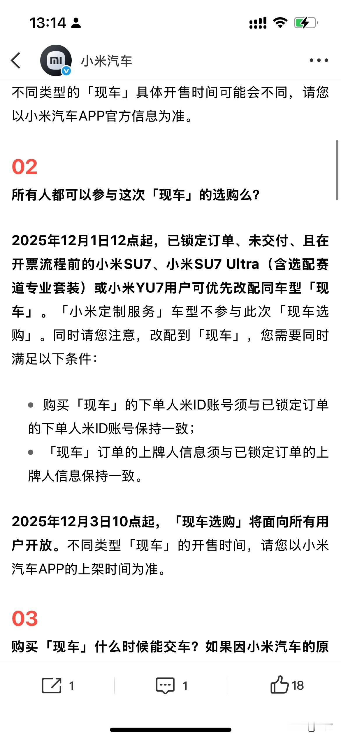 雷军解释: “为啥有的现车有折扣,而另外的却没有。”。 因为今天早上,雷军发了一条微博,让很多人注意到了,现在他们有部分展车、新车以及现车出来,可以马上提走的那种,而且还有部分现车可以打折。 所以就有很多用户提出了各种各样的问题,包括为什么同样是新车或者现车,还有些能够打折,有些不能够打折。 于是雷军转发了他们小米汽车官方对这些问题的汇总,给大家进行的比较认真的分析和解答。 简单地说,就是现在放在仓库里面的车,每一台的配置以及放的时间长短不一样,包括有的是在历次活动当中的展车,所以各个批次,各个型号的区别是很大的,所以每个车的折扣力度也不一样,售价也不一样,这种样的区别还是比较大的。 但是唯一不同的是,这些都是新车,都是一手车,而且没有使用过的,所以在这个基础上可以打折,对于很多人来说是有吸引力的,因此大家下了单要提车的人,可以去附近的小米专卖店问一问看一看。 说不定还能够减点便宜,同时也拿到新车,关键是马上就要过年了,能够提前到拿到新车,确实是一件愉快的事情,不过在整个环节的过程中,一定要认真地检查车辆,这一点也是必须的。