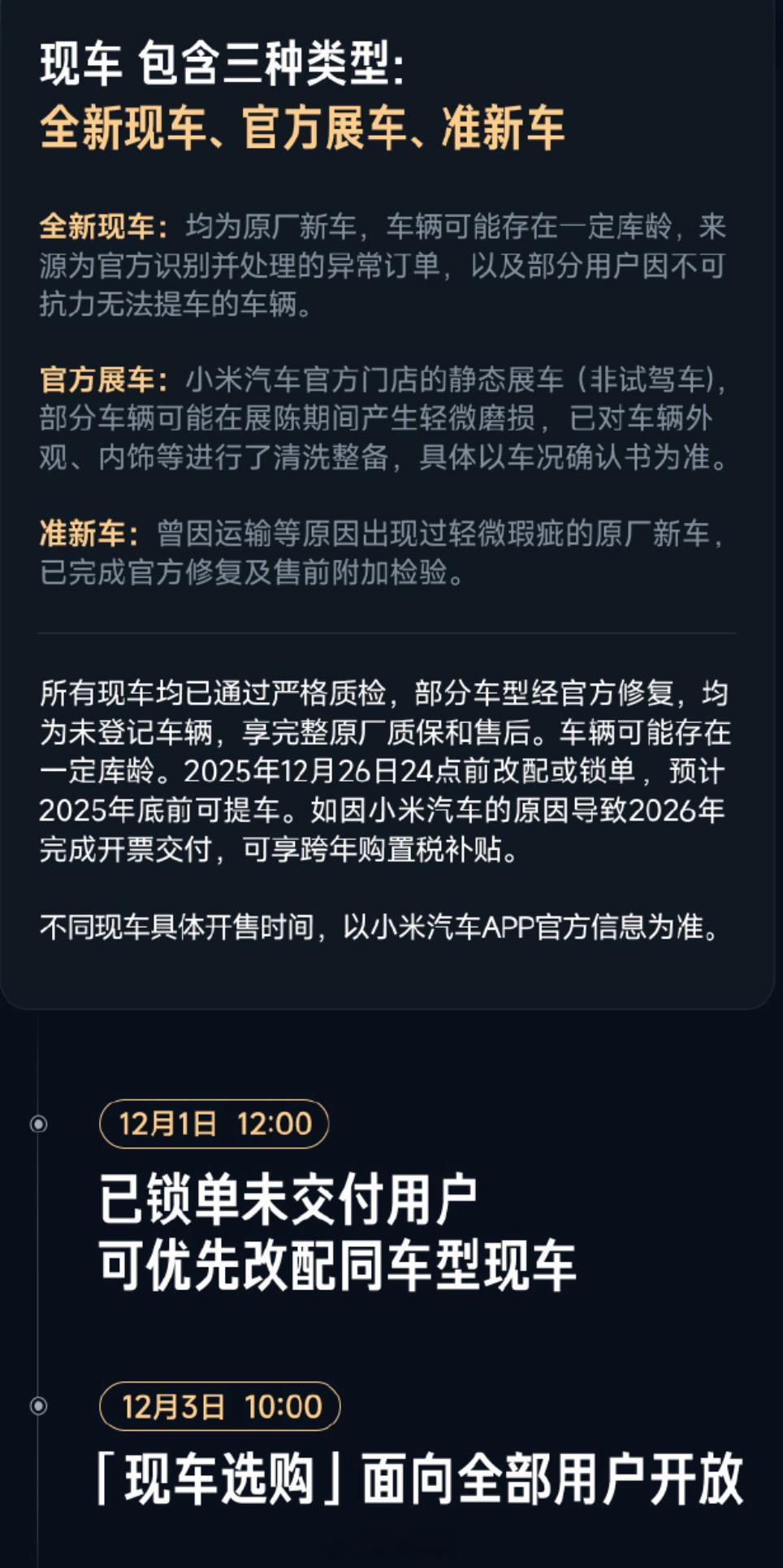 小米汽车即将开启现车选购,部分车型可享优惠,已锁单用户今天可以改配。