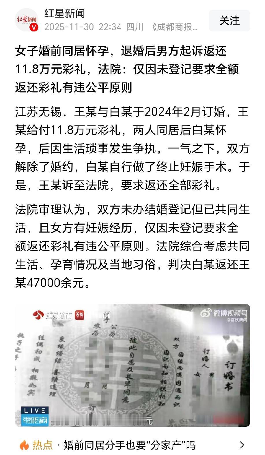江苏无锡,女子订婚后,男方给了她11.8万彩礼,想着结婚也是八九不离十的事,她就和男友开始同居。同居怀孕后,女子以为她会被全家人捧在手心,没想到,男友竟因一些生活琐事和她争执不断,完全没有宠着她的意思。两人一气之下解除了婚约,女子更是自行去医院终止妊娠。男友得知后,把女子告上法庭,要求退还11.8万彩礼,法院这样判! 2024年2月,白女士和男友王某敲定了婚约,红本本虽还没领,但王某按当地习俗给了11.8万彩礼。 看着沉甸甸的现金,白女士心里塌实不少,觉得这门婚事算是板上钉钉了。没过多久,两人便搬到一起同居,憧憬着婚后的小日子。 让白女士没想到的是,同居没几个月,她就发现自己怀孕了。 拿着验孕棒上的两条红杠,她满心欢喜地告诉王某,本以为会迎来男友的加倍呵护,就连未来公婆也该把她当宝贝疙瘩疼着。 可现实却给了她一记闷棍,王某不仅没表现出多少当爸爸的喜悦,反而因为柴米油盐的琐事频频和她争执。 可能是觉得生米煮成了熟饭,王某不仅没有了恋爱时的关心,反而因为一些生活琐事处处指责白女士。 这些指责像针一样扎在白女士心上,怀孕带来的孕吐反应和身体不适本就让她情绪敏感,可男友的不理解和不耐烦让她越来越寒心。 白女士无数次夜里偷偷抹泪,想着当初那个体贴入微的男人怎么变了模样,难道有了孩子,这份感情就变得廉价了? 几次大吵之后,两人都攒够了失望。白女士看着王某冷漠的脸,心里的委屈和愤怒翻涌,最终两人在争吵中闹到了分手的地步,婚约也在争吵中彻底解除了。 冷静下来后,白女士看着自己还未显怀的肚子,想到这段破碎的感情,实在没勇气独自生下孩子。 思前想后,她没和王某商量,独自去医院做了终止妊娠手术。 王某得知消息后,觉得白女士太自私,不仅毁了婚约,还擅自打掉了孩子,那11.8万彩礼不能就这么打了水漂。 现在婚结不成了,孩子也没了,王某觉得自己人财两空,既然挽不回这段爱情,那就损失最小化,追回这笔彩礼。 可白女士坚决不同意:“我们已经同居过,我还怀了你的孩子,现在身体和精神都受了伤害,彩礼怎么可能全额退?” 双方争执不下,王某一气之下将白女士告上了法庭,要求返还全部11.8万彩礼。 法庭上,白女士委屈地陈述着同居后的种种,说起怀孕后的委屈和终止妊娠的无奈。 而王某则坚持认为,没登记结婚,按照法律规定就该全额退彩礼,这是天经地义的事。 《最高人民法院关于适用〈民法典〉婚姻家庭编的解释(一)》第五条规定:当事人请求返还按照习俗给付的彩礼的,如果查明属于以下情形,人民法院应当予以支持:(一)双方未办理结婚登记手续 。 本案中,王某以他们“未登记”结婚为由,主张全额返还,看似符合法律规定。 但如果机械的判决全额返还彩礼,将忽视白女士在同居及孕育过程中的付出与损害,违背公平原则。 白女士终止妊娠的行为虽未经王某同意,但结合双方已解除婚约的背景,其选择具有一定合理性。 《最高人民法院关于审理涉彩礼纠纷案件适用法律若干问题的规定》第六条规定:双方未办理结婚登记但已共同生活,一方请求返还按照习俗给付的彩礼的,人民法院应当根据彩礼实际使用及嫁妆情况,综合考虑共同生活及孕育情况、双方过错等事实,结合当地习俗,确定是否返还以及返还的具体比例。 本案中,王某与白女士虽未办理结婚登记,但已实际共同生活,且白女士有过妊娠经历并终止妊娠。 法院查明,共同生活期间彩礼已用于双方日常开销,部分损耗客观存在。 而且,白女士终止妊娠对其身体和精神造成双重损害,全额返还将显著加重其负担。 最后,双方因生活琐事争执解除婚约,均存在一定过错,不宜由单方承担全部责任。 综上,法院综合考虑两人共同生活的时长、孕育情况以及当地彩礼习俗等因素,作出判决:白女士返还王某彩礼47000余元。 判决虽然画上了句号,但是这段曾经满怀期待的感情,终究没能抵过现实的琐碎和彼此的消耗。