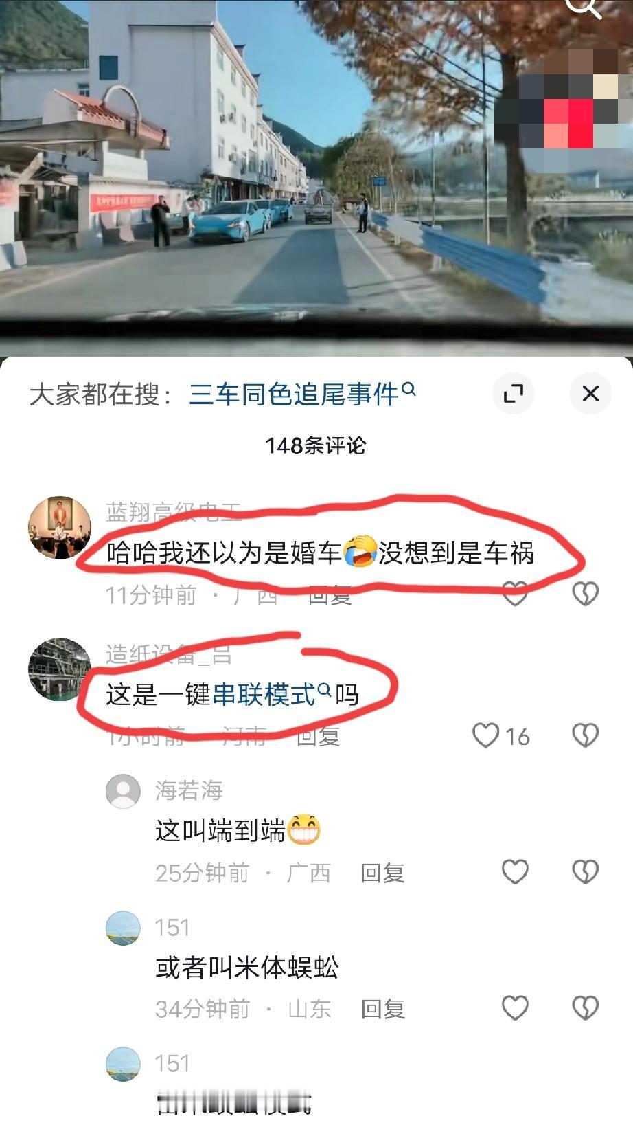 三台“海湾蓝”的华为su7就这样水灵灵的在如此狭窄的乡间小路上连环追尾啦?这种小路上都能发生连环追尾,我也是服了这几位车主了! 网友不禁吐槽:一开始还以为是婚车队,没想到是车祸,这是一键串联模式吗? 这个事情上,我敢百分之百肯定,车子肯定是没有任何问题的,要么是司机技术太差,要么是开太快了,要么就是开车注意力不集中,还有一种可能就是酒驾!