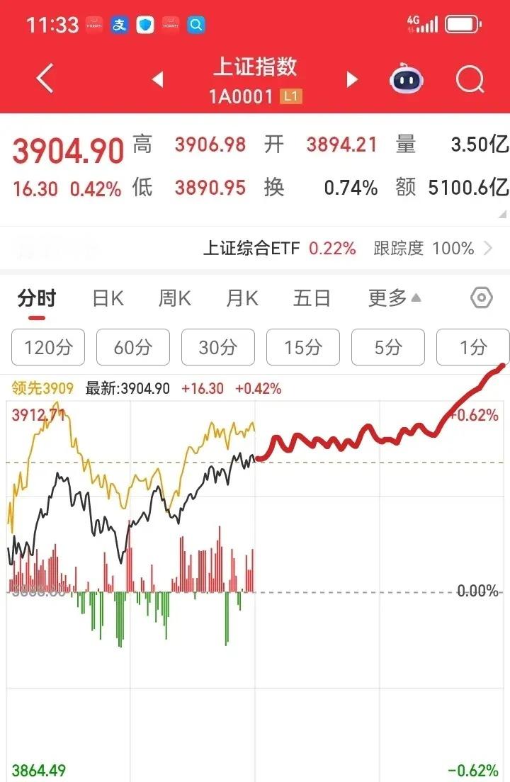 下午大盘会怎么走呢?请看图,预计下午一开盘,大盘还是横盘震荡,稍微向上走,大盘横盘震荡到两点半左右,突然斜线拉伸。当然不是直线拉伸,是斜线向上倾斜,向上60°左右倾斜。但是这个拉伸也算不错了,到收盘应该是中阳线了。昨天预测今天要收中阳线,上午大盘果然是高开高走,但是下午会不会真的收个中阳线呢?估计可能真的会收个中阳线,主力跟我想的一样,就是现在这里往上走一走。走一波,这一波走完以后再回调,就这样子在12月份上上旬走一波,如图所示。