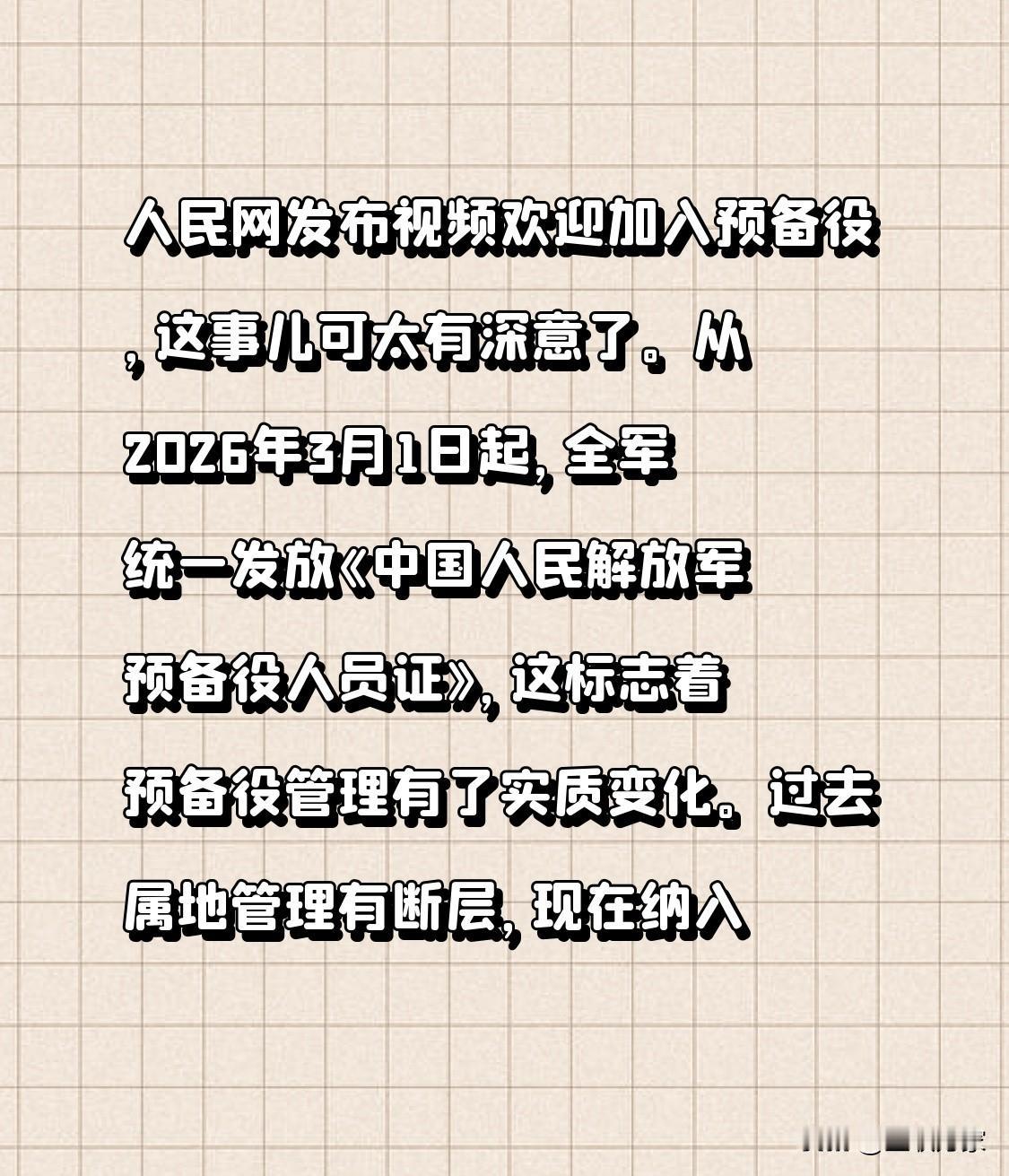 人民网发布视频欢迎加入预备役,这事儿可太有深意了。从2026年3月1日起,全军统一发放《中国人民解放军预备役人员证》,这标志着预备役管理有了实质变化。过去属地管理有断层,现在纳入统一编制,就像把散沙捏成了一股能上战场的劲儿。 而且配套措施很给力,登记流程简化,待遇提高,训练安排灵活,每年集中训练20到30天还有补贴,不影响工资。国家还在教育、医疗、就业方面给了优先待遇。外部环境有推动,邻国军事动作不断,咱这改变是有必要的,把合适的人安排到合适位置,大国布局很务实。 军人预备役 预备役人员 预备役人员法 军人预备役 预备役人员 预备役人员法 二次服预备役 预备役选拔 预备役通知书 服预备役通知书
