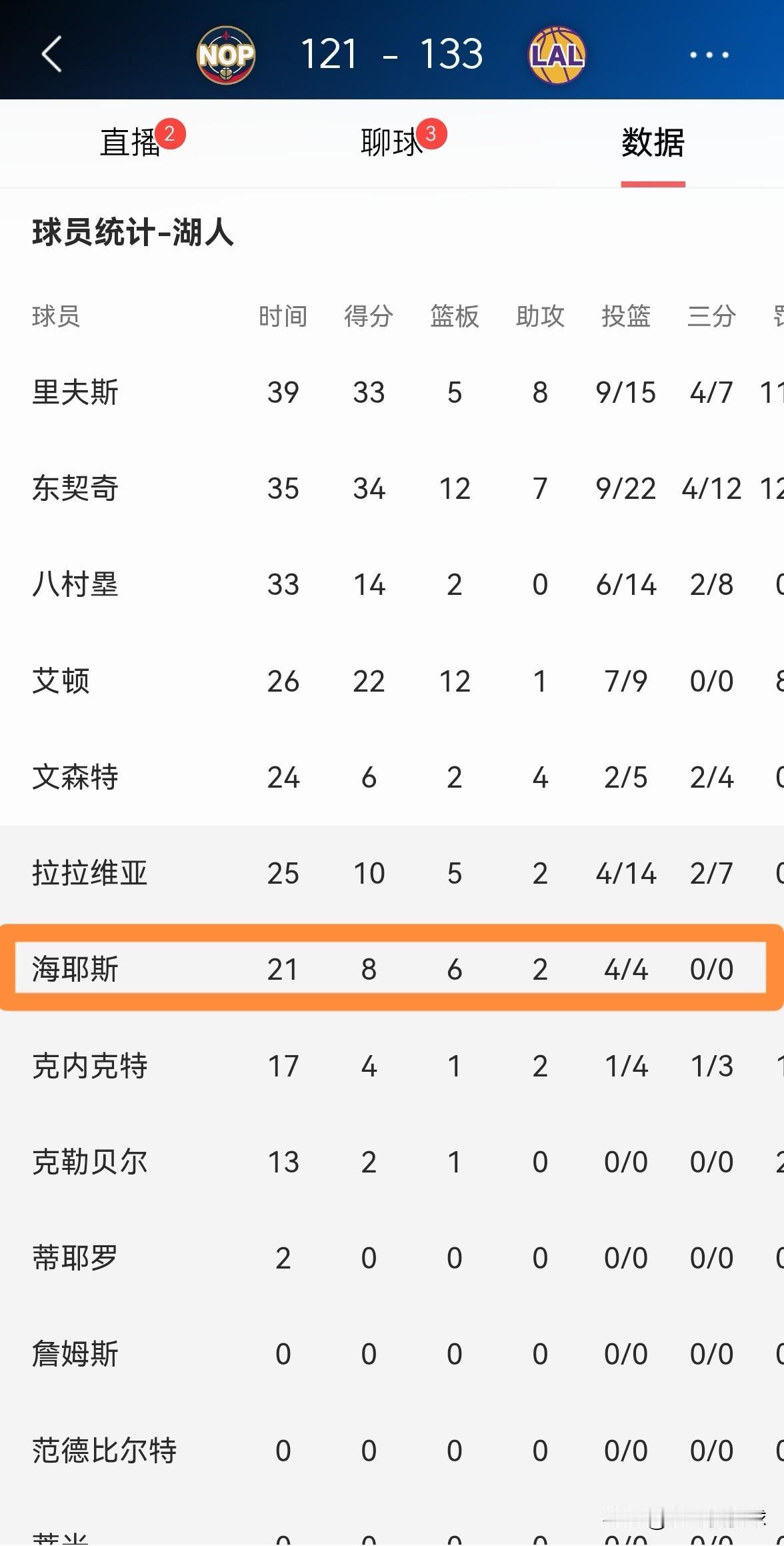 湖人中锋海斯不愧是NBA新晋的“饼皇”!在今天湖人主场以133:121击败鹈鹕的比赛中,海斯又被东契奇和里弗斯喂的饱饱的。 全场比赛下来,海斯替补出战21分钟,投篮4中4得到8分6篮板2助攻2盖帽。 毫不夸张的说,海斯绝对是当今联盟最幸福的人之一,因为他的得分实在是太容易了,基本上全是面对空篮的暴扣,让人不由自主的想起了年轻时效力于火箭时期的卡佩拉。