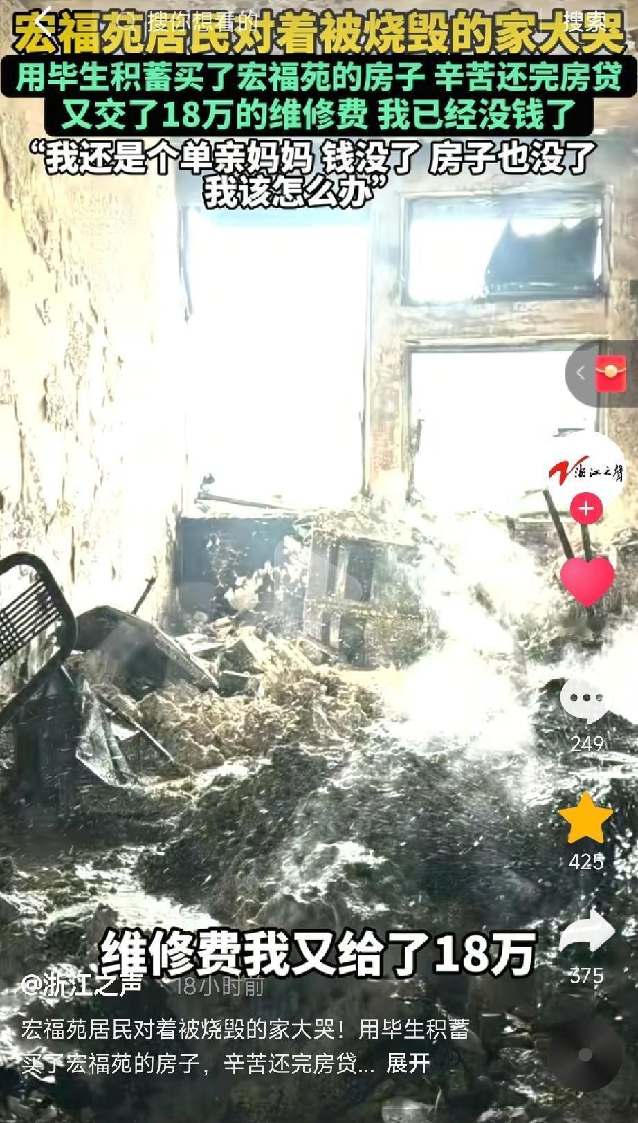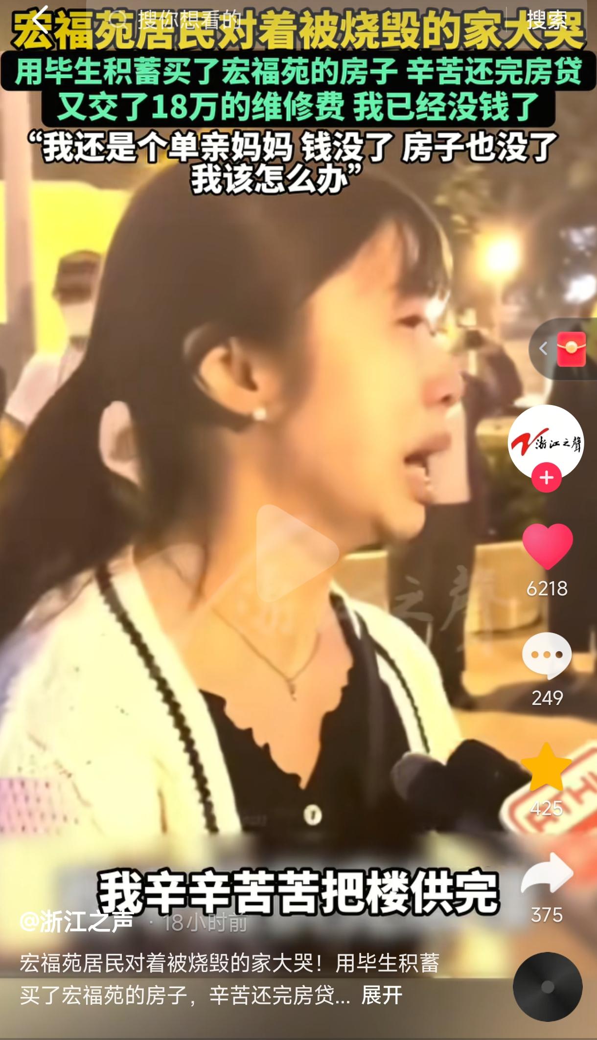 [流泪]太心疼这位单亲妈妈了,用一生积蓄去买了宏福苑的房,又辛辛苦苦供完房,还交了18万的维修费,没想到就这么被大火付之一炬......现在她房子没了,钱也没了,但还要独自一人带着孩子生活,这对她来说简直就是天塌了,她该何去何从呢? 这位范女士对着被烧毁的家与记者的镜头,崩溃大哭......确实,普通人穷尽一生就买一套房子,再说这位单亲妈妈还要独自抚养孩子长大,这样的生活压力怎能不让她崩溃? 范女士的遭遇是宏福苑大火中无数受灾家庭中的一个缩影,令人心痛不已。这一场无情的大火,不仅吞噬了无数人的美好家园,还令146人悲惨地丧生于大火之中,还有100人在失联中,(目前数据来自新闻报道)。家园被毁,房财两空......这是很多受灾居民的现状。 像范女士这样的家庭,生活可能会很难,但相信一切都会好起来的。相比那些失去生命的人,她还算比较幸运,因为没有什么比活着更重要了,人只要还活着,一切就都会有的。 再有,人间自有真情在,一八有难,八方支援;大火无情,人间有情。这场大火牵动全国人民的心,面对同胞有难,目前社会各界已经伸出了援助之手,发起了捐款捐物等爱心活动。 祈愿同胞们:多多保重,相信一切都会好起来的~~ (来源:浙江之声)