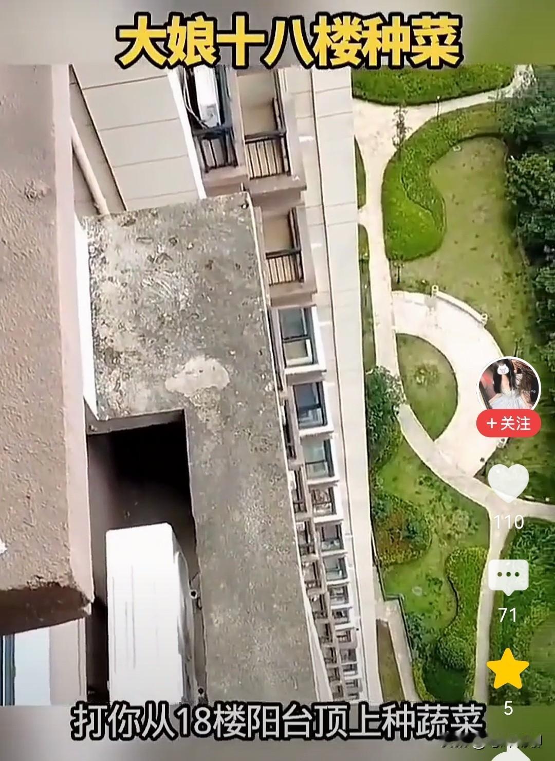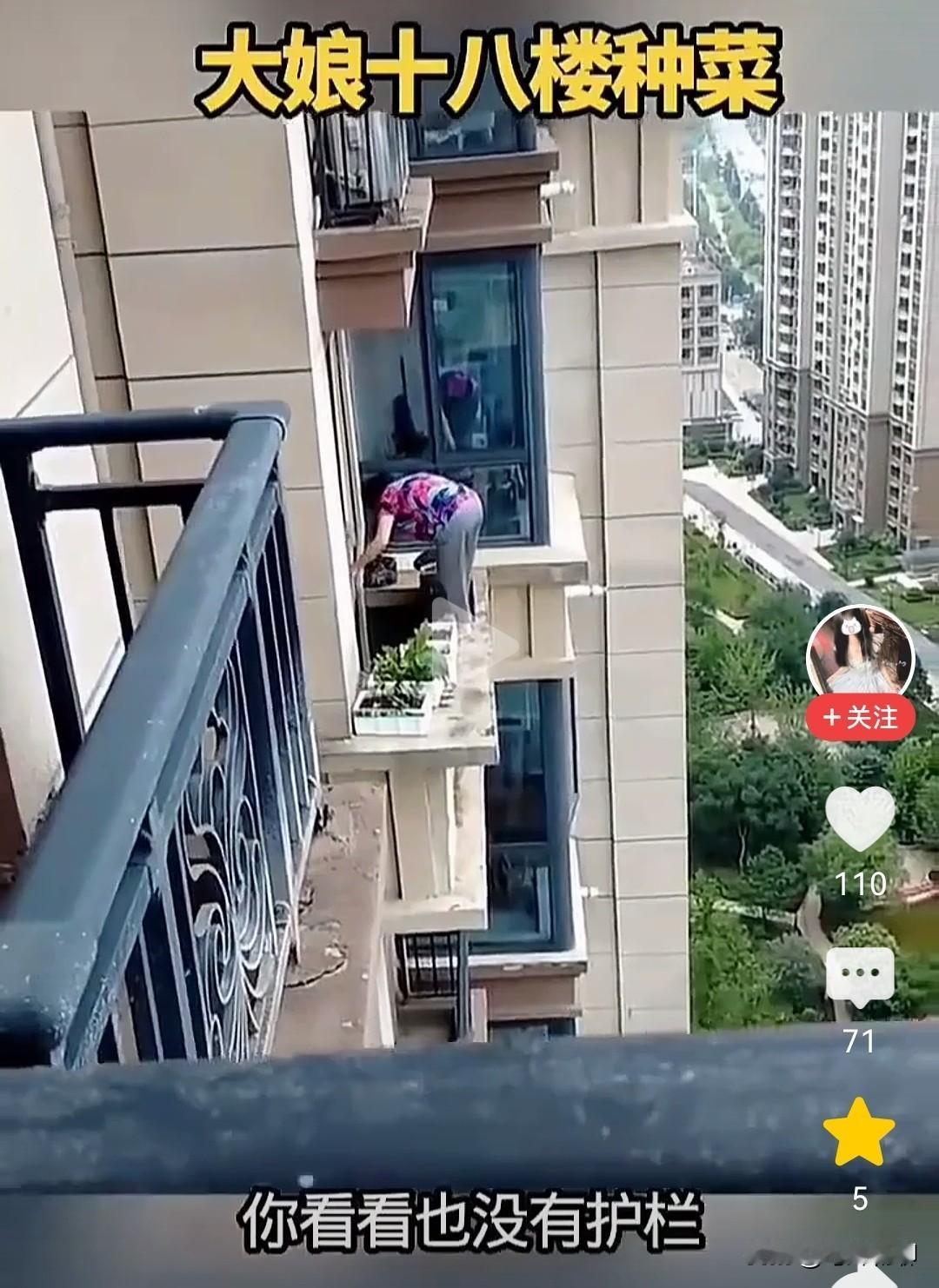 今天刷到个视频,视频中这位大娘还真是个狠人,把空调板当成自家菜园了,看看,就这么背对着临空一侧,看着一点都不害怕,还真是艺高人胆大。 要知道,常在河边走,哪有不湿鞋,不知道这是胆大还是无知,别为了种个菜却丢了性命,到时候后悔都来不及!王奶奶菜园