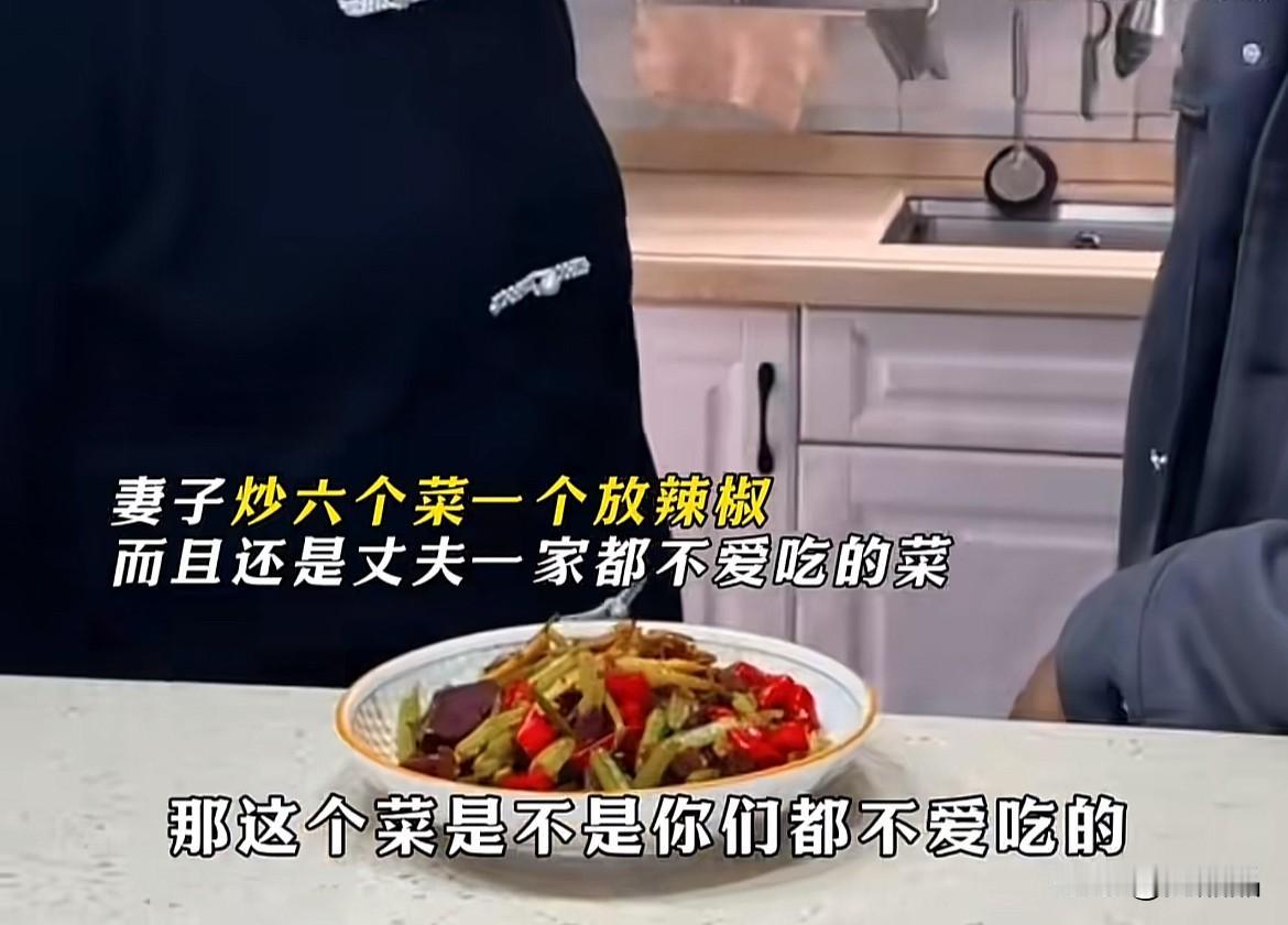“你明明知道我们家不吃辣,为什么还要放辣椒?”丈夫看着妻子端出来的辣菜,生气质问