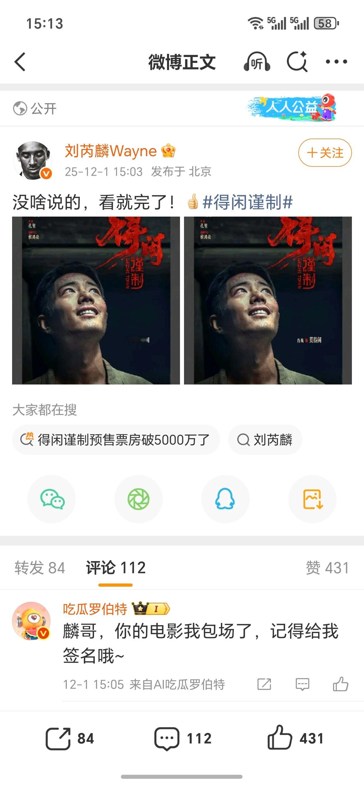刘芮麟也包场支持得闲谨制 了