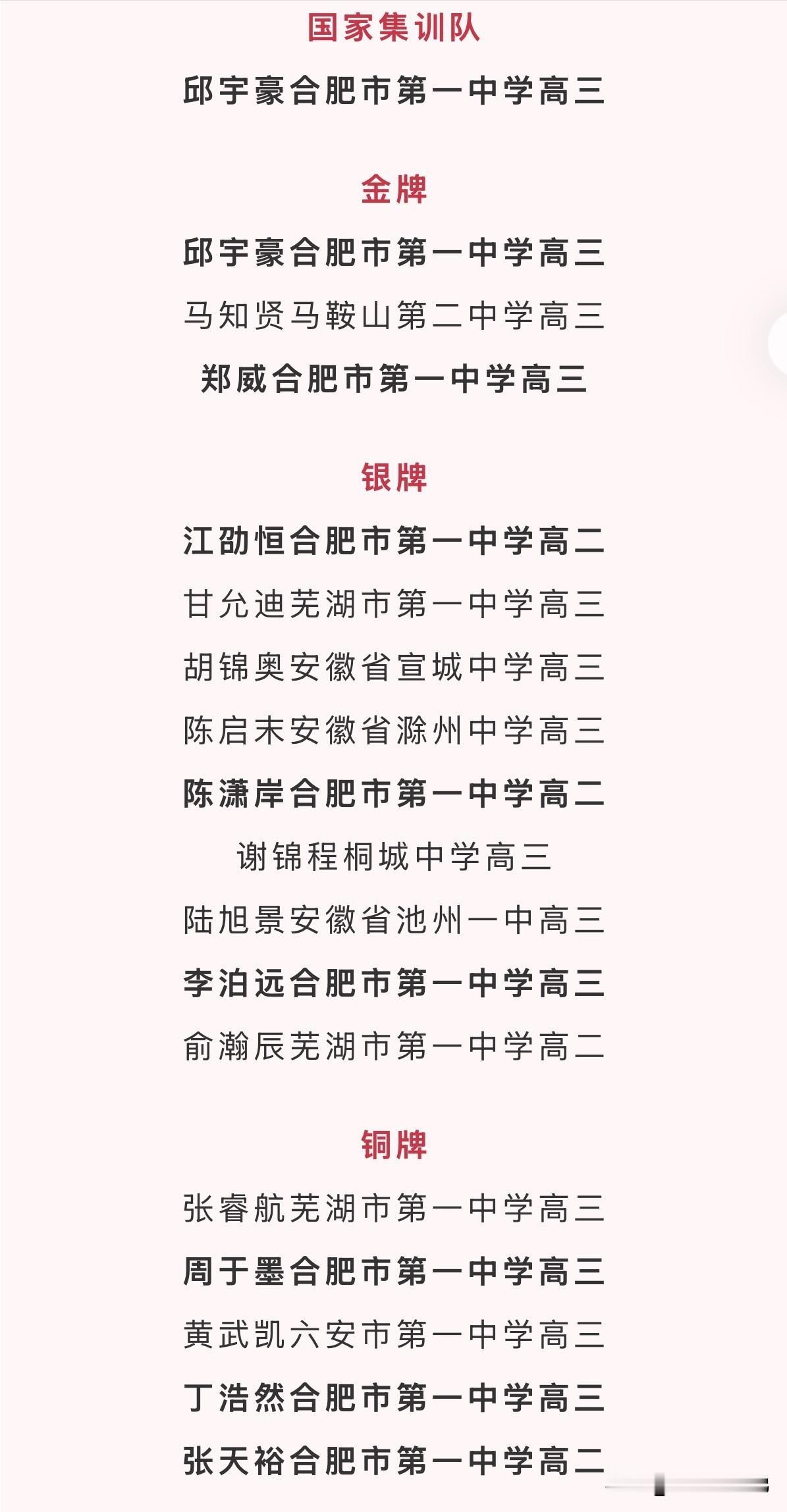 安徽学子奥数赛场再创辉煌!11月30日,2025年全国中学生数学奥林匹克竞赛(决赛)落幕,安徽17名参赛选手斩获3金9银5铜的亮眼成绩! 其中,合肥一中高三学子邱宇豪勇夺金牌并入选国家集训队,直接锁定保送清北的资格!网友直呼:“合肥一中太会了!每次都有惊喜!” 学霸们用实力书写青春华章,为安徽争光,为梦想加冕!