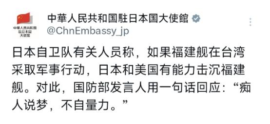 最近日本自卫队里有些人,说话越来越没谱了,硬撑着的架势看着都让人觉得尴尬。 12月1日,中国驻日本大使馆特意用中文日文双语发了条声明,把这事摆到了台面上——有日本自卫队相关人员放话,说要是福建舰在台湾相关海域采取军事行动,日本和美国联手就有能力把它击沉。 这话一出来,没等网友们多议论,国防部发言人直接用八个字给顶了回去:“痴人说梦,不自量力。” 这八个字说得干脆利落,既没多余的情绪,又把态度摆得明明白白,潜台词就是“别在这说空话,真有本事也不敢试”。 要知道,说这种大话得先摸摸自己的家底,光靠嘴硬可撑不起场面。先说说他们惦记的福建舰,这可是咱们中国第一艘电磁弹射型航母。 11月5号刚正式入列,算上之前的辽宁舰、山东舰,人民海军已经堂堂正正进入三航母时代了。可能有人觉得刚入列的航母没战斗力? 那可就想错了,早在9月份,歼-15T、歼-35这些舰载机就已经在福建舰上完成了弹射起飞和着舰训练,电磁弹射这门硬技术咱们已经玩得很熟练了,这可是现在世界上最先进的航母技术之一,连美国都还在摸索改进呢。 再看看日本自卫队所谓的“实力”。他们总提自己的宙斯盾舰,说什么金刚级、爱宕级火力强,可数数总数才8艘,每艘最多96个垂发单元。 咱们这边呢,光是052D驱逐舰就有33艘在役,单舰64个垂发单元看着不算顶尖,但架不住数量多,整体火力根本不是一个量级。更别说咱们的雷达技术、导弹性能早就不是当年了,真要是海上对峙,谁占优势一目了然。 空中力量方面,日本买了147架F-35,看着挺唬人,可其中105架是陆基的,能上“出云”级准航母的垂直起降型才42架。 咱们的歼-20早就批量服役,东海、黄海方向随时能形成威慑,专门配福建舰的歼-35也已经亮相,等形成战斗力,电磁弹射的效率比他们的垂直起飞高太多,真打起来他们连制空权都抢不到。 最可笑的是,日本有些人还抱着“美国会帮我”的幻想,觉得拉上大哥就能硬气。可前段时间《华尔街日报》都报道了,特朗普给日本首相打电话的时候,特意警告别在台湾问题上挑衅北京。 美国自己都清楚,跟中国硬碰硬没好处,真出事了,日本顶多是个棋子,哪能指望别人拼命?从法理上说,日本更没资格说这种话。《开罗宣言》《波茨坦公告》明明白白写着台湾归还中国,这可是日本投降书里都认了的。 中日建交时的联合声明里,日本也明确承认台湾是中国领土,现在跳出来干涉,不光违背国际法,连自己签的文件都忘了,纯属不讲信用。 日本网友里也有清醒的,之前就有人做过中日军力对比图,现在看差距只会更大。咱们这边网友倒没太生气,更多是觉得离谱,说“这是把十几年前的军力数据拿出来说事儿了”。 其实大家都明白,国防部那八个字不是说大话,是有硬实力撑着的。咱们的国防工业全自主,GDP是日本的近四倍,军费虽然占比低,但总量根本不是一个级别,真要发展装备,想造多少有多少,日本却得看美国脸色,核心技术全被卡着脖子。 中国驻日使馆用双语发声,就是要让日本民众也看清楚真相:别被少数右翼言论带偏,干涉中国内政没好果子吃。台湾问题是中国内政,福建舰作为中国海军的装备,在哪执行任务、执行什么任务,轮不到外人指手画脚。 日本这些言论不过是少数人刷存在感的小把戏,既吓不到中国,还暴露了自己的心虚。真要是把中国惹急了,别说一艘航母,咱们整个国防体系都能让他们明白,什么叫“不自量力”。 还是劝日本早点收起这些荒唐念头,恪守一个中国原则,别在错误的路上越走越远,不然最后只能是自食恶果。