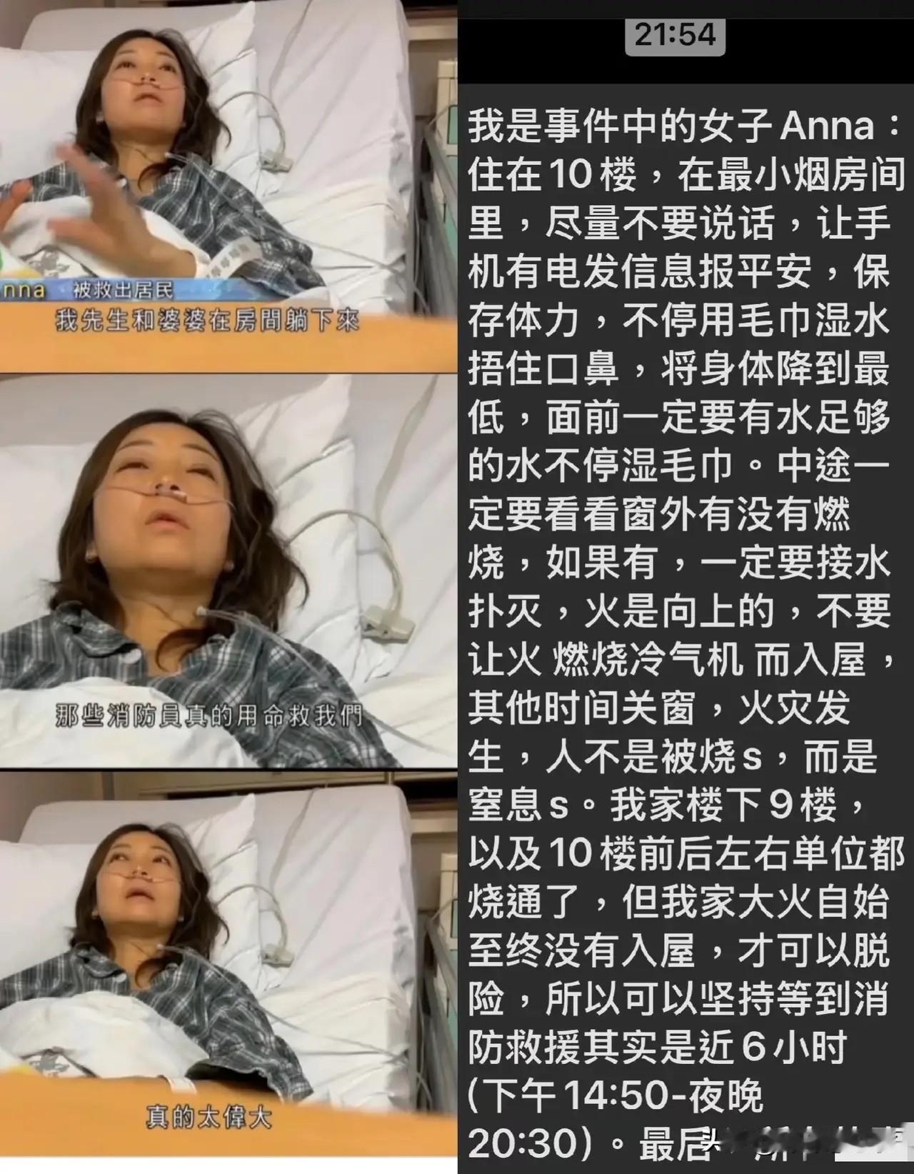 10楼火海困了6小时,她靠这几招活了下来 香港Anna女士家的10楼,楼下和同层早被大火啃得精光,可她家的门愣是没让火苗闯进来。6个小时的煎熬里,她不是在等奇迹,是用知识给自己搭了座救生筏。 她选了烟最淡的厕所,湿毛巾捂紧口鼻,话都不多说一句——知道吗?火灾里八成遇难者不是被烧死的,是被烟呛没的。手机充得满满当当,求救信号没断过;隔会儿就趴窗户看,见火苗头就用水泼回去,门窗关得死紧,人猫着腰贴地面走,因为烟比火更会爬高。 这哪是运气好?是把自救知识刻进了骨子里。平时觉得“火灾离我远”,可真碰上了,多懂一分,就多一分活下来的底气。 Anna的经历就摆在这儿:救命的不是等来的救援,是提前装在脑子里的预案。转发出去,说不定哪天就能帮到谁——毕竟,平安从来不是撞大运,是有备无患。