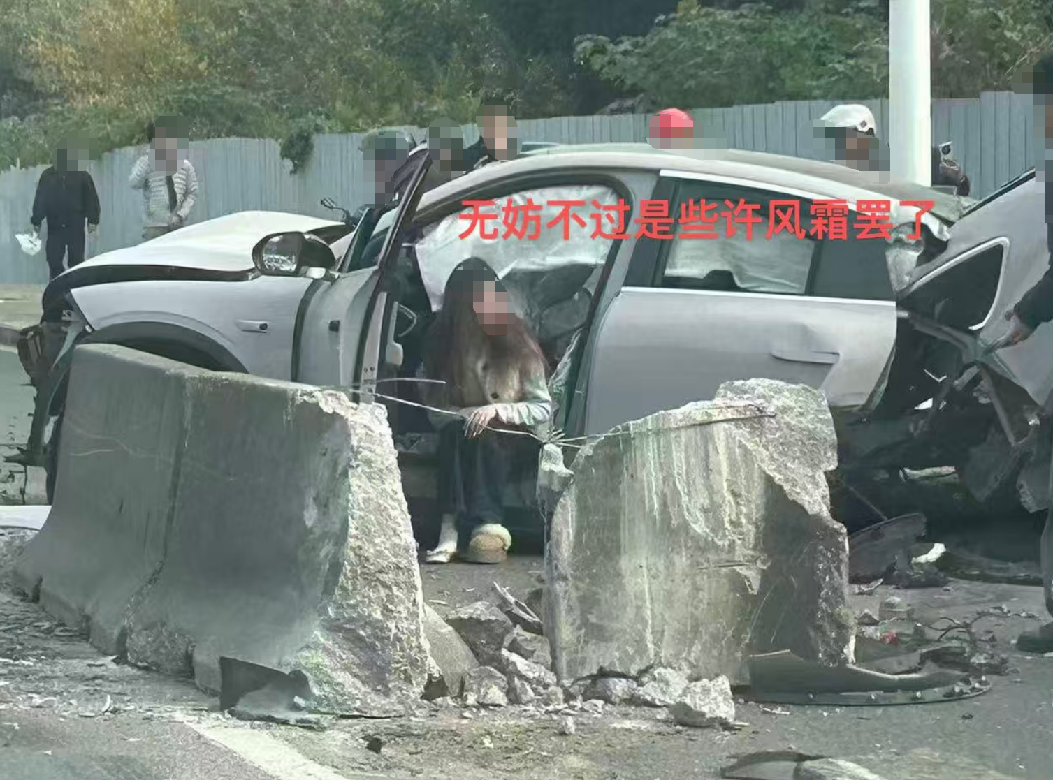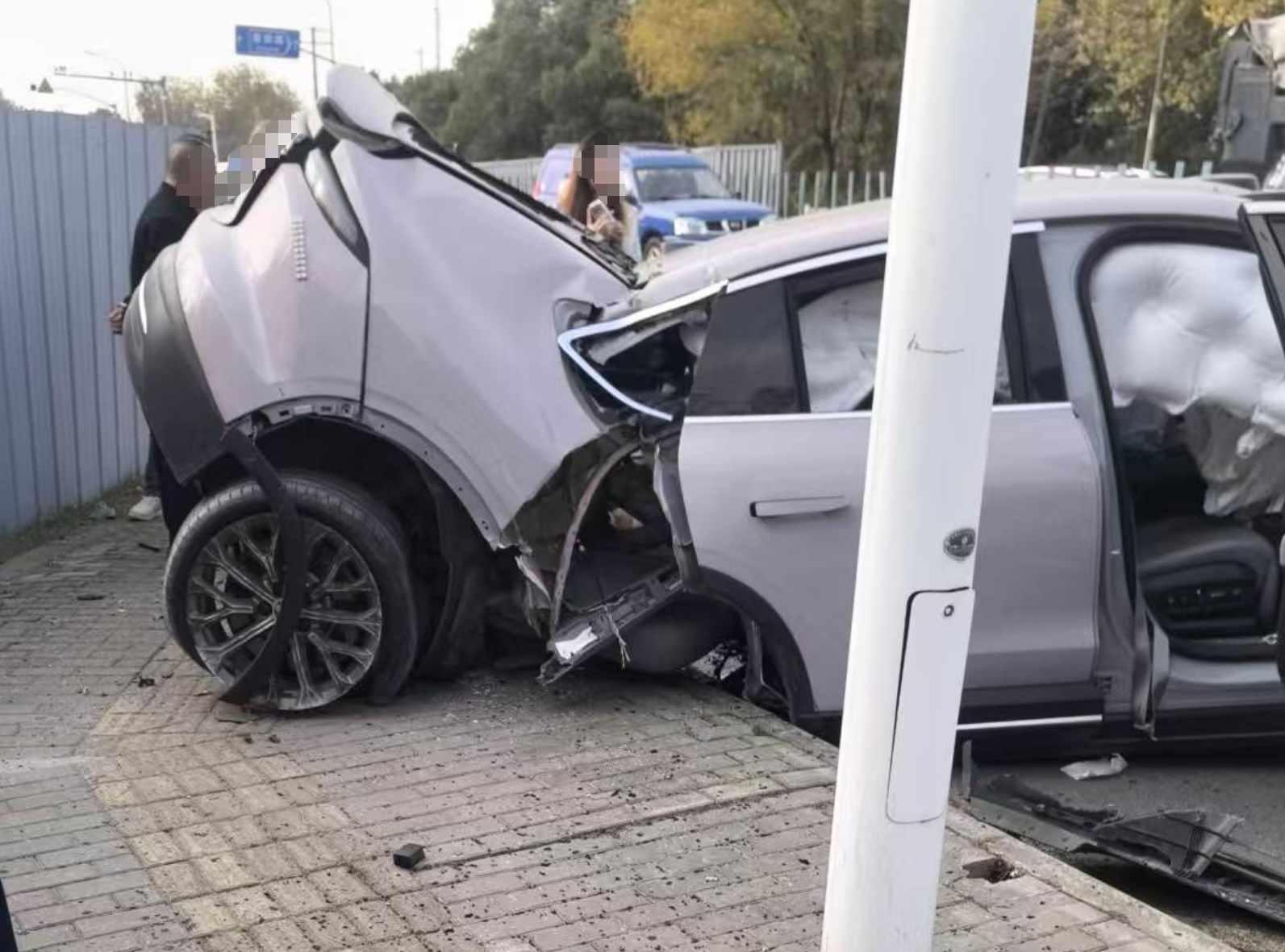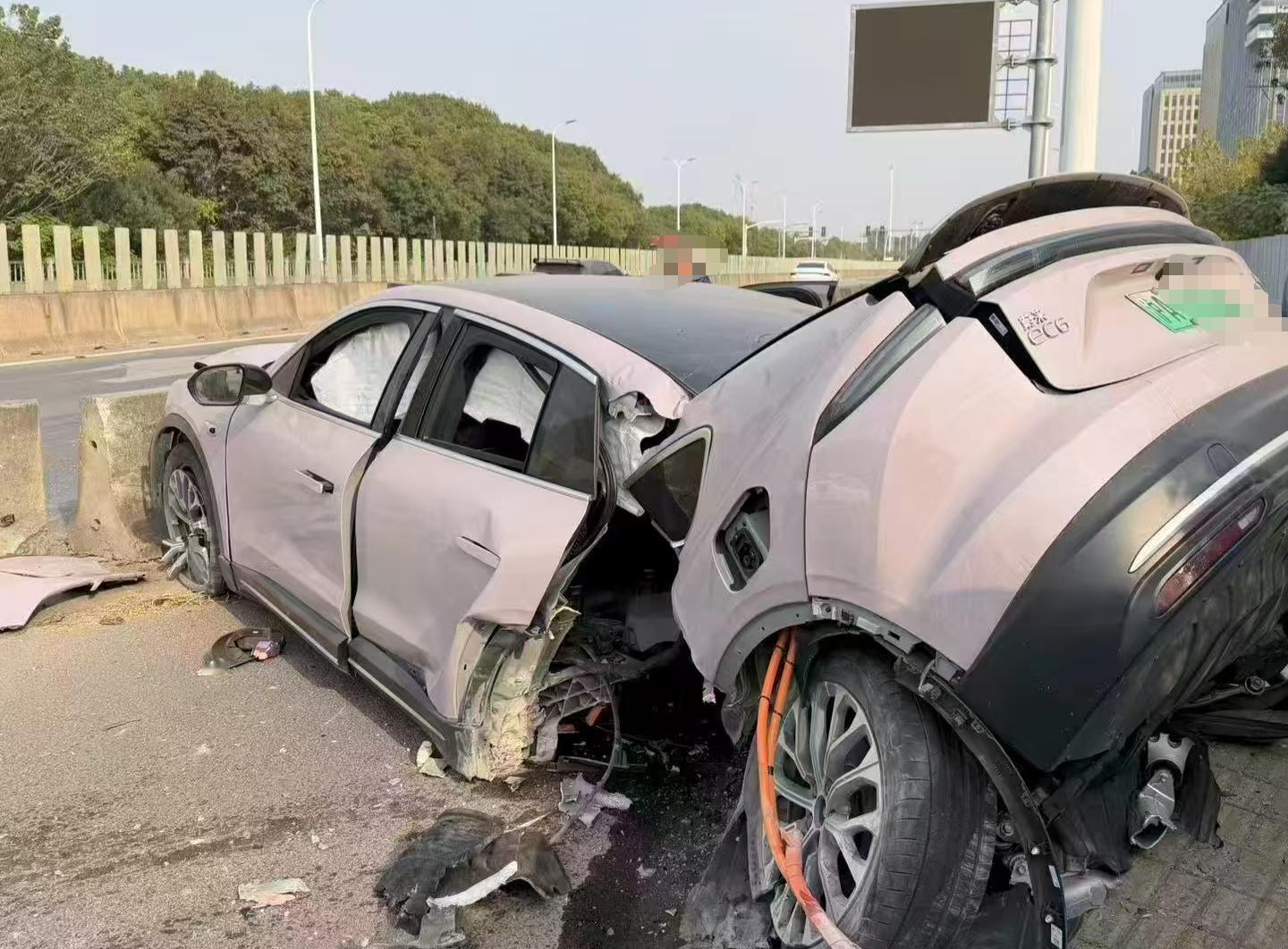 蔚来EC6撞击隔离栏,差点车身截断,看事故情况,盲猜是车速过大,被隔离栏直接拦腰切断。安全气囊全开,车门可以打开,电池也没起火,这个倒是做的挺不错的,图2车主受到很大惊吓,图3车主还能站起来拨打电话。PS:右脚鞋子是掉了,还是卡在了踏板上导致这期事故的原因???蔚来事故