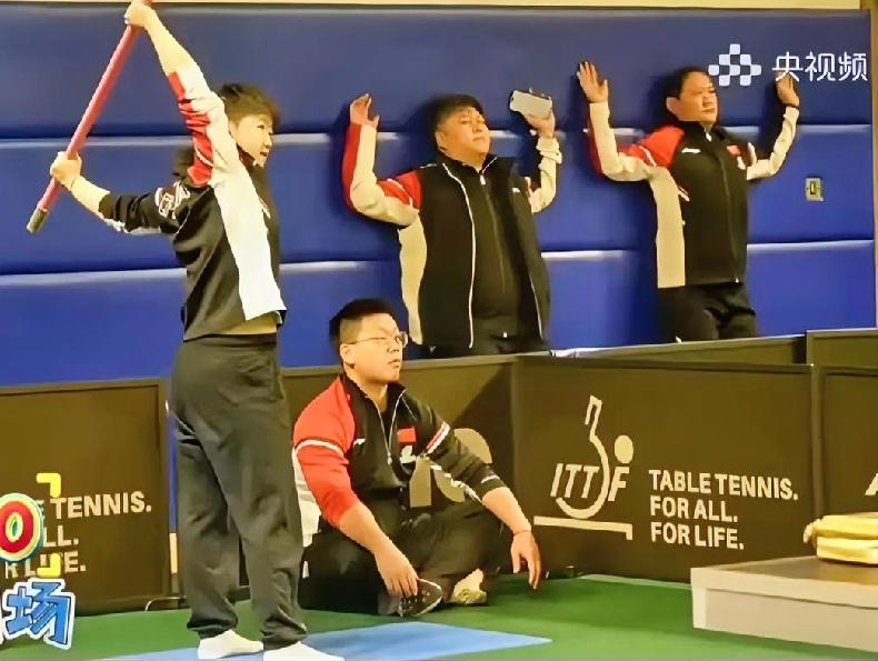有莎莎的地方就是热闹, 这齐刷刷的四个人, 怎么看着像西游记里的师徒四人。 训练场里莎莎又在举着“金箍棒”训练, 旁边的体能和教练也是很配合。 一个坐在地上“打坐”, 两个站在后边靠墙活动背部肌肉, 莎莎举着“金箍棒”挥来挥去。 这个画面特别像取经的师徒四人, 依次是孙悟空、唐僧、猪八戒、沙悟净。 你还别说真是挺形象, 并且唐僧坐在了孙悟空画的圈里。 真的是不服不行, 这届网友里高手如云, 什么都逃不过他们的眼睛, 堪比鹰眼。 (图片源自于网络)