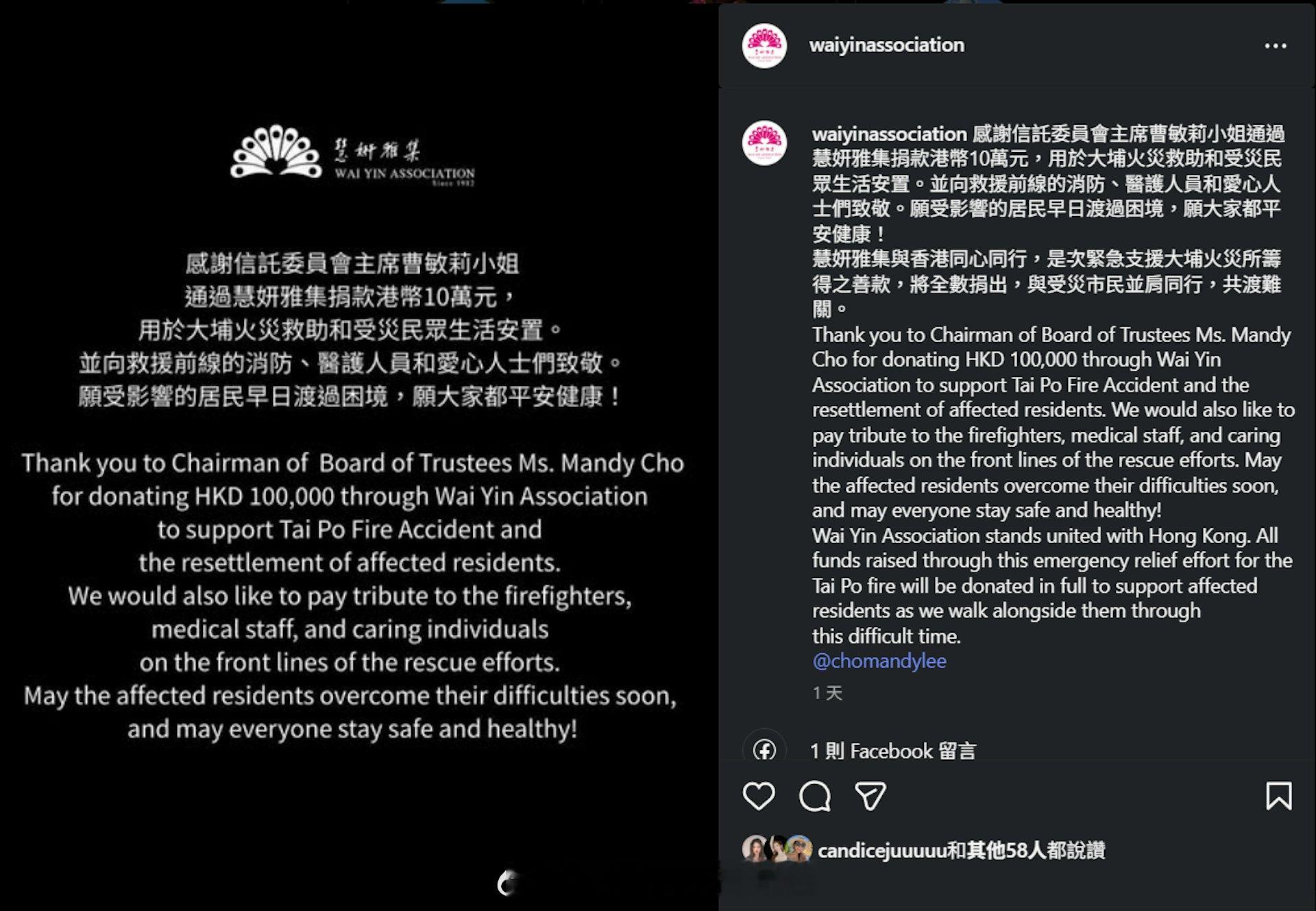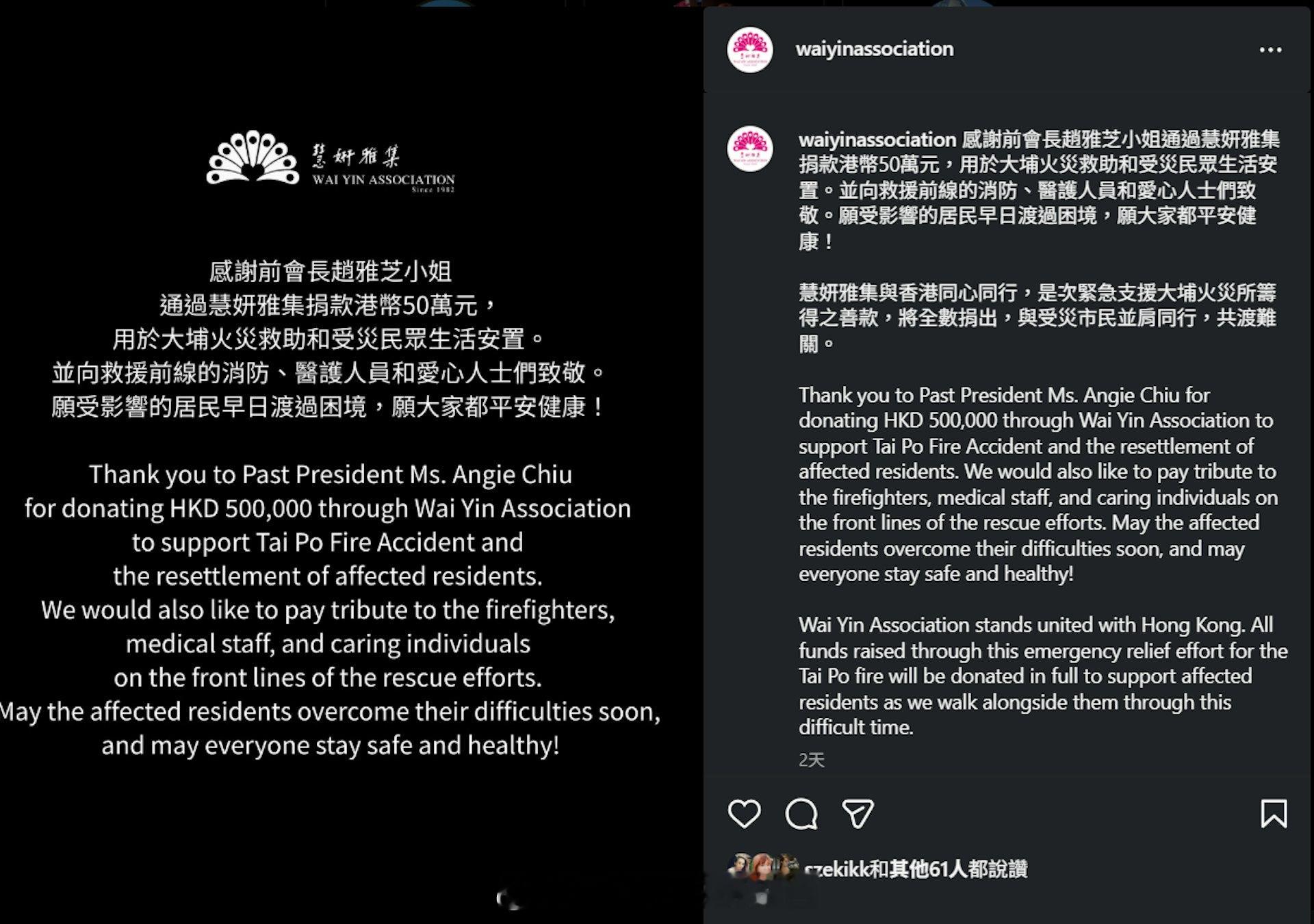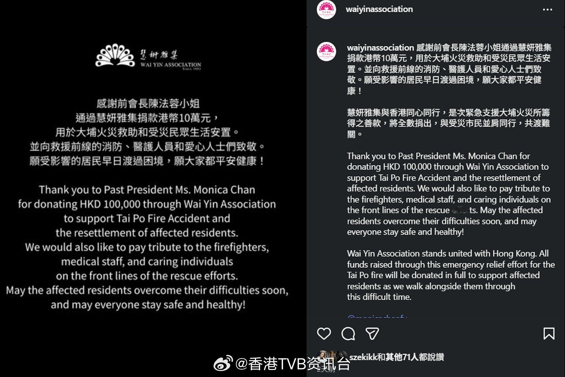 香港01:宏福苑大火丨慧妍雅集成立32年心系救灾 三位善心港姐合共捐70万大埔宏福苑发生五级火,全城悲恸,演艺界人士有钱出钱、有力出力,务求早日帮灾民重建家园。由历届香港小姐成立的"慧妍雅集"亦与香港同心同行,为是次紧急支援大埔火灾筹款,当中三位前港姐赵雅芝、陈法蓉和曹敏莉合共捐出70万港元。慧妍雅集的IG专页帖出感谢文,前会长赵雅芝捐款港币50万元,另一位前会长陈法蓉和信托委员会主席曹敏莉则各捐款港币10万元,同用于大埔火灾救助和受灾民众生活安置。慧妍雅集帖文表示向救援前线的消防、医护人员和爱心人士们致敬。愿受影响的居民早日渡过困境,愿大家都平安健康!而是次紧急支援大埔火灾所筹得之善款,将全数捐出,与受灾市民并肩同行,共渡难关。据慧妍雅集自我介绍,1980年,多位历届香港小姐得奖及参赛佳丽聚在一起,谈及她们希望能为香港尽一分力的梦想,以及商讨如何协助弱势社群,让他们生活得以改善。梦想终于在1982年实现──"慧妍会"诞生了。及至1993年,更成为香港政府认可的注册慈善机构──"慧妍雅集",各会员会不定时参与不同的社会公益活动。