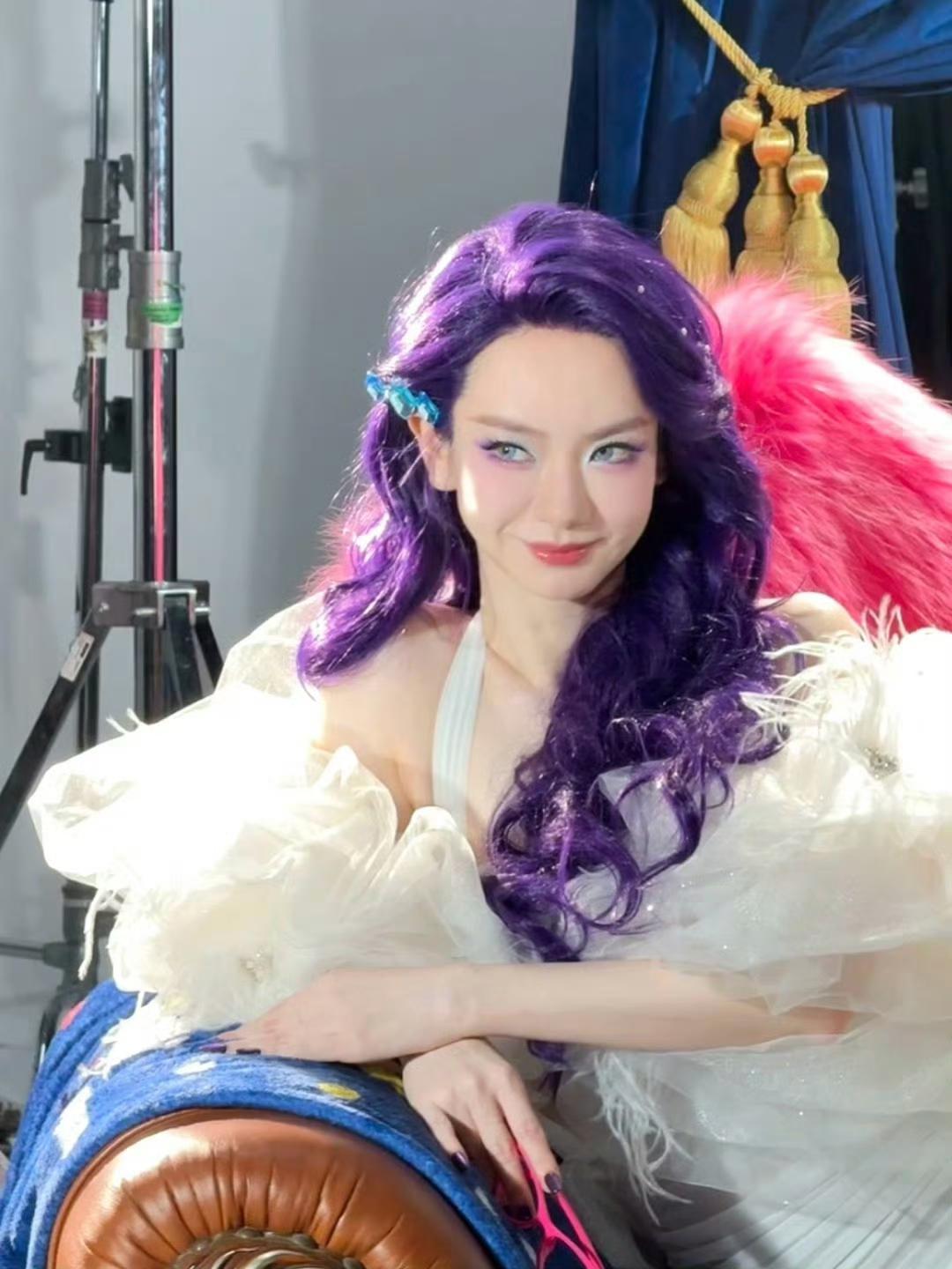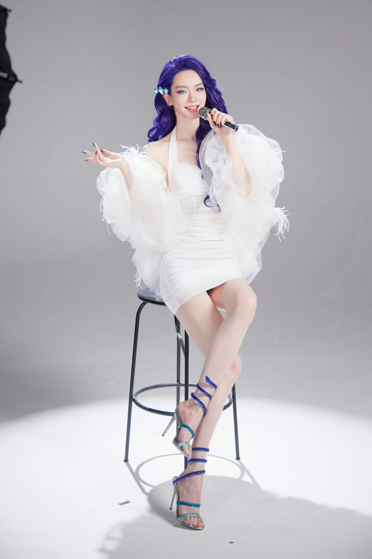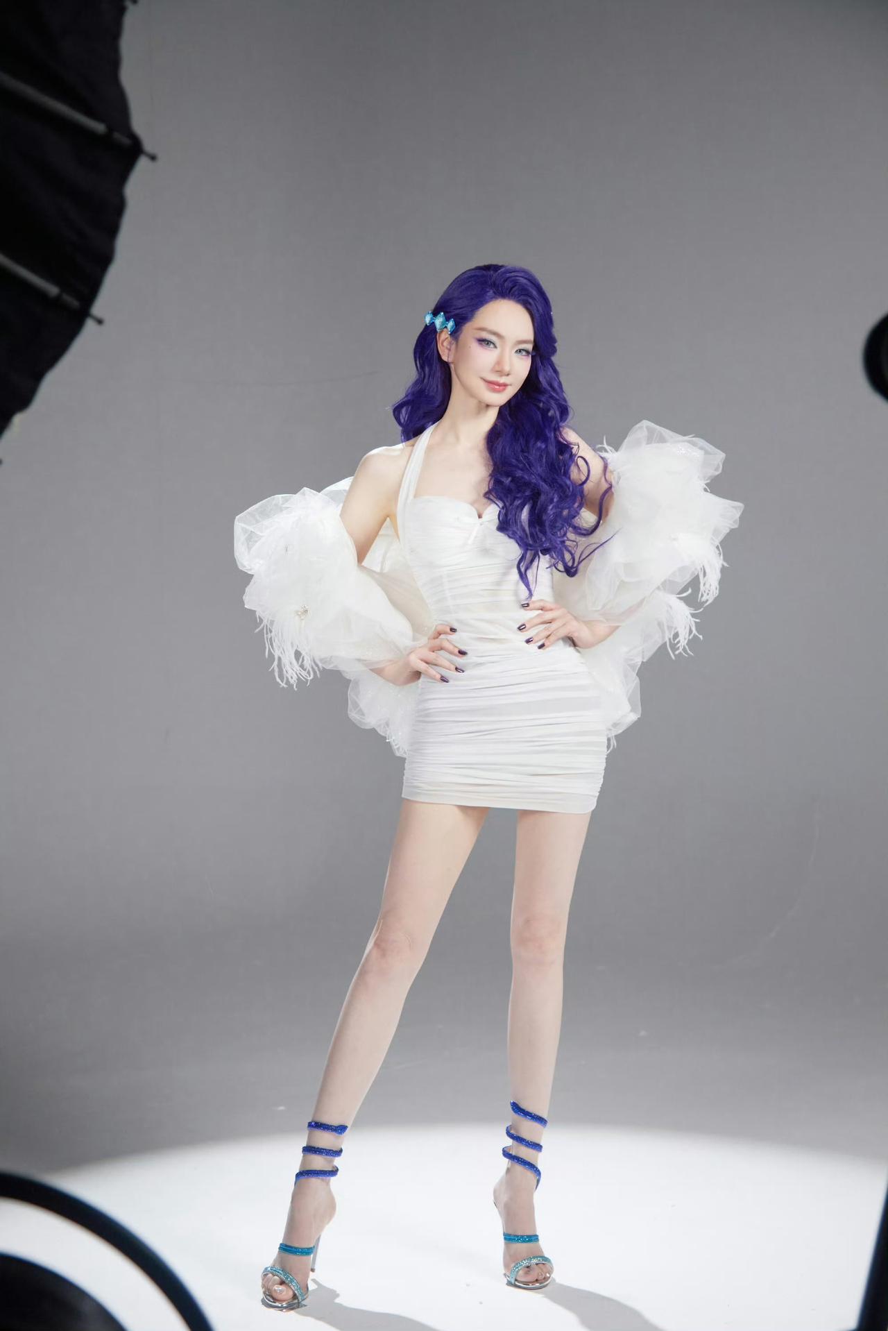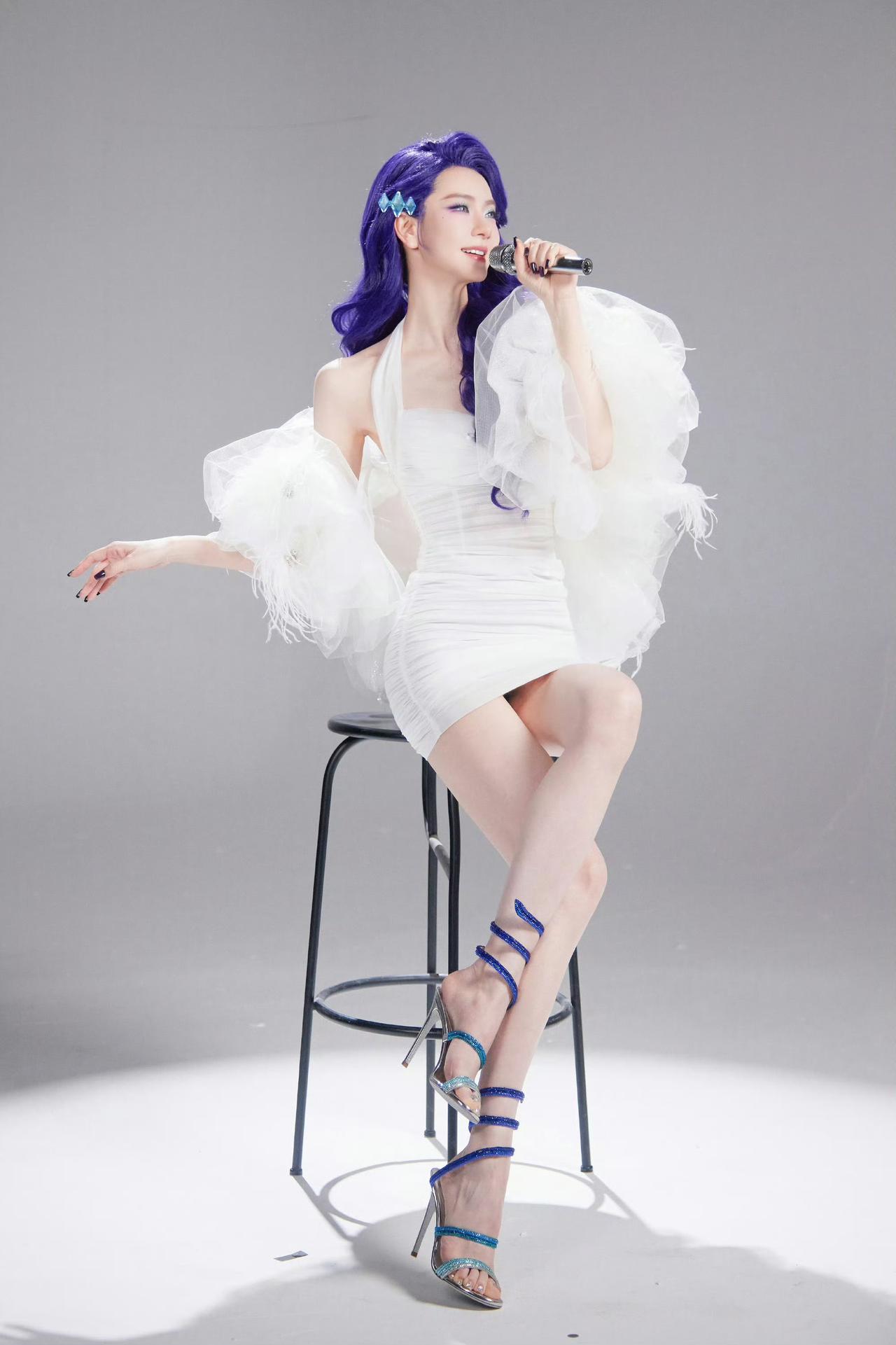 梦幻紫色波浪卷发,白色羽毛连衣裙,蓝色高跟鞋,甜美与时尚并存!不一样的戚薇!!!!