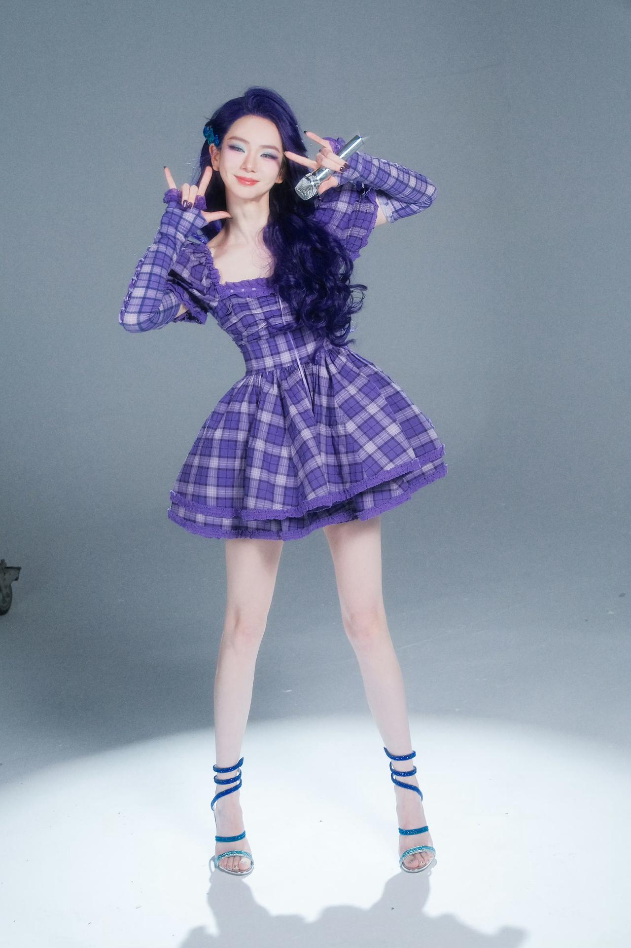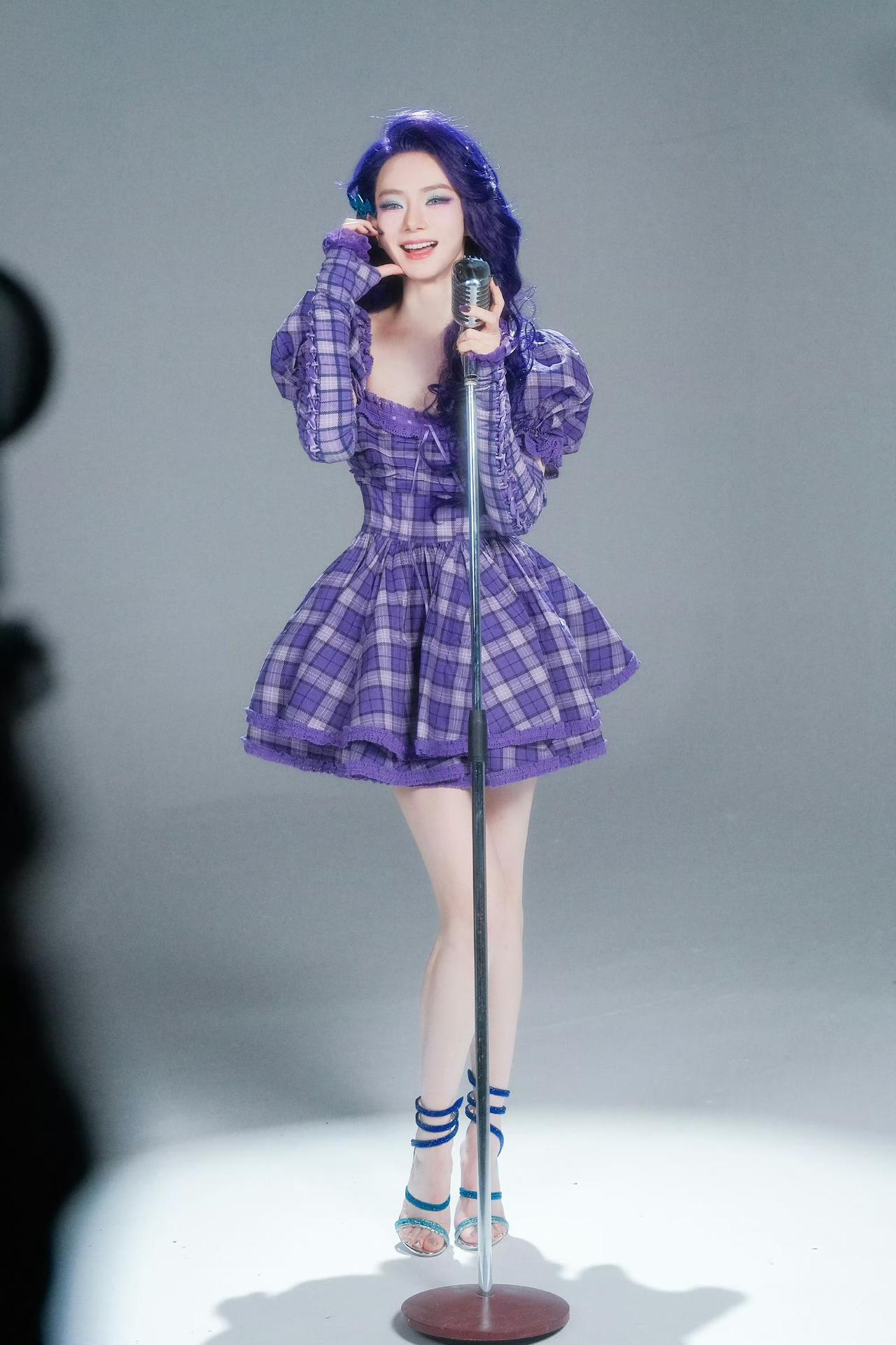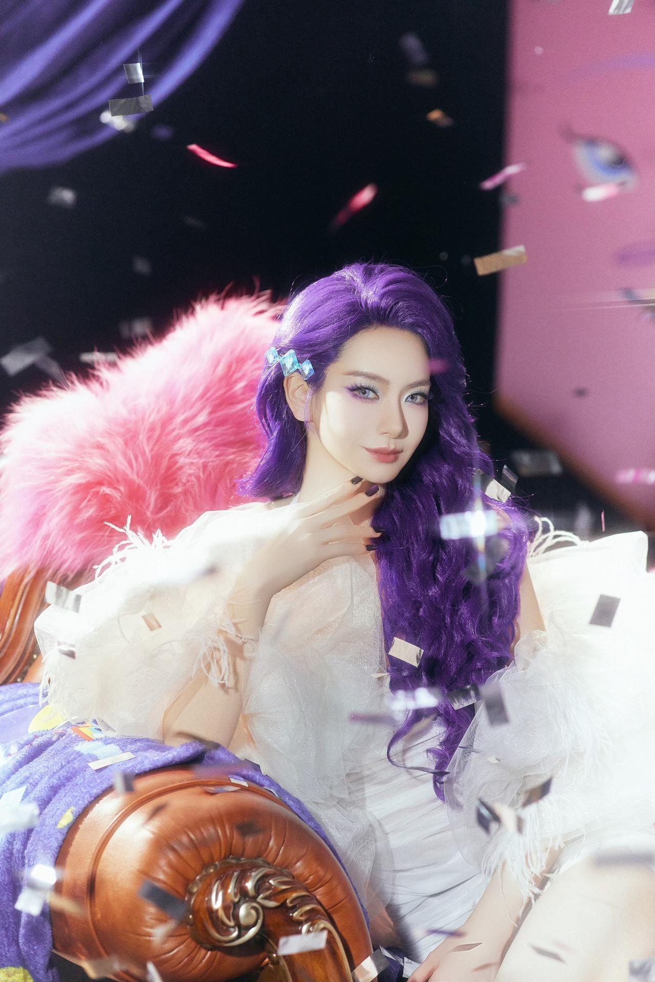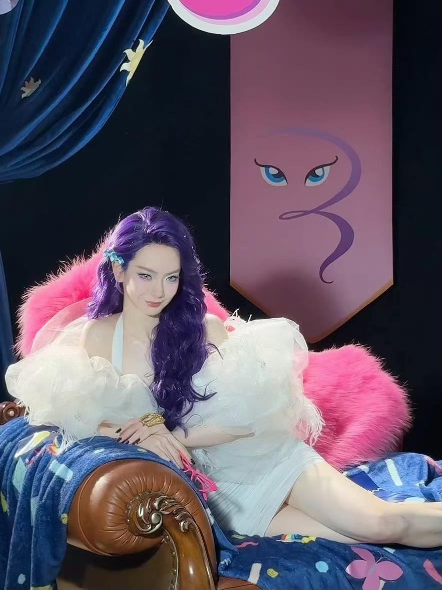梦幻紫色波浪卷发,白色羽毛连衣裙,蓝色高跟鞋,甜美与时尚并存!不一样的戚薇!!!!