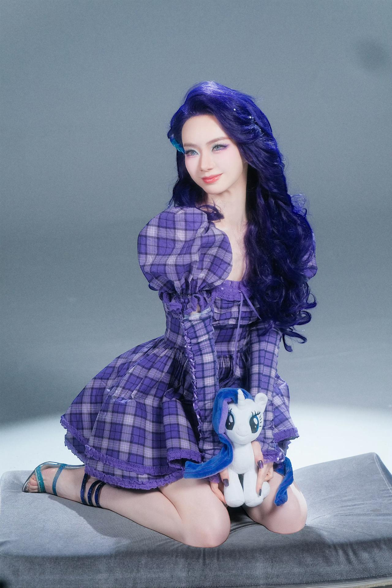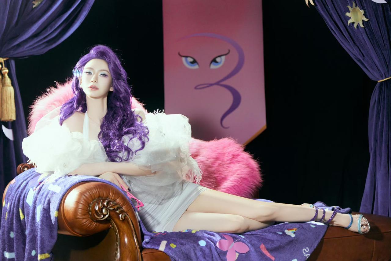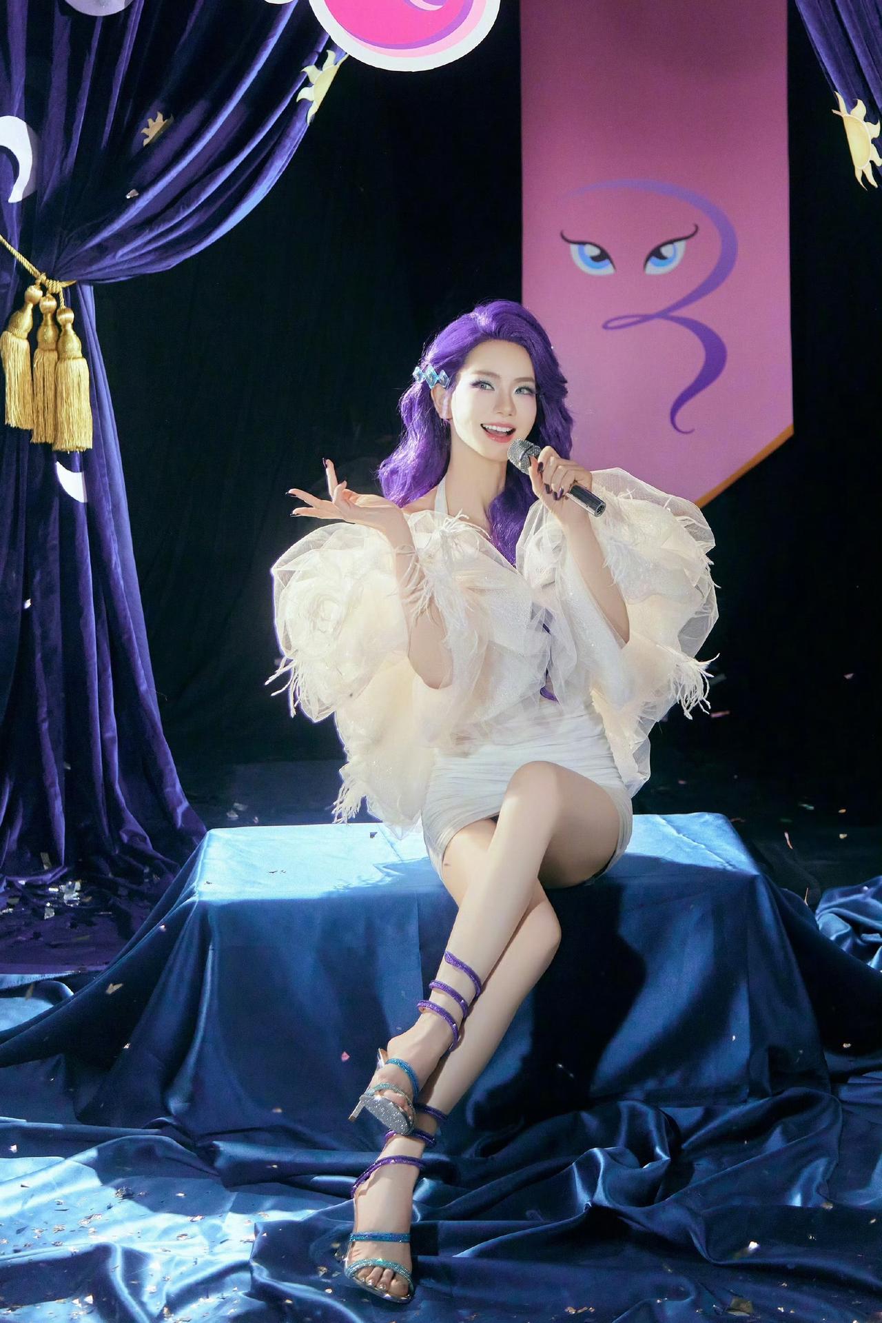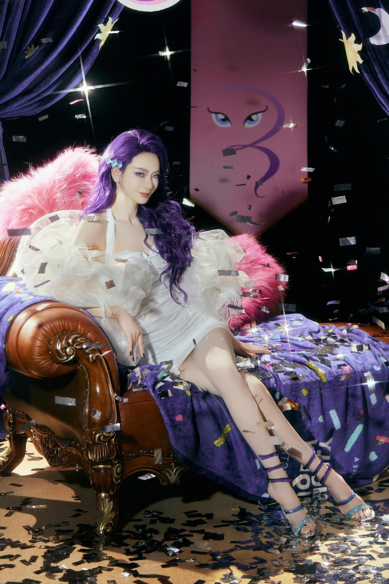 梦幻紫色波浪卷发,白色羽毛连衣裙,蓝色高跟鞋,甜美与时尚并存!不一样的戚薇!!!!