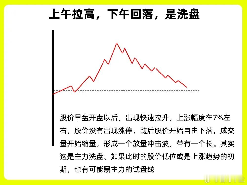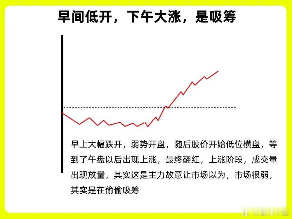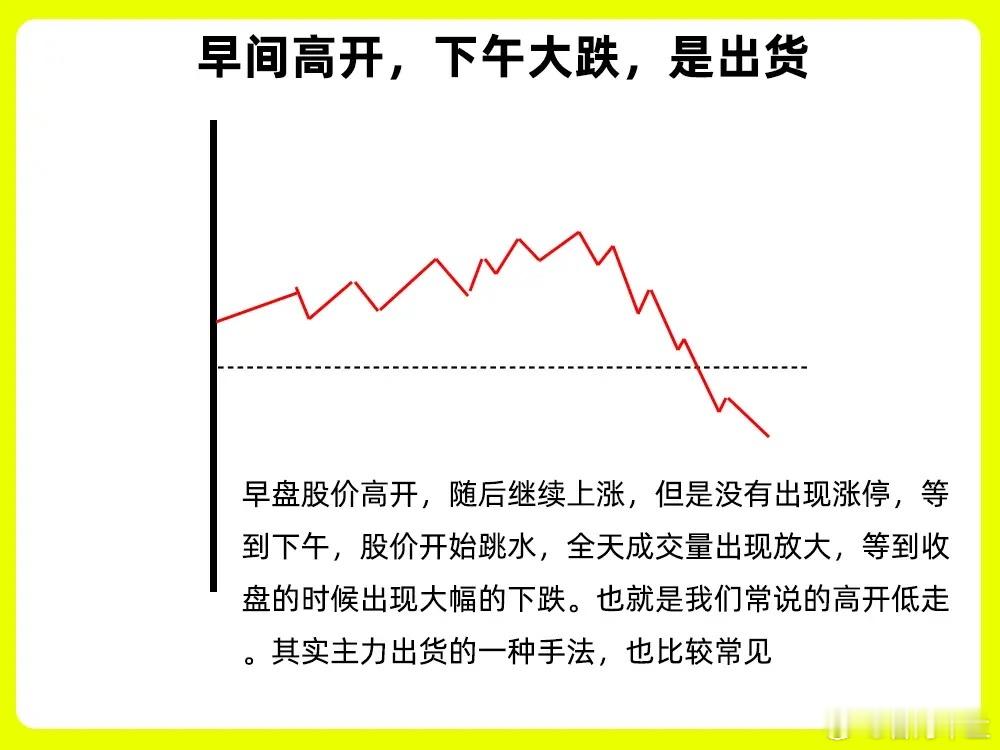 一定要牢记,这7句炒股口诀,我们在看盘的时候,困扰散户的大问题就是不会判断主力的意图。今天我一次分享七种形态,轻松判断主力意图,新手小白也能轻松看懂,所以就不要错过,一定要认真看完一、早间低开,下午大涨,是吸筹早上大幅跌开,弱势开盘,随后股价开始低位横盘,等到了午盘以后出现上涨,最终翻红,上涨阶段,成交量出现放量,其实这是主力故意让市场以为,市场很弱,其实是在偷偷吸筹。二、早间高开,下午大跌,是出货早盘股价高开,随后继续上涨,但是没有出现涨停,等到下午,股价开始跳水,全天成交量出现放大,等到收盘的时候出现大幅的下跌。也就是我们常说的高开低走。其实主力出货的一种手法,也比较常见三、上午拉高,下午回落,是洗盘股价早盘开盘以后,出现快速拉升,上涨幅度在7%左右,股价没有出现涨停,随后股价开始自由下落,成交量开始缩量,形成一个放量冲击波,带有一个长。其实这是主力洗盘、如果此时的股价低位或是上涨趋势的初期,也有可能黑主力的试盘线四、股价低位,频繁放量,是建仓股价长时间的在低位横盘,成交量出现频繁的放量,但是股价的波动却不大,形成一个价稳量增的一个形态。说明此时的市场活跃开始变高,有主力在开始偷偷建仓,这种建仓周期一般会比较长。五、股价高位,频繁放量,是出货股价经过长时间的上涨以后,处于一个阶段性的高位,成交量出现频繁的放量,尤其是已经出现放量滞涨的走势,说明此时的多方力量开始变弱,成交量越大,说明此时的多空分歧开始变大,主力已经开始逐步出货了六、低位小涨小跌,突然放量长阳是启动股价长时间的在低位,小涨小跌,都是小阴线小阳线或是十字星,处于一个窄幅震荡的一个阶段,股价突然出现放量,走势大阳线线,说明有资金在大量介入,成交量出现放大,一般是主力想快速脱离自己的成本区间。七、高位小涨小跌,突然放量长阴是出货股价经过长时间的上涨以后,在阶段性的高位,股价开始横盘震荡,每天都是小涨小跌,高位横盘,突然股价开始大幅下跌,形成长阴线,同时成交量开始放大,说明这是主力在快速离场。如果此时的阴线一次跌破五日、十日和二十日均线,就形成断头铡刀形态。好了!以上就是主力意图的七种形态走势图,下方我配了案例图,记得文章和案例结合起来看,希望对大家有启发和帮助,也是最为基础的内容,一定吃透。我们下期内容再见