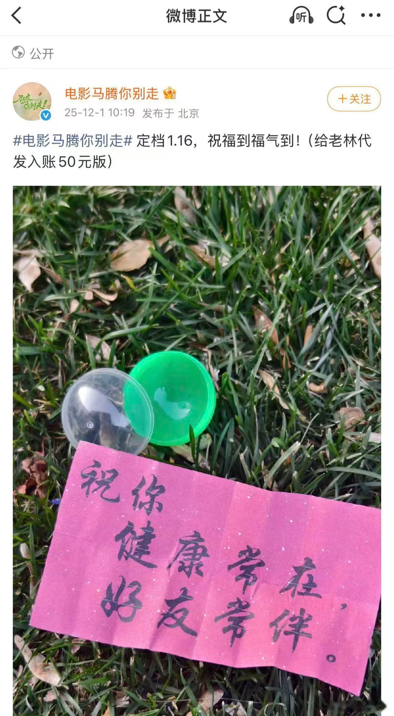 电影马腾你别走送的祝福我都笑纳了 《马腾你别走》的预告满是惊喜,抽象又荒诞的清爽喜剧感扑面而来,戏里的趣味设定和戏外的祝福互动一样吸引人。主创们一抽一个新祝福,诚意满满又笑点十足,再加上李幼斌和林更新的互损忘年交组合,2026开年第一部电影,没理由不冲这场充满善意的欢乐旅程。