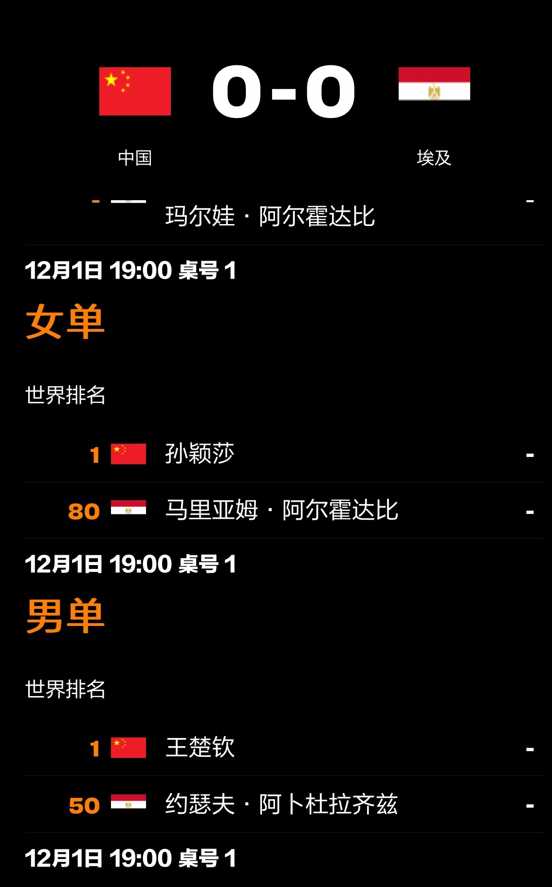 孙颖莎 王楚钦 2025成都混团世界杯 20251201|混团对阵12月1日 19:00T1 中国VS埃及第二盘女单:孙颖莎VS马里亚姆 • 阿尔霍达比第三盘男单:王楚钦VS 约瑟夫• 阿卜杜拉齐兹孙颖莎王楚钦单打加油加油加油加油