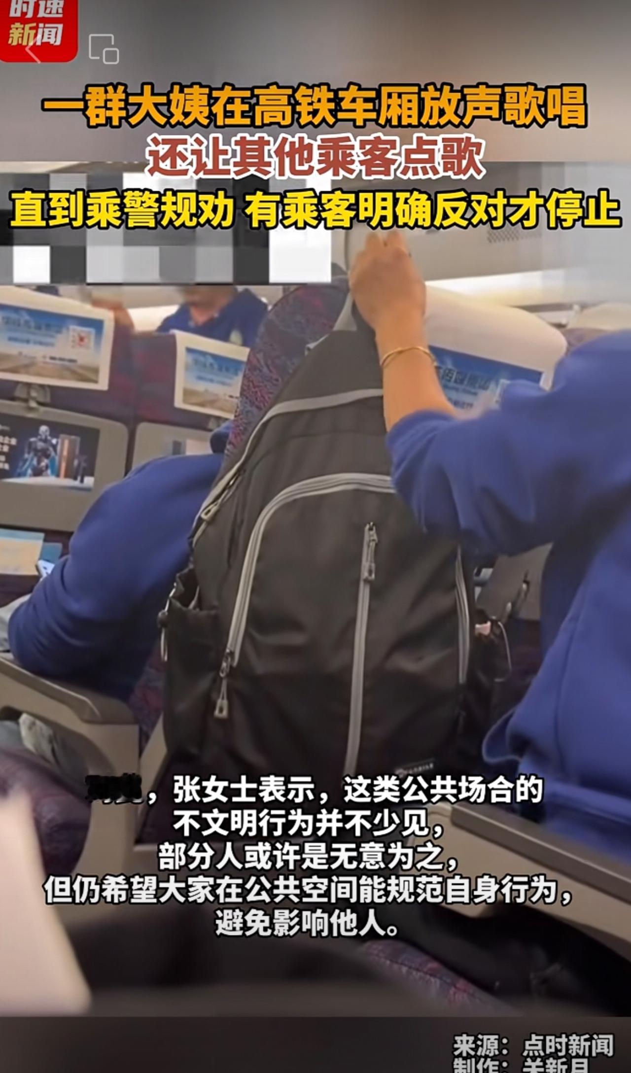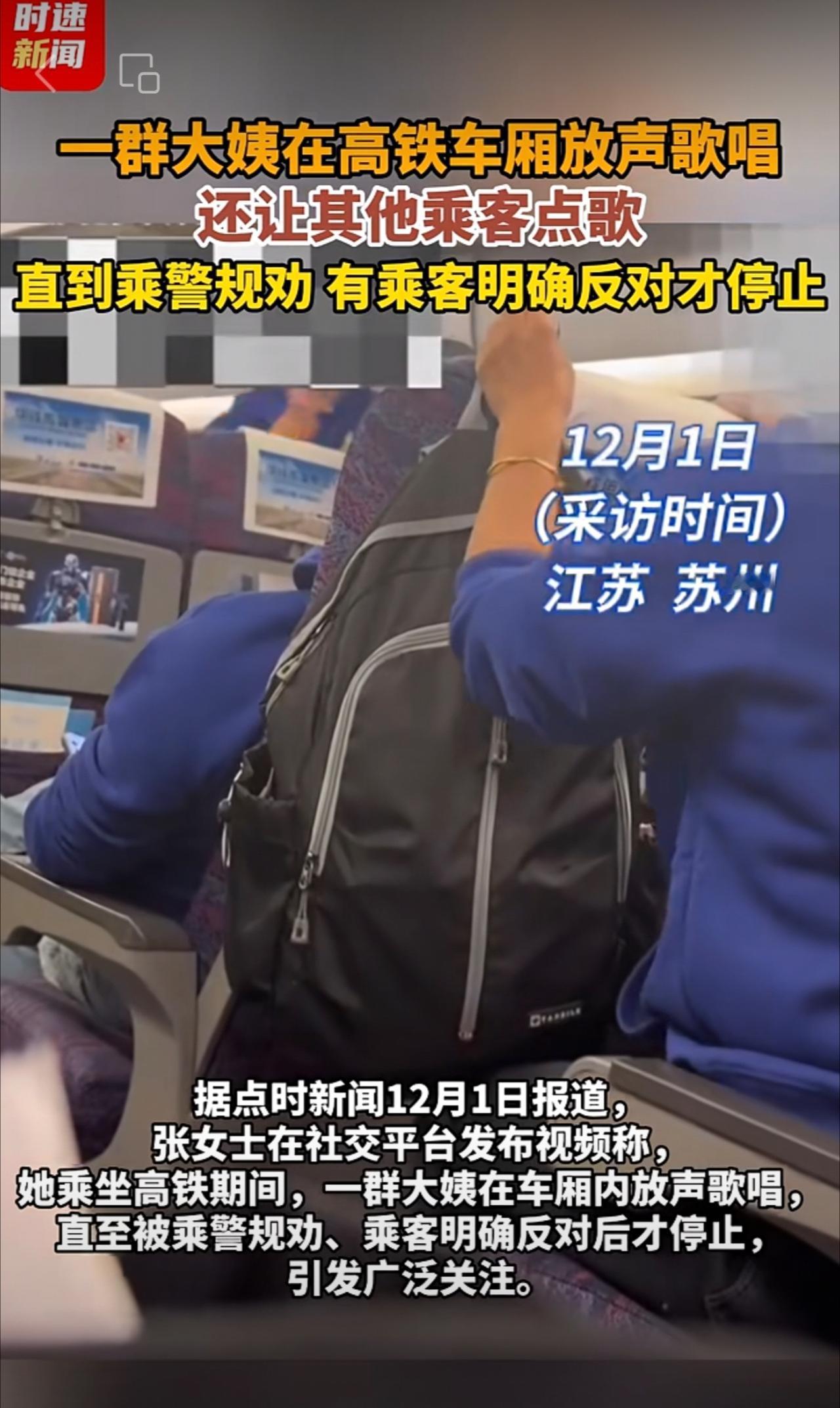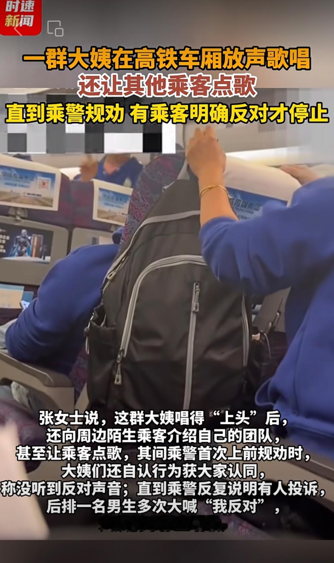一群大姨在高铁车厢放声歌唱,还让其他乘客点歌,直到乘警规劝、有乘客明确反对才停止。
