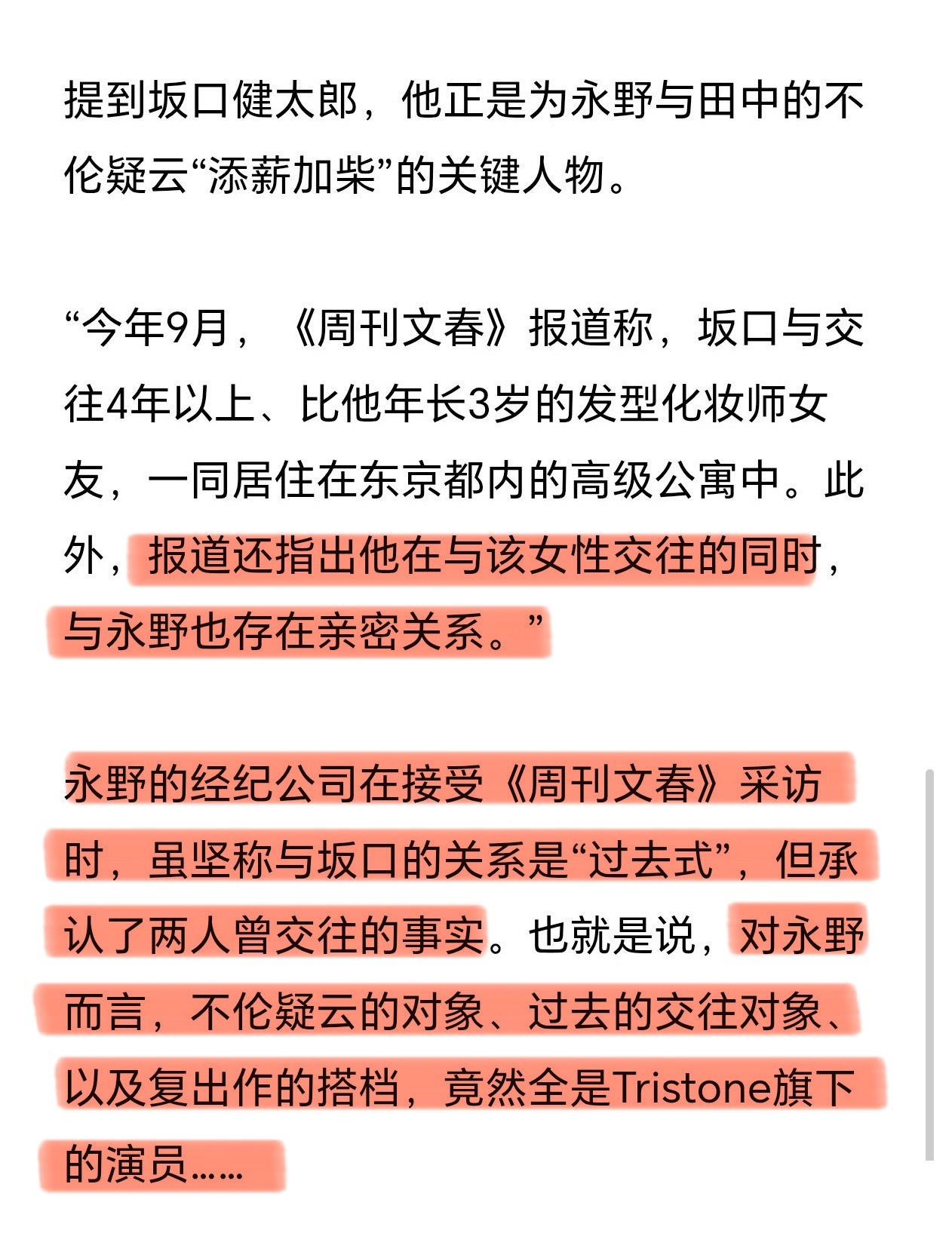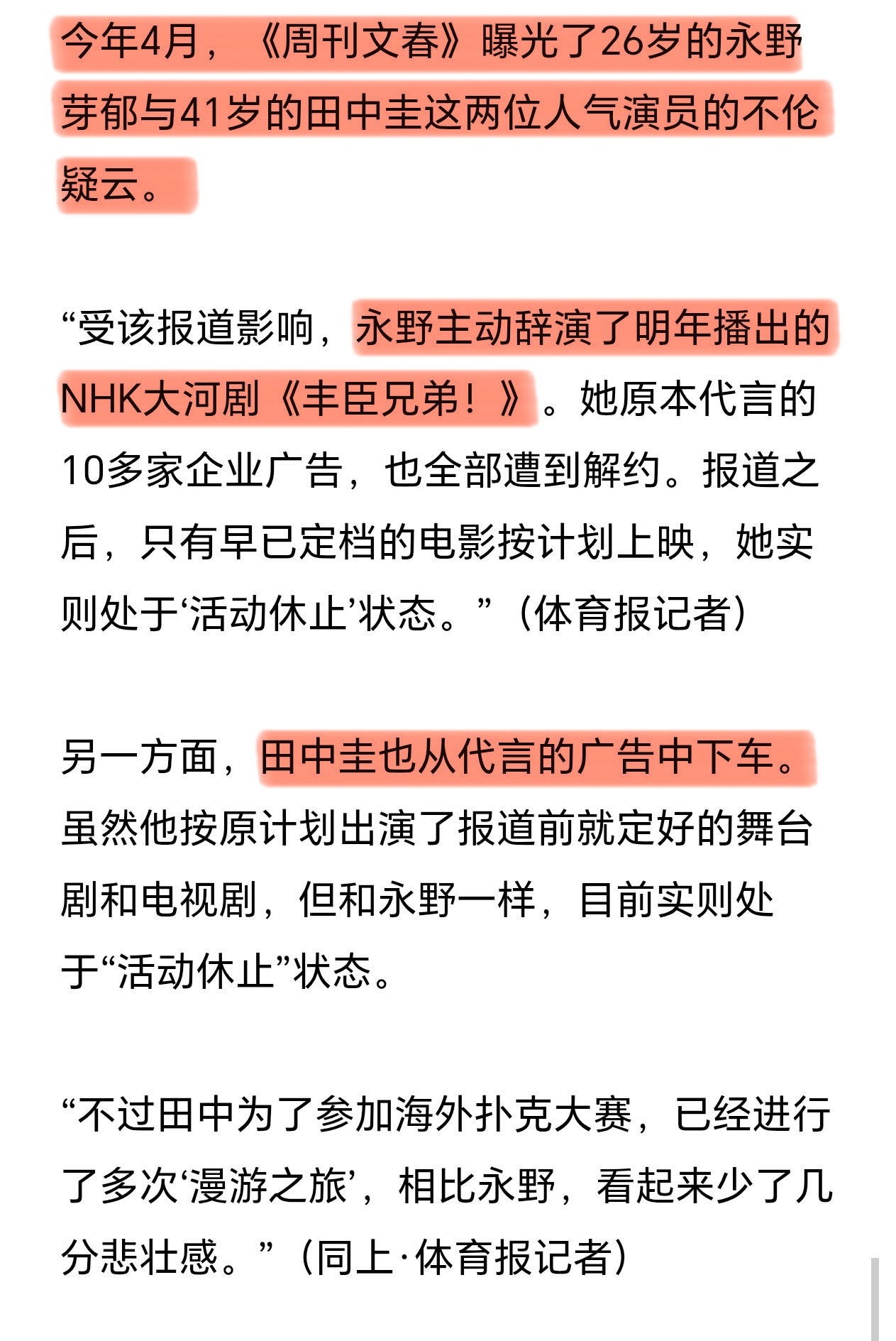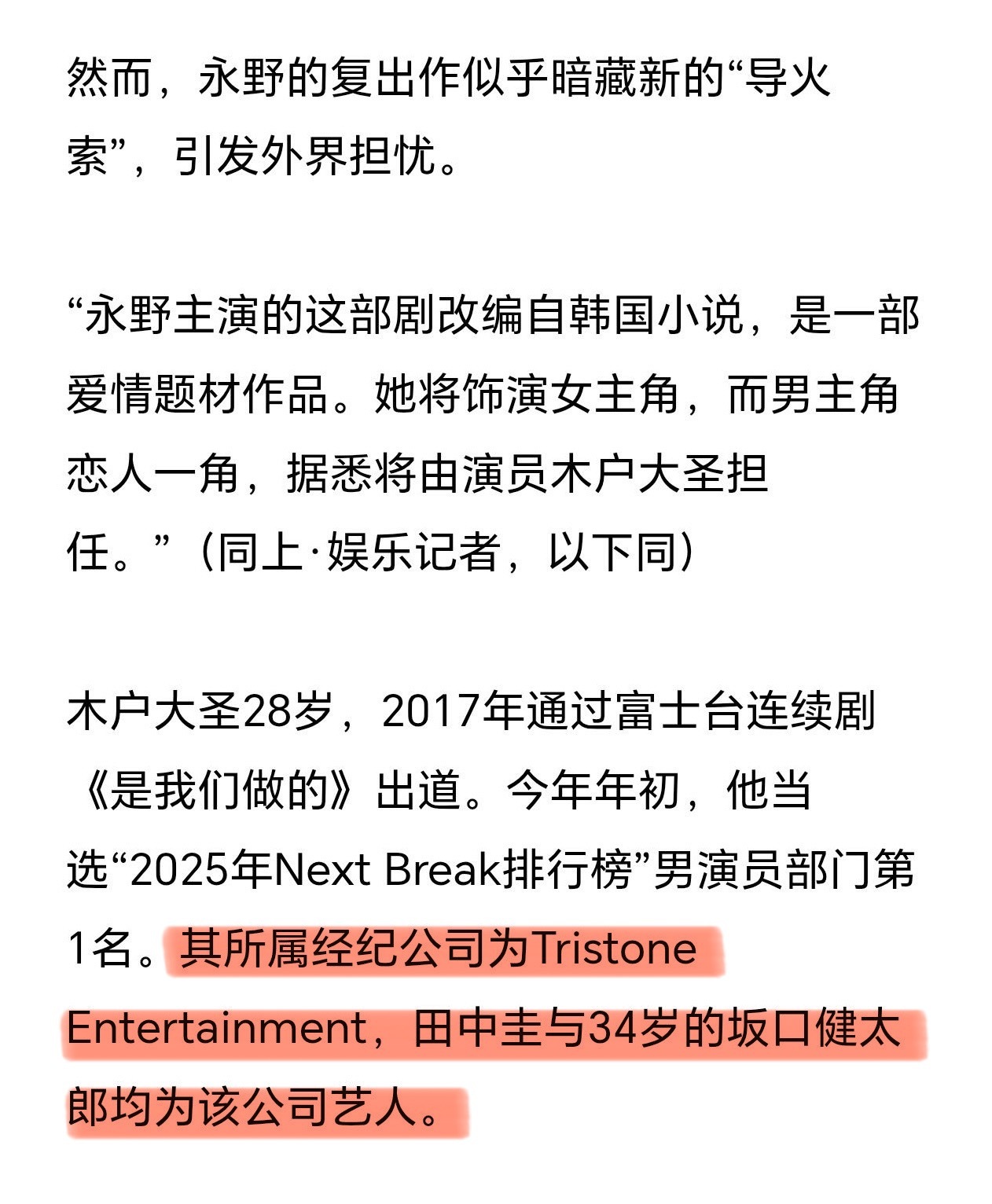 好地狱……永野芽郁复出作男主是田中圭同事今年4月,文春曝出永野芽郁与田中圭不伦恋,受此影响永野芽郁辞演了大河剧,广告代言也遭到解约。目前过去8个月,永野的网飞剧已于本月开机。“由于Netflix早在不伦疑云曝光前就向她发出了邀约,所以企划得以按原计划推进。”新剧男主木户大圣与田中圭、坂口健太郎(今年刚被曝是永野芽郁前任)是同一家公司的演员永野芽郁新剧已开机永野芽郁复出作男主是田中圭同事