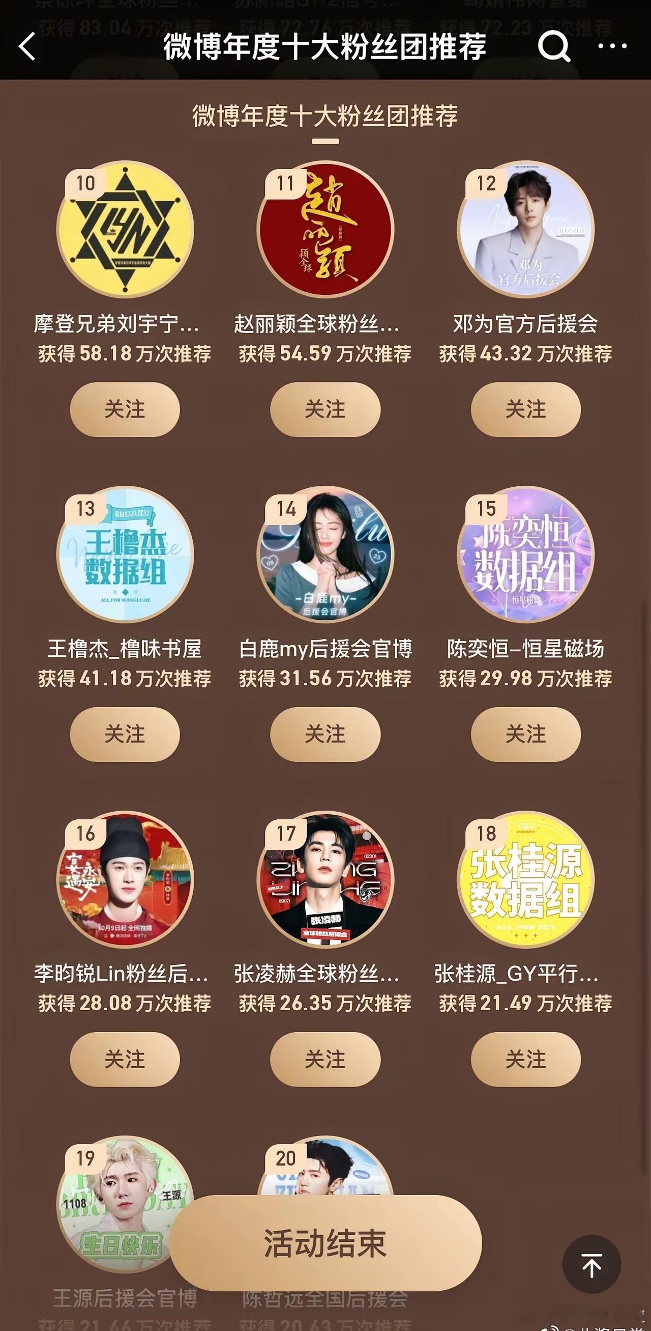 微博年度十大粉丝团第一名第二名梓渝,第三名檀健次四到十:鹿晗、魏大勋、杨紫、蔡徐坤、苏新皓、鞠婧祎、刘宇宁