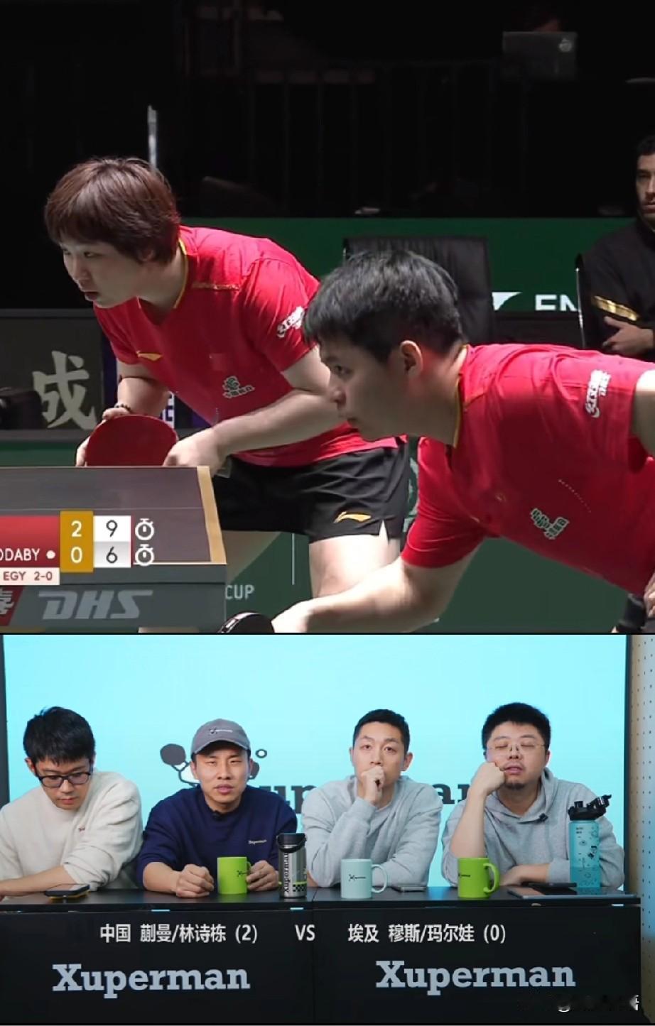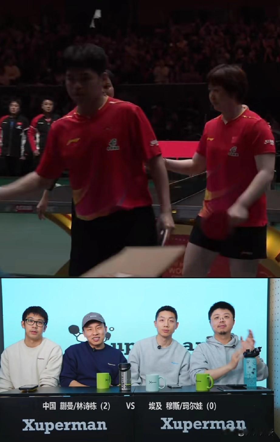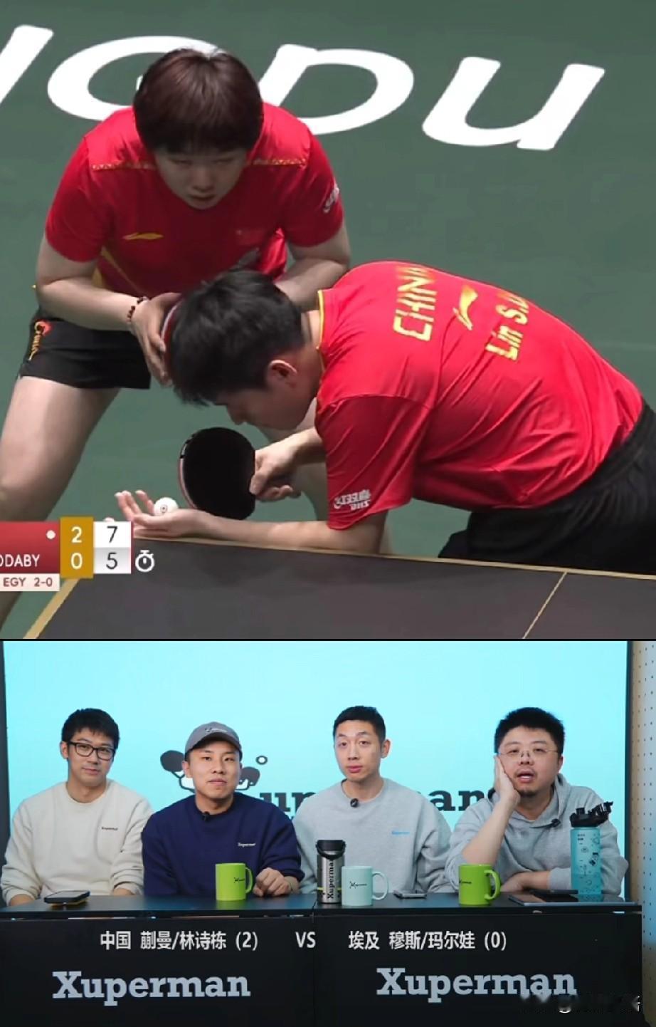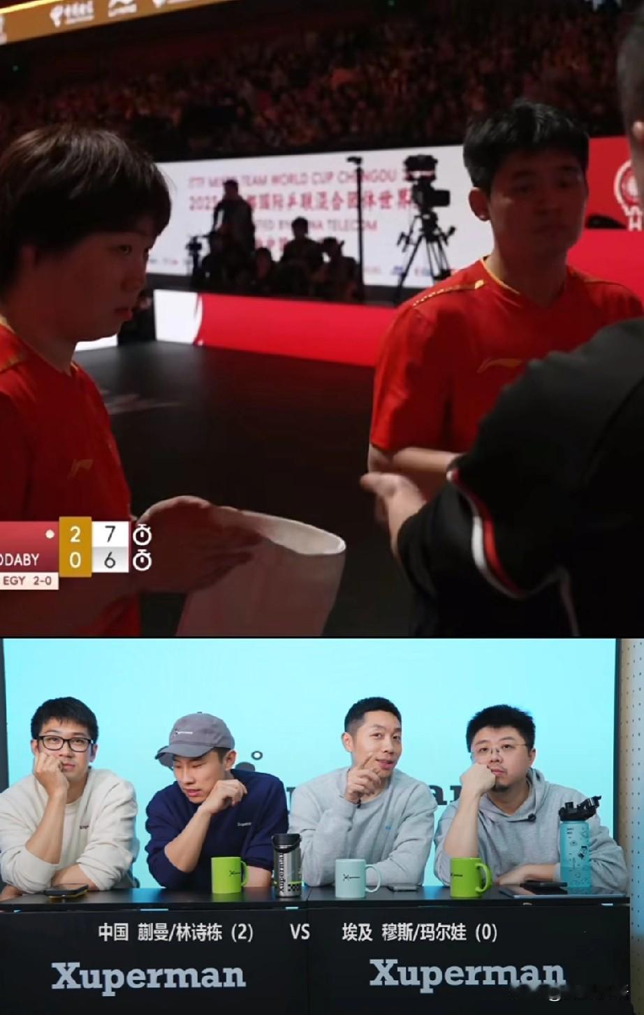 许昕的直播间里太欢乐了。 今天许昕的看球搭子是徐志胜和呼兰啊,乒乓球脱口秀我们也是看上了,刚刚看他们看林诗栋/蒯曼的混双比赛,太欢乐了,林诗栋蒯曼是3-0赢了埃及队,为中国队先拿下三分。 第三局比赛的时候,蒯曼/林诗栋比分7:5领先时,徐志胜说要是对面把比分追平了,他就把桌子上的杯子吃了,干吃啊,刚说完这一句,埃及队就追了一分,把比分追到6:7,这时候徐志胜有点紧张了。不过关键时刻,中国队叫了暂停,许昕今天才看中国队的比赛,不知道场外教练是谁,后来看到是王皓和马哥,然后徐志胜说他们不可能追平的。 暂停回来后,林诗栋蒯曼是连拿2分,比分来到9:6,这时候徐志胜松了一口气,终于不用吃杯子了,哈哈!看着徐志胜就很有喜感呢,许昕的梗也很多,他们在一块儿是真欢乐,看到许昕直播间里人也很多。