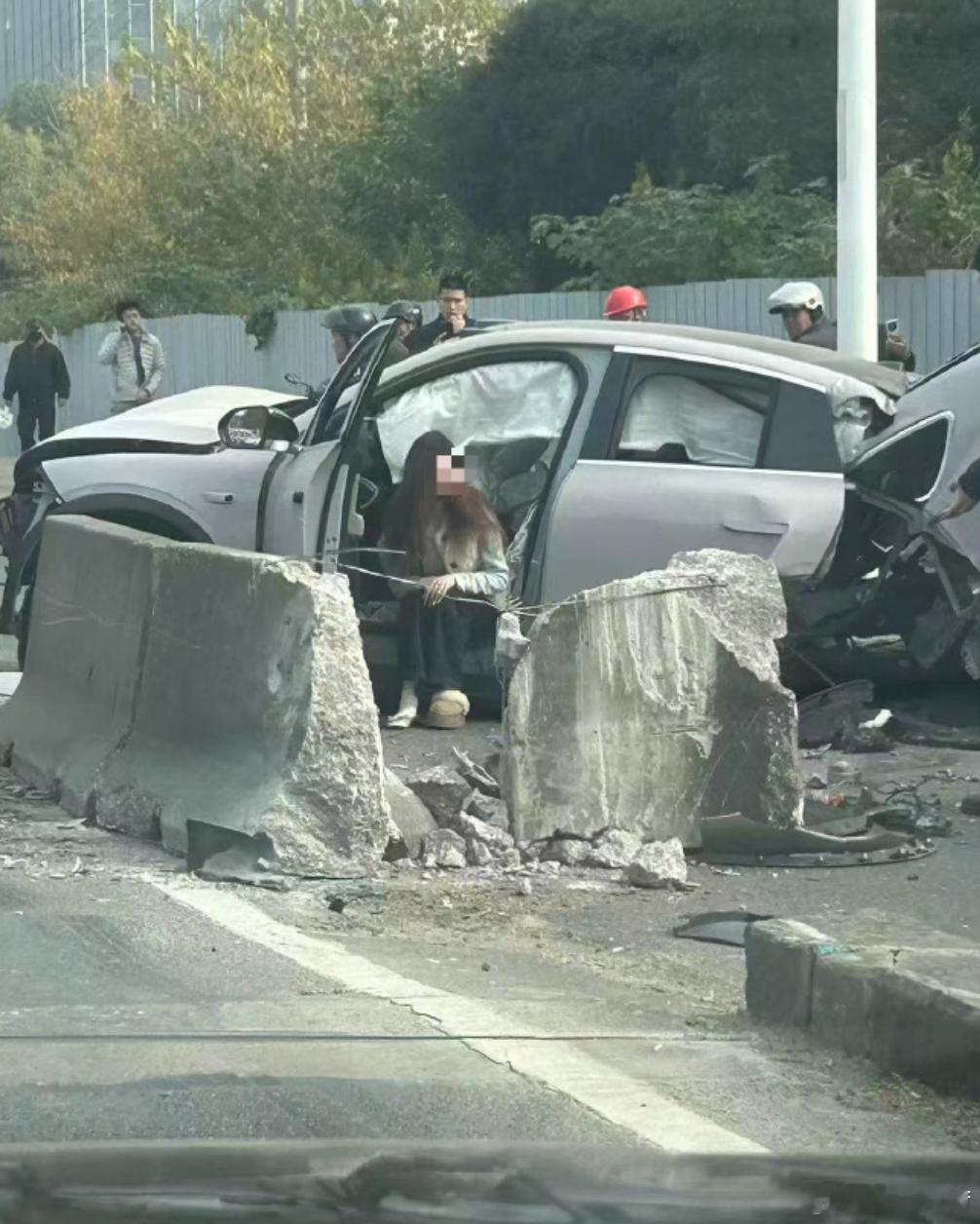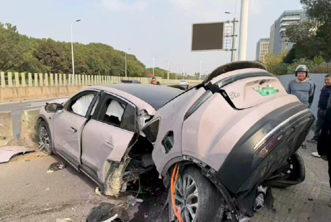 一般来说,车撞成这样,无一例外都是超速。看看 图2 的水泥隔离墩,力度小不了。八成是因为前面撞了东西、乱打方向盘,车辆旋转碰到水泥墩。车辆的速度过快后,我们常听到的C-NCAP IIHS等等评价,就都不适用了。决定开车安全的,还是握着方向盘的人。交通事故
