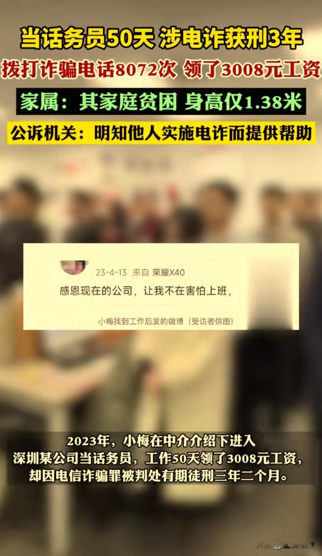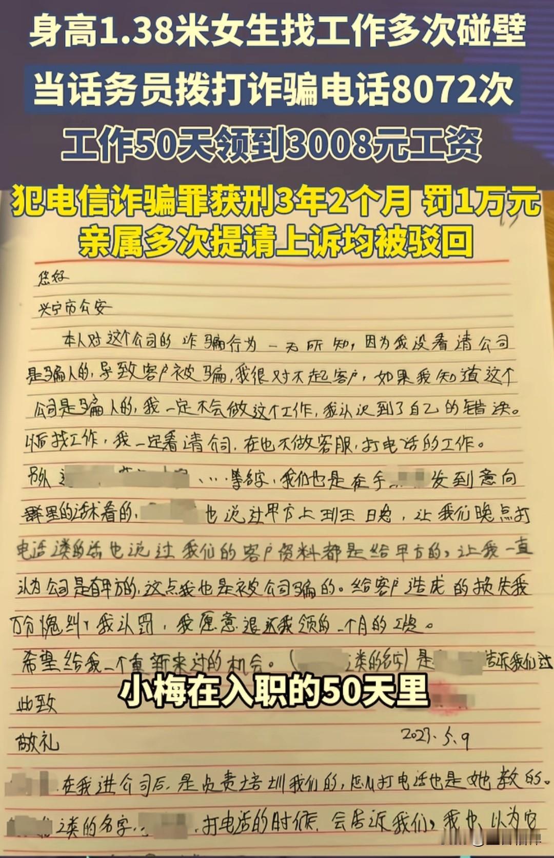 女孩身高只有1.38米,职校毕业的她因身高原因出来找工作多次碰壁,一直没有合适的工作,好不容易入职深圳一家公司当话务员,没想到上班50天涉电诈获刑3年2个月。 据封面新闻、潮新闻等多家媒体报道:河南驻马店的女孩小梅,家庭贫困,因发育迟缓,身高只有一米三八,性格内向老实,找工作找了好多家都被拒绝。 2023年3月,她通过中介进入深圳一家公司担任话务员,找到工作之后,小梅也很开心,朋友圈发了“感恩现在的公司,让我不再害怕上班”。 小梅的工作内容就是每天冒充证券公司的员工,拨打电话邀请他人加入“炒股交流群”,在她入职第三天拨打了一个电话,最终导致一名受害人刘某被骗损失245.99元。 小梅工作了50天拨打诈骗电话8072次,也仅仅领取了3008元工资,法院认定,小梅为电信诈骗提供帮助,受害人被骗数额巨大,认定为诈骗罪共犯,判处有期徒刑三年二个月,家属代为退赔了3008元违法所得并支持了1万元赔偿金。 小梅家属对判决提出了质疑,此案已经历一审、二审,再审申请于2025年5月被梅州市中级人民法院驳回,目前,家属表示正在准备材料继续上诉。 小梅这个案件是一个沉重的警示,也是一个复杂的悲剧,案发后家属表示,小梅住的出租屋只有一把挂面和几个鸡蛋,日子过得非常节俭。 她的个人遭遇也反映了弱势群体在就业市场中的困境,由于身高歧视和学历限制,使得她们很难找到正规工作,容易被不法中介、诈骗公司利用,成为他们犯罪的“工具”,在生存压力下可能面临的法律风险。 但是从法律层面来看,她的行为确实构成了犯罪,并受到了惩罚。对于求职者,尤其是求职困难的人来说,必须对“低门槛、高薪资”还有冒充他人身份的这种工作必须要保持高度警惕。
