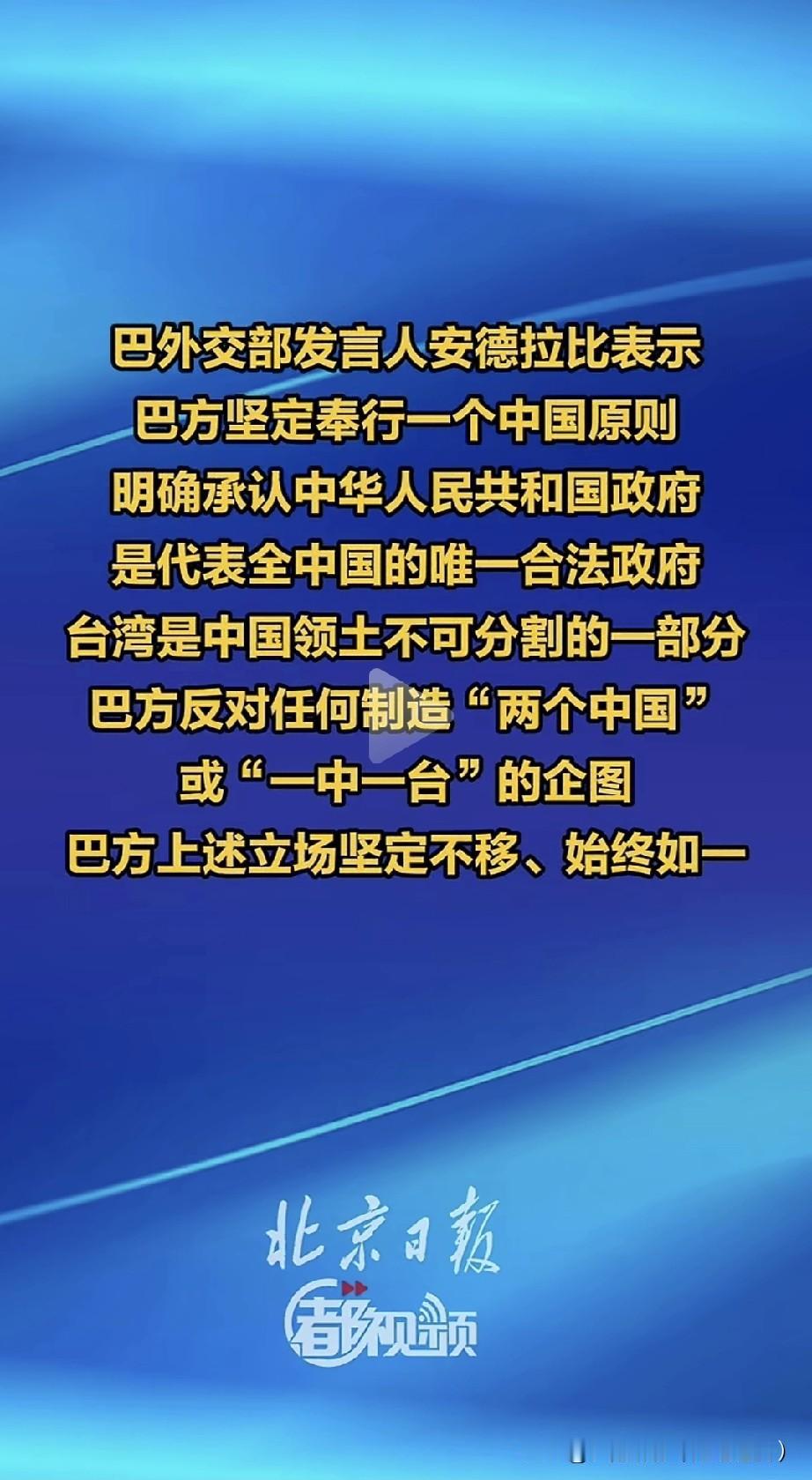 巴基斯坦外交部再亮明态度:坚定奉行一个中国原则,立场始终如一 据北京日报客户端消息,巴基斯坦外交部发言人安德拉比明确表示,巴方坚定奉行一个中国原则,承认中华人民共和国政府是代表全中国的唯一合法政府,台湾是中国领土不可分割的一部分。 巴方反对任何制造“两个中国”或“一中一台”的企图,相关立场坚定不移、始终如一。 中巴一直是全天候战略合作伙伴,在涉及彼此核心利益的问题上始终相互支持,这份坚定的立场,正是两国友谊的生动体现。