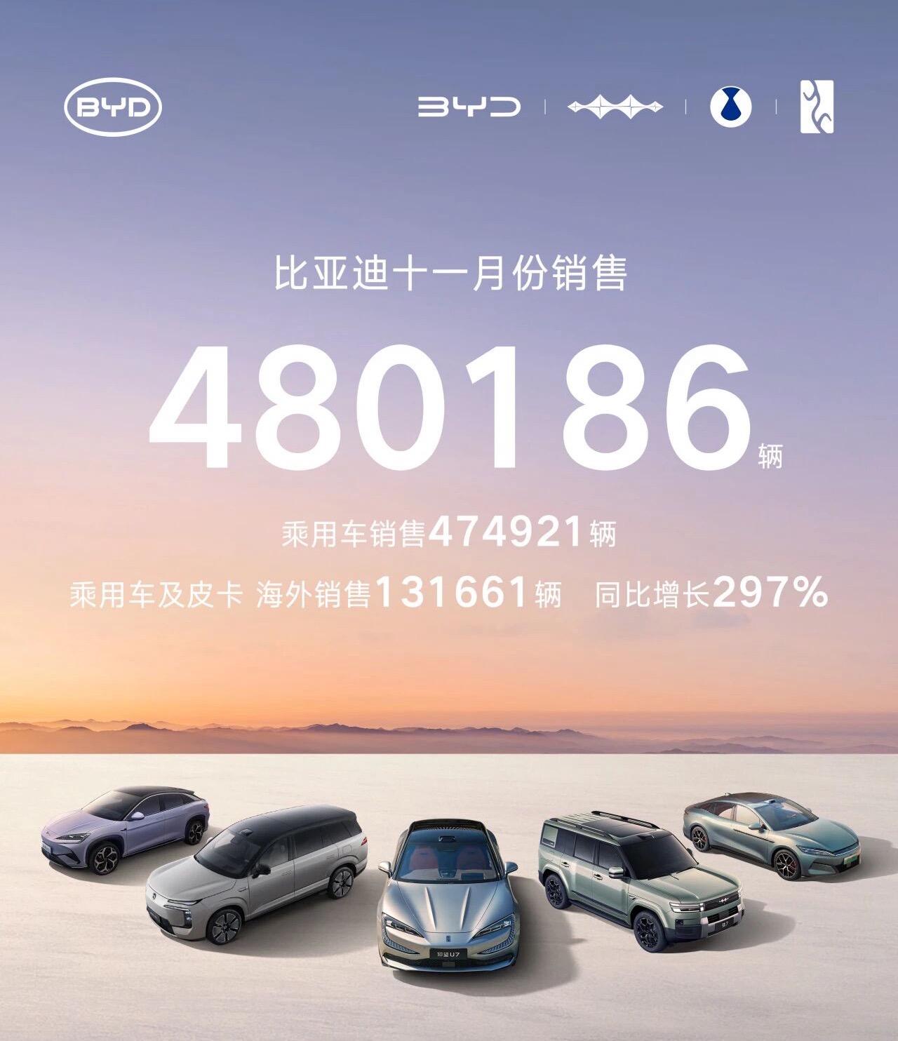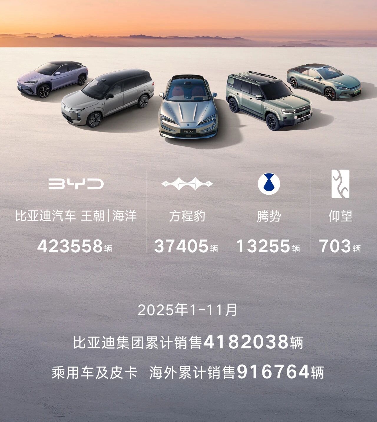 【创年内新高!比亚迪11月销量超48万辆】日前,比亚迪官宣:今年前11个月,比亚迪集团累计销量超418万辆,海外市场销量达91.67万辆。其中,11月销量超48万辆,创年内新高。具体来看,比亚迪王朝丨海洋单月销量达42.35万辆,方程豹单月销量达3.7万辆,腾势单月销量达1.3万辆,仰望单月销量达703辆。