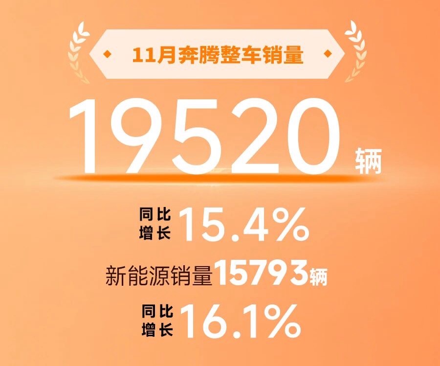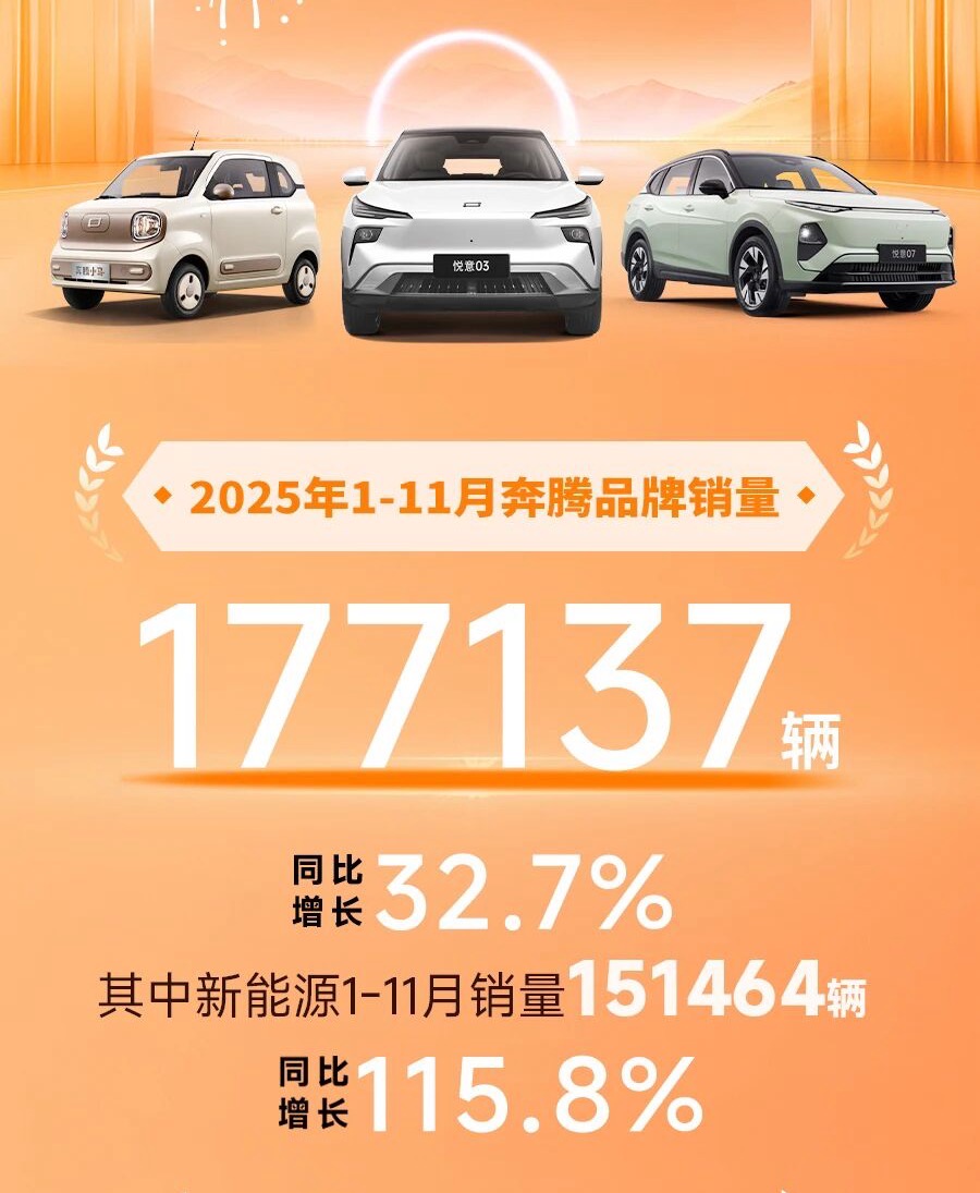 日前,一汽奔腾官宣:11月销量达19520辆,同比增长15.4%。其中,新能源销量达15793辆,同比增长16.1%。今年1-11月,奔腾品牌整车销量177137辆,同比增长32.7%,新能源销量累计达151464辆,同比增长115.8%。依托持续深化合作与营销创新突破,一汽奔腾正不断积蓄发展势能。