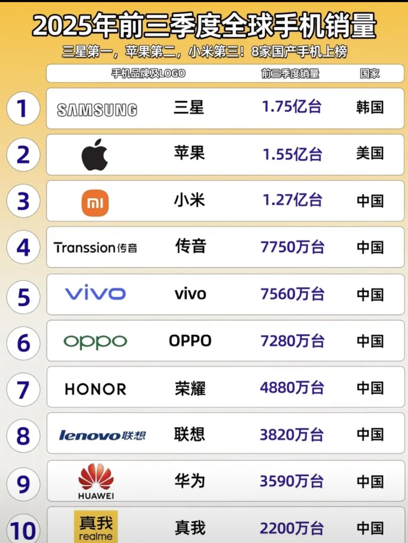2025年前三季度手机销量排名里,三星、苹果、小米位居前三,三星国际认可度确实强。上半年出货量数据,三星以1.181亿部排第一,是唯一破亿的品牌,虽在中国市场不佳,但在欧美、南亚等地出货量领先。 不过苹果势头很猛,得益于iPhone 17系列热卖,预计今年出货量达2.55亿部,同比增10%,有望超越三星成全球最大手机制造商。而小米作为国产代表,上半年出货8420万部排第三,国产品牌整体影响力在持续增长,未来手机市场竞争想必更精彩。