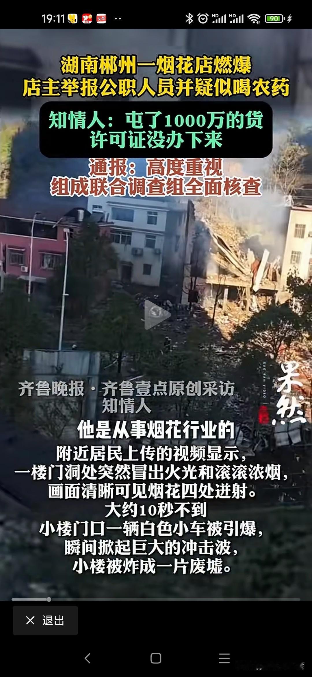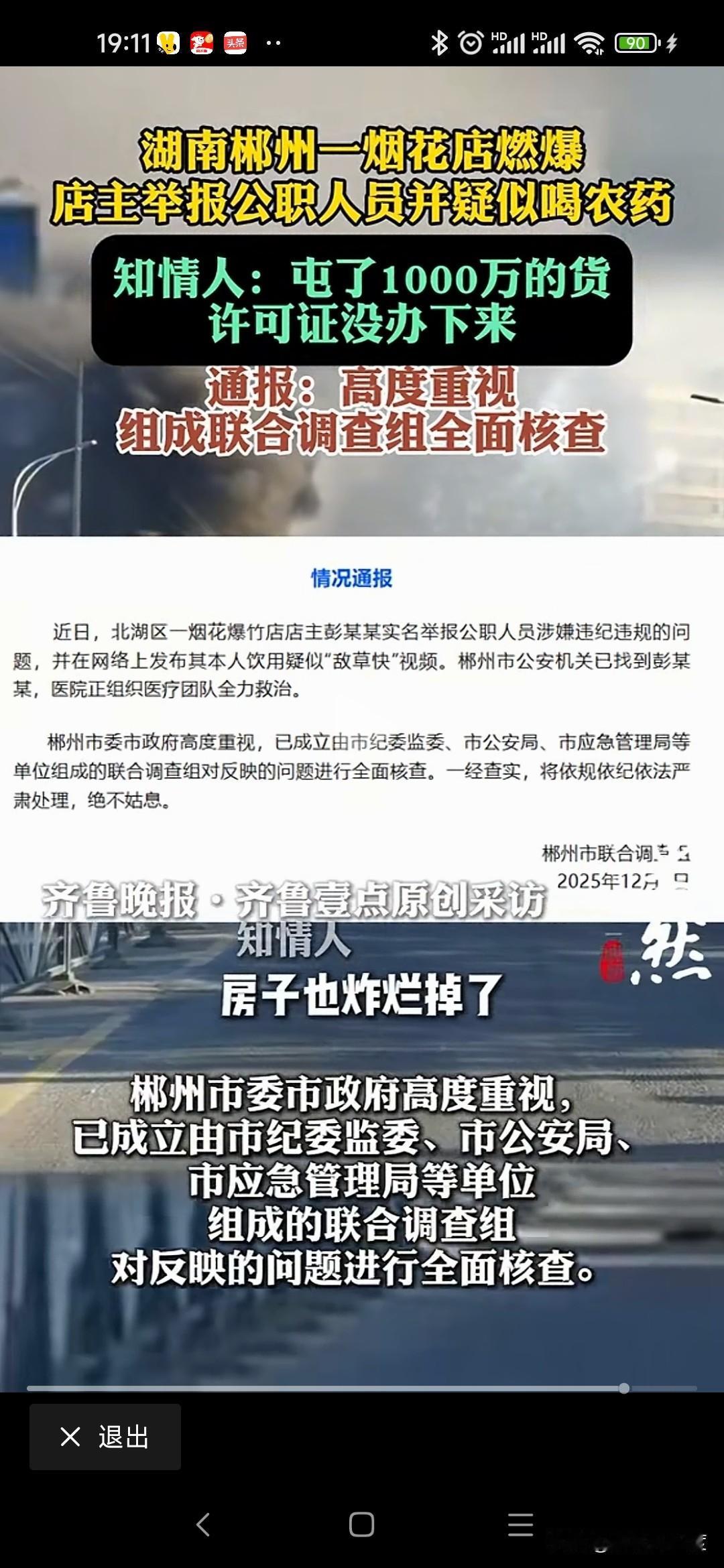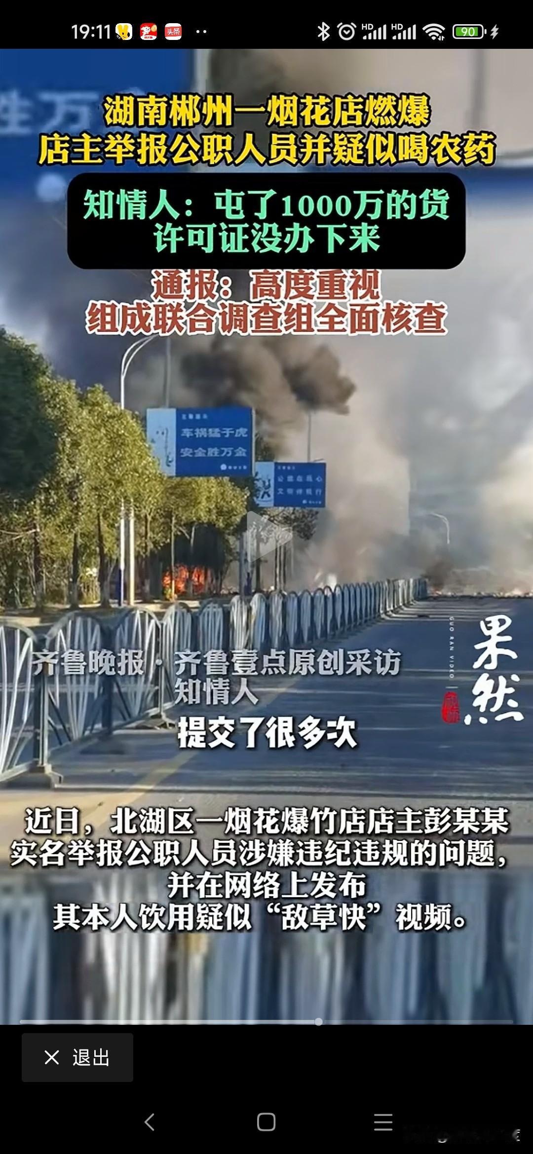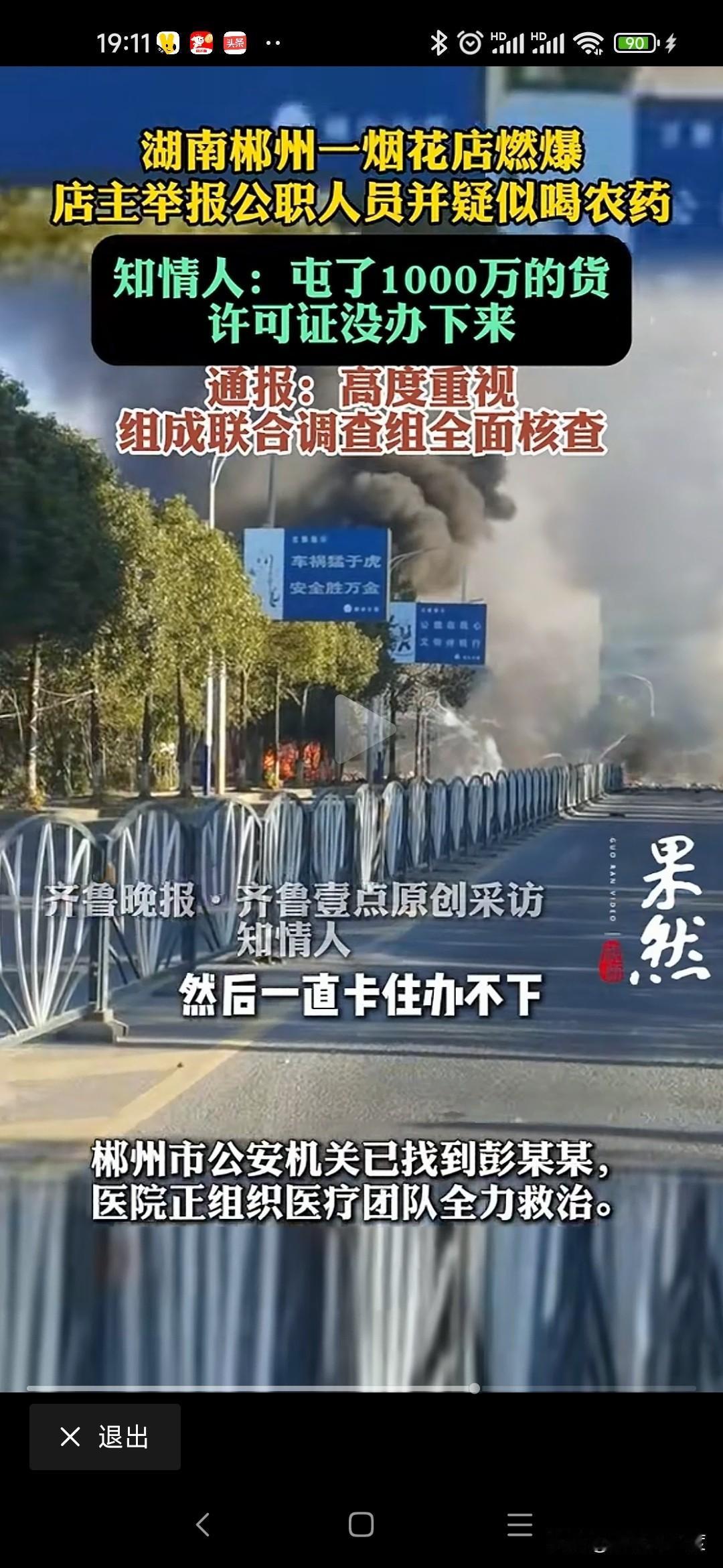 湖南烟花爆竹爆炸店主自杀 湖南郴州北湖区烟花爆竹店彭某某,花巨资购进1000万的烟花爆竹,准备春节期间销售。 但是多次办理春节期间烟花爆竹经营(零售)许可证无果。 因为每个城市每个区每个街道的临时烟花爆竹经营(零售)许可证是有数的就那几个,位置也很关键,好的位置直接影响着销售额。 彭某某应该高额贷款购买的1000万的烟花爆竹,本想春节期间大赚一笔,结果各种方式去保证也办不下来。 核心许可:烟花爆竹经营(零售)许可证:这是最关键的证照,需向所在区的应急管理局申请。申请前要确认大棚位置符合当地布点规划,且和学校、加油站等易燃易爆或人员密集场所保持规定安全距离,还得配备消防器材;同时经营者需完成安全知识培训,提交申请书、经营场所租赁证明等材料,审核通过后才能拿到证,证件要在大棚显眼位置悬挂。 没有这个证件根本无法营业,所以彭某某感觉到绝望才走了绝路。 引爆仓库实名举报某些官员,网络直播和百草枯自杀,已引起公众的注意。 当地政府已经紧急介入,并对彭某某实施紧急抢救,希望他能渡过难关,政府也变态一定严查,揪出害群之马! 在此内忧外患之际,咱们不能把这公章吃拿卡要了!