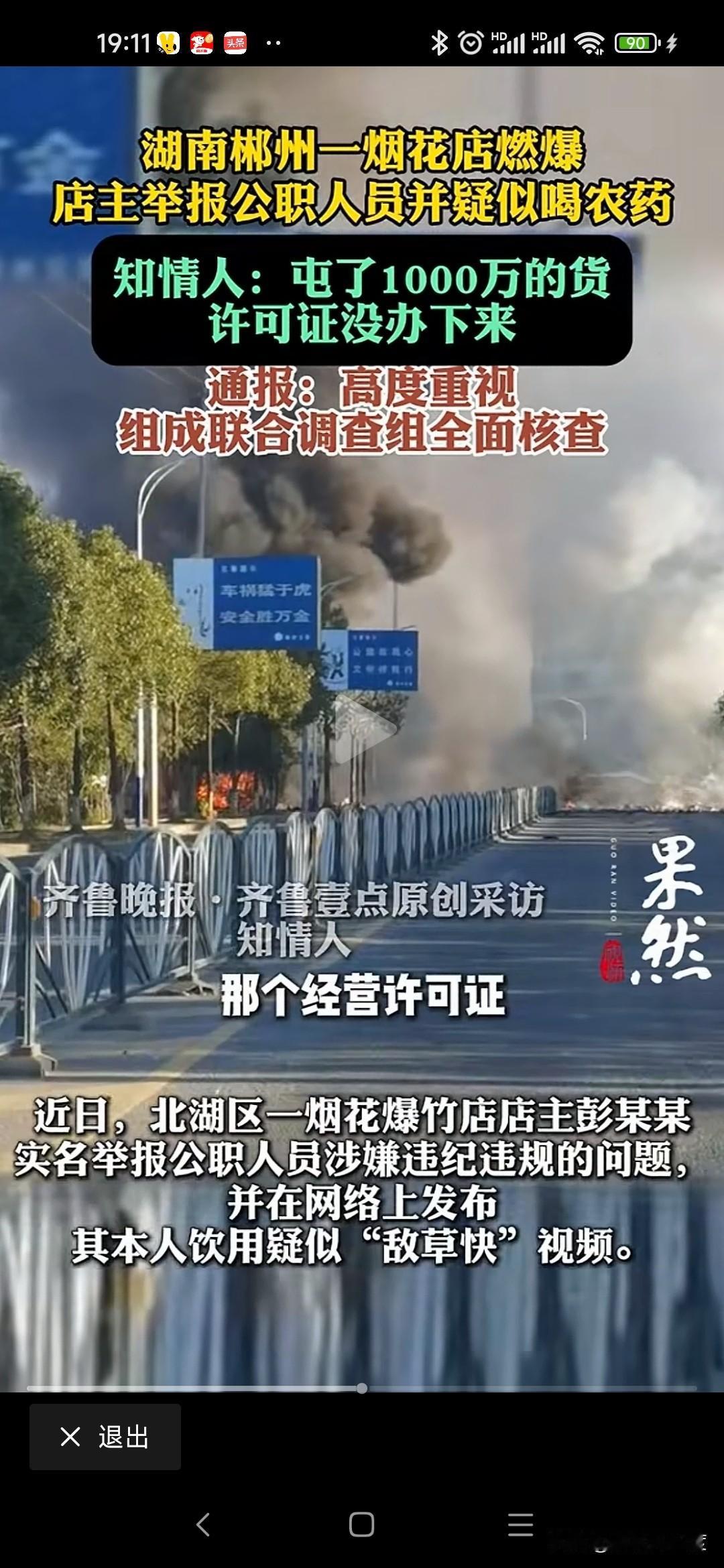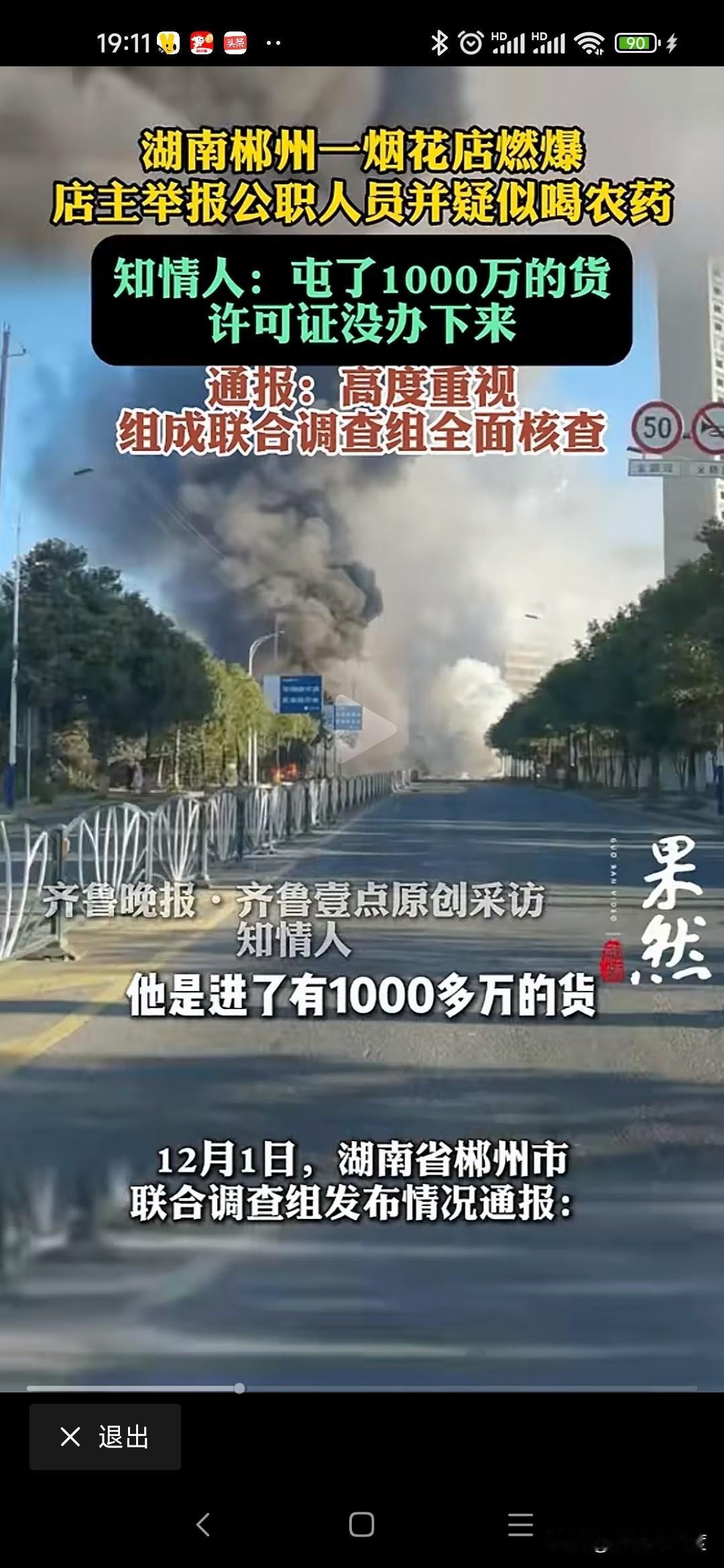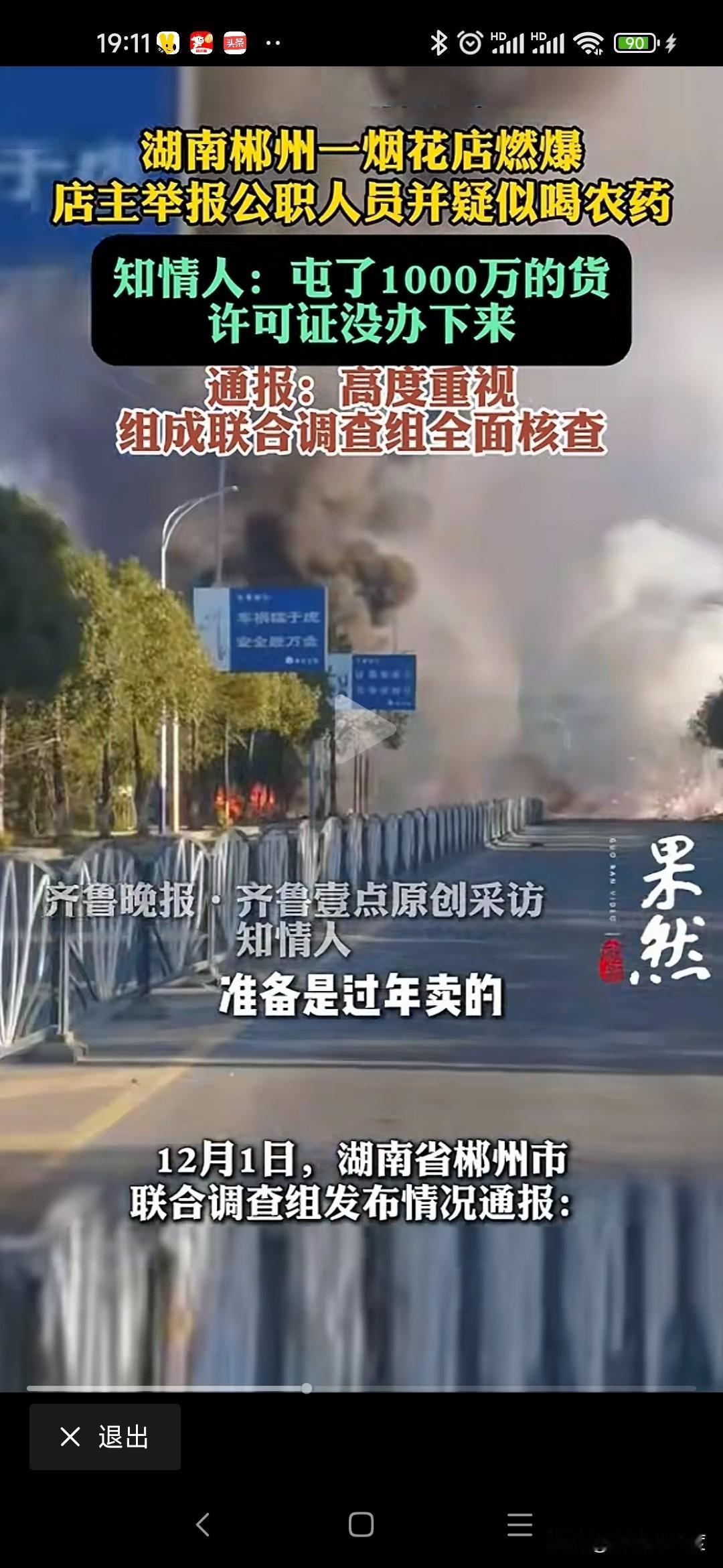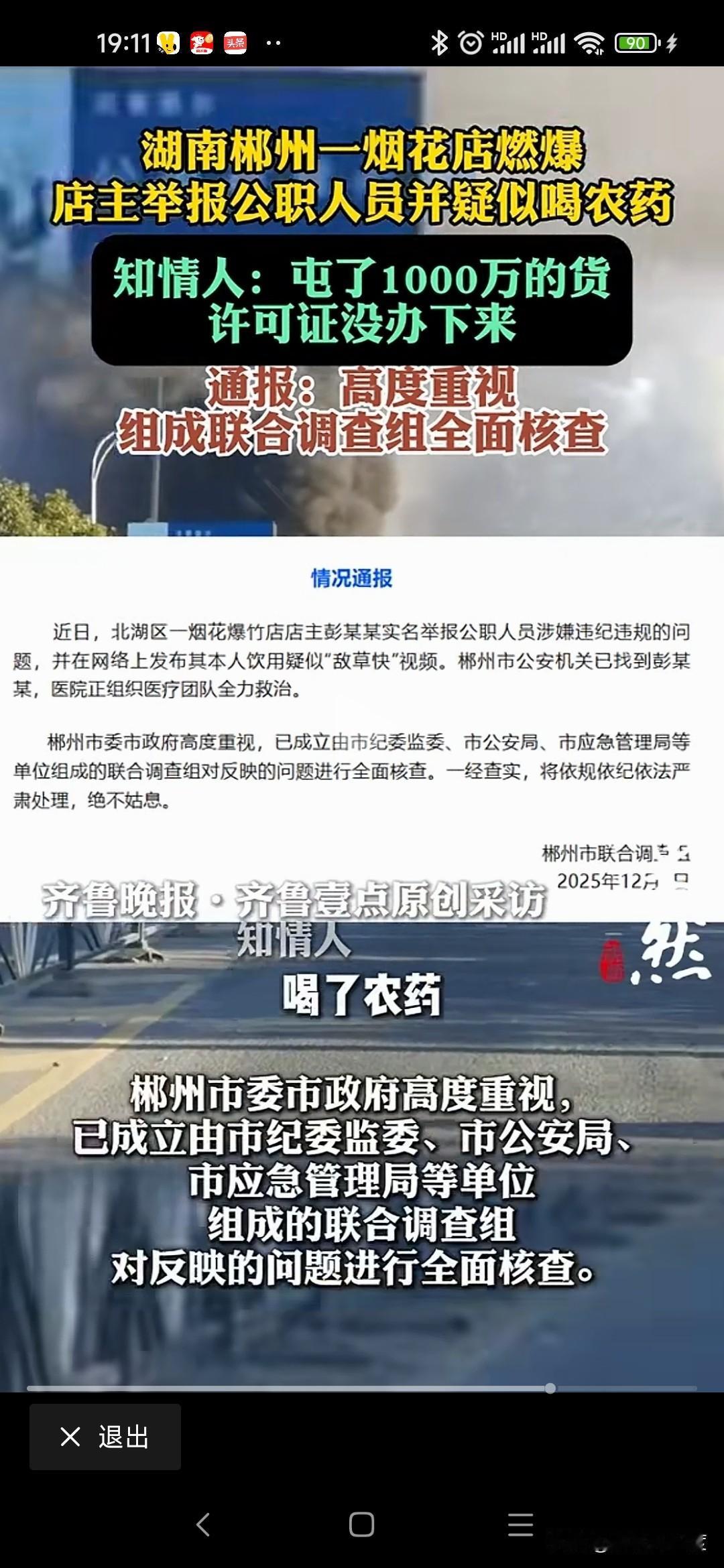 湖南烟花爆竹爆炸店主自杀 湖南郴州北湖区烟花爆竹店彭某某,花巨资购进1000万的烟花爆竹,准备春节期间销售。 但是多次办理春节期间烟花爆竹经营(零售)许可证无果。 因为每个城市每个区每个街道的临时烟花爆竹经营(零售)许可证是有数的就那几个,位置也很关键,好的位置直接影响着销售额。 彭某某应该高额贷款购买的1000万的烟花爆竹,本想春节期间大赚一笔,结果各种方式去保证也办不下来。 核心许可:烟花爆竹经营(零售)许可证:这是最关键的证照,需向所在区的应急管理局申请。申请前要确认大棚位置符合当地布点规划,且和学校、加油站等易燃易爆或人员密集场所保持规定安全距离,还得配备消防器材;同时经营者需完成安全知识培训,提交申请书、经营场所租赁证明等材料,审核通过后才能拿到证,证件要在大棚显眼位置悬挂。 没有这个证件根本无法营业,所以彭某某感觉到绝望才走了绝路。 引爆仓库实名举报某些官员,网络直播和百草枯自杀,已引起公众的注意。 当地政府已经紧急介入,并对彭某某实施紧急抢救,希望他能渡过难关,政府也变态一定严查,揪出害群之马! 在此内忧外患之际,咱们不能把这公章吃拿卡要了!