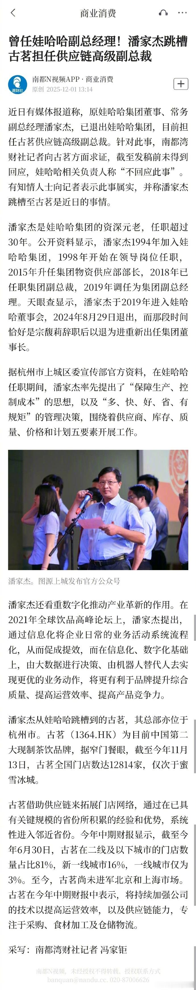 娃哈哈集团资深元老被曝跳槽【曾任娃哈哈副总经理!潘家杰跳槽古茗担任供应链高级副总裁】原娃哈哈副总经理被曝跳槽古茗近日有媒体报道称,原娃哈哈集团董事、常务副总经理潘家杰已退出娃哈哈集团,目前担任古茗供应链高级副总裁。针对此事,记者向古茗方面求证,截至发稿前未得到回应,娃哈哈相关负责人称“不回应此事”。有知情人士向记者表示此事属实,并称潘家杰跳槽至古茗是近日的事情。潘家杰是娃哈哈集团的资深元老,任职超过30年。公开资料显示,潘家杰1994年加入娃哈哈集团,1998年开始在领导岗位任职,2015年升任集团物资供应部部长,2018年已任职集团副总裁,2019年调任为集团副总经理。天眼查显示,潘家杰于2019年进入娃哈哈董事会,2024年8月29日退出,而那段时间恰好是宗馥莉辞职后以退为进重新出任集团董事长。
