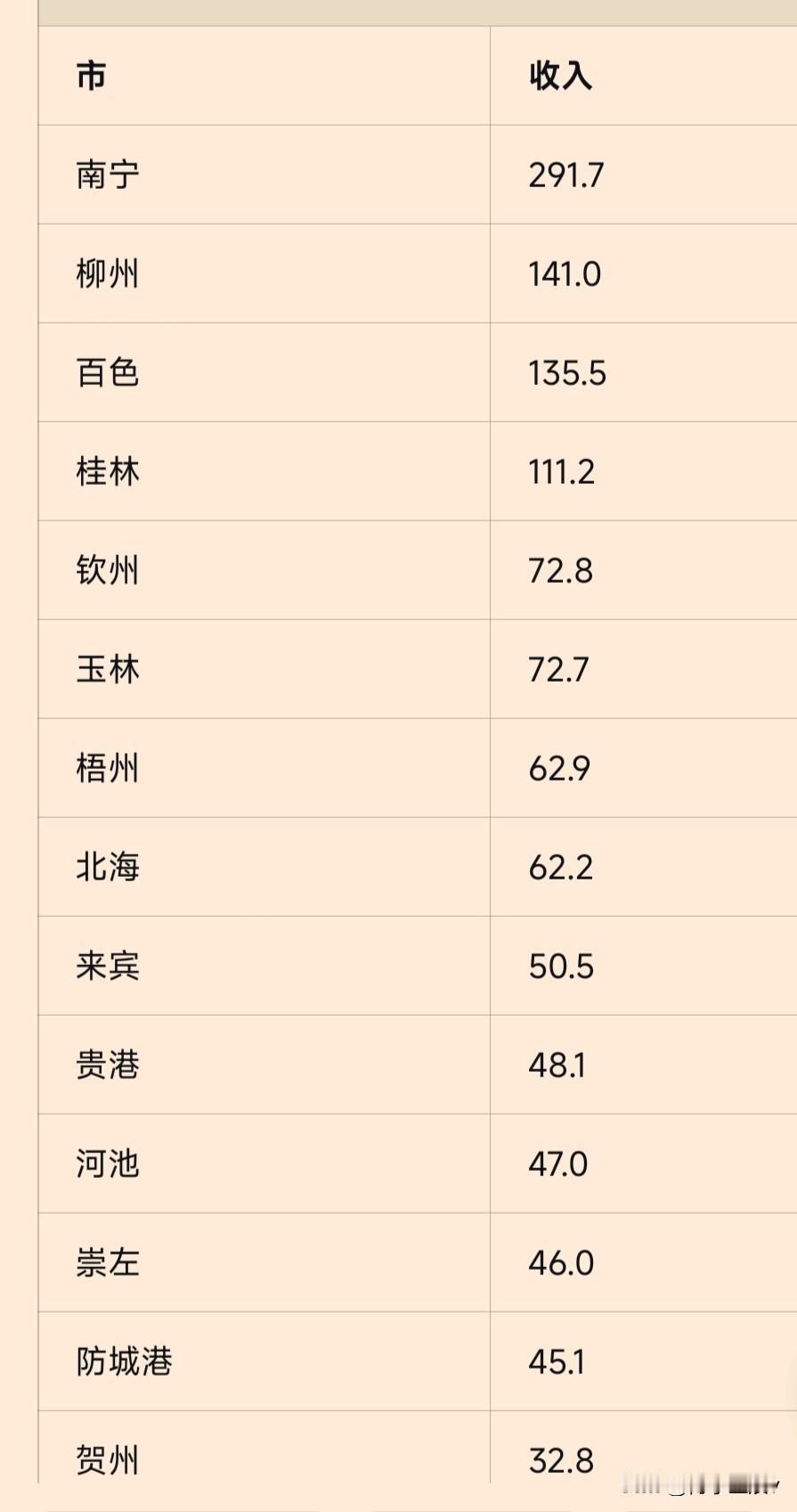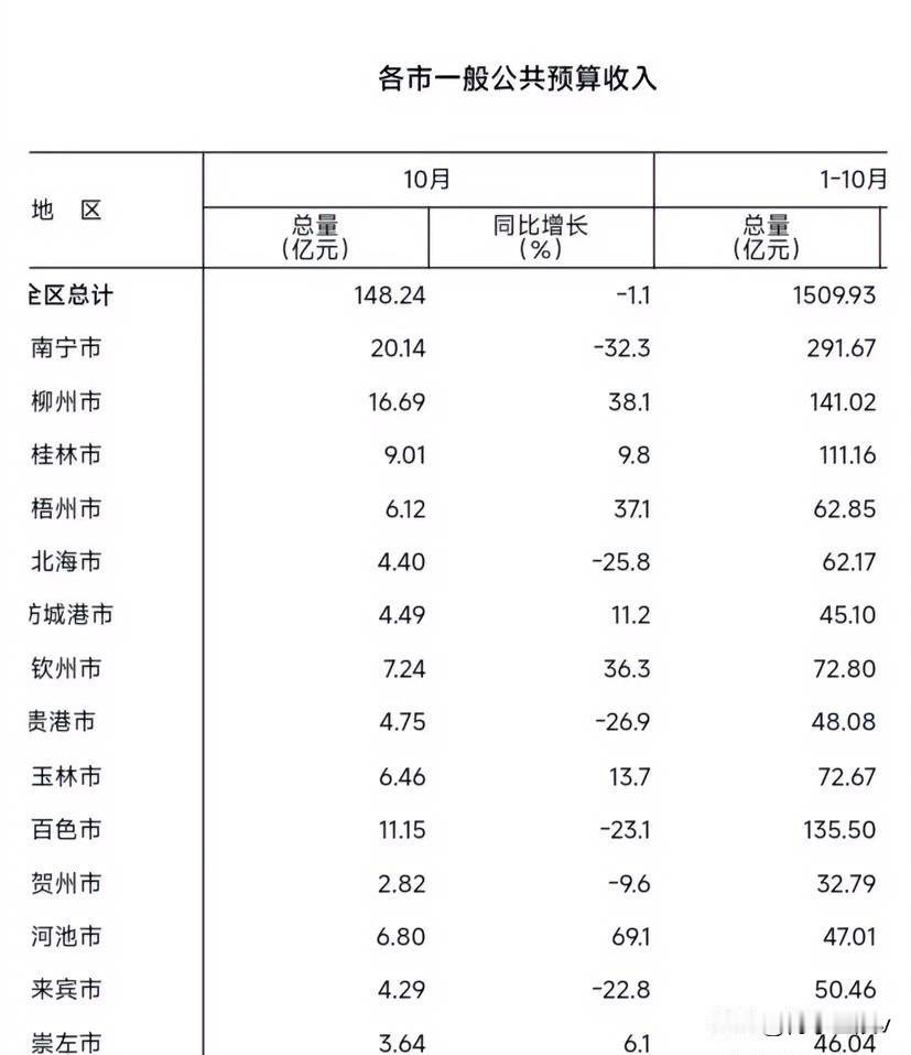 浅析广西2025年1-10月各地一般公共预算收入 一、总量格局:一城独大,梯队分明 1. 南宁 291.7 亿元,占全区 1509.9 亿元的 19.3%,是第 2 名柳州的 2.1 倍,绝对龙头。 2.300→100→70→60→50→40→30 亿元自然断档,形成 6 个梯队,后 13 市合计仅相当于 1.2 个南宁。 二、区域分布:南北反差、沿边薄弱 桂中/桂北:南宁+柳州+桂林合计 543.9 亿元,占全区 36%。 桂南沿海:钦州、北海、防城港三市合计 180.1 亿元,仅占 11.9%,与“向海经济”战略仍不匹配。 桂东:梧州、玉林、贵港、贺州四市合计 216.5 亿元,平均 54 亿元,承接大湾区产业仍处于“量变”阶段。