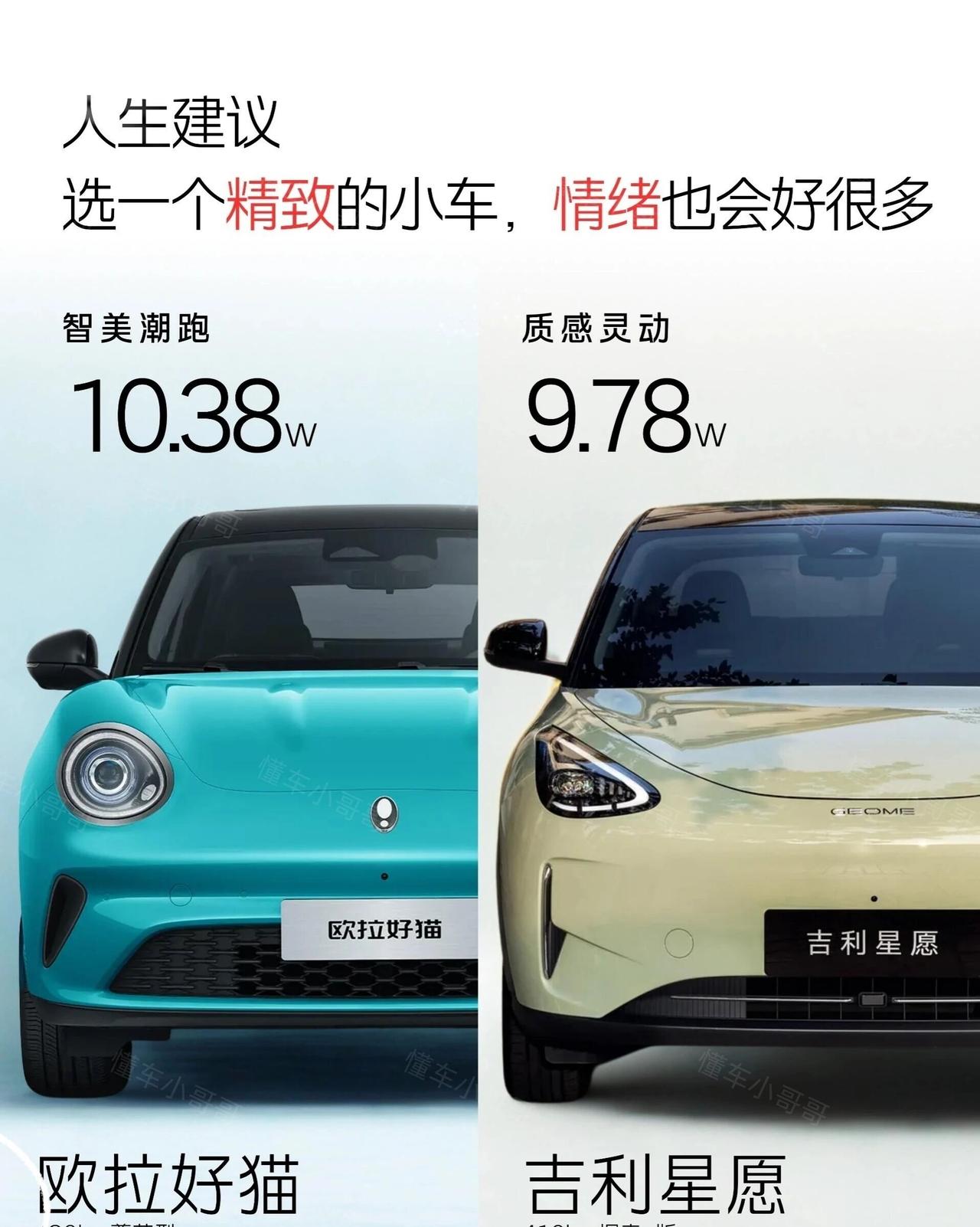 -~外观:好猫圆润车身+猫眼大灯超吸睛,18英寸轮毂+8层亮面车漆拍照出片;星愿7种配色更亲民,16英寸轮毂是标准A0级代步范。 - ~内饰:好猫双大屏+全景天窗显档次,亲肤环保材质还拿过“五星健康车”认证;星愿8.8英寸仪表+14.6英寸中控够用,软包点缀添温馨。 - ~ 续航驾驶:好猫430km续航+126kW功率,百种场景泊车辅助超省心;星愿410km续航+85kW功率,基础辅助功能满足日常通勤。 - ~安全:好猫高强度钢占比超70%,主动被动安全拉满;星愿65%高强度钢+基础辅助,保障到位。 追求品质与情绪价值选好猫,务实代步选星愿,你更倾向哪款?