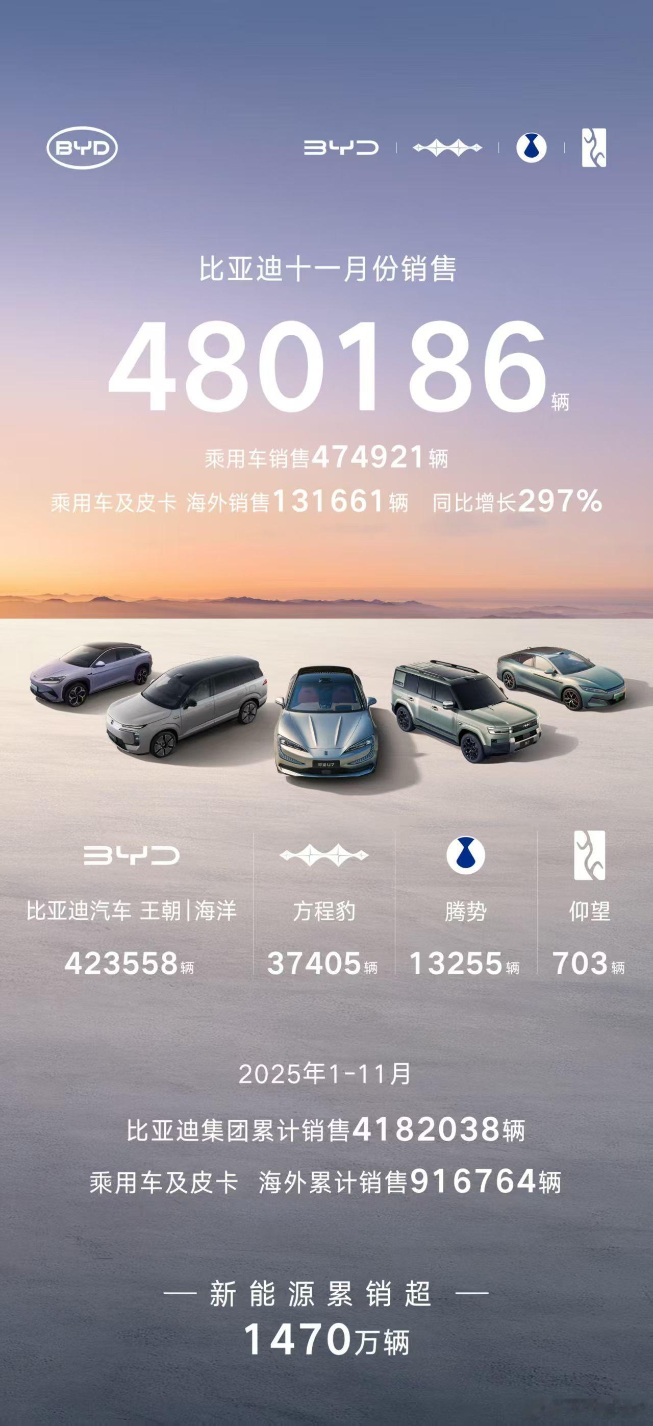 比亚迪11月把销冠的宝座又拿回来了....单月48万台,海外13.2