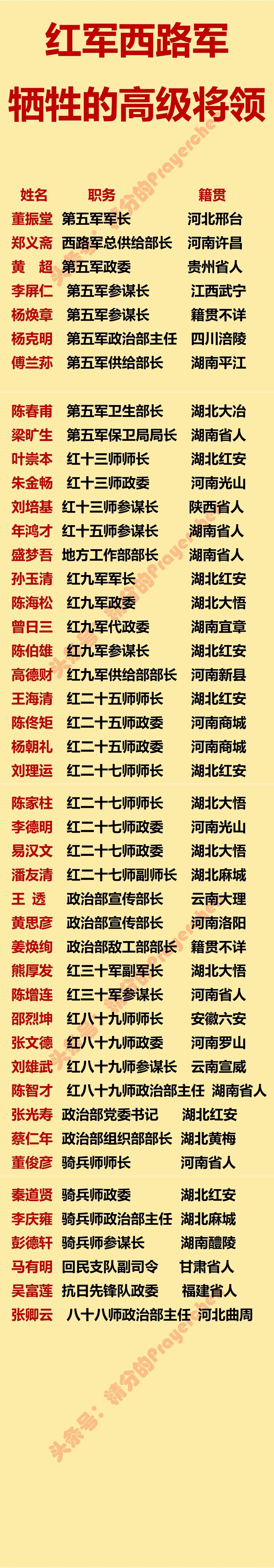 西路军牺牲的高级将领名单。 红军在西征过程中,牺牲了多位高级将领,是我军的重大损失。 其中红九军军长孙玉清牺牲时只有25岁,红九军政委陈海松牺牲时只有23岁。 红五军军长董振堂牺牲时42岁,红五军政委杨克明牺牲时31岁。 西路军出征时约有两万二千人,最后到达新疆的人数只有427人。 这427人抵达新疆,是西路军唯一成建制保留下来的力量,谱写了新中国革命史上最为悲壮的篇章之一。