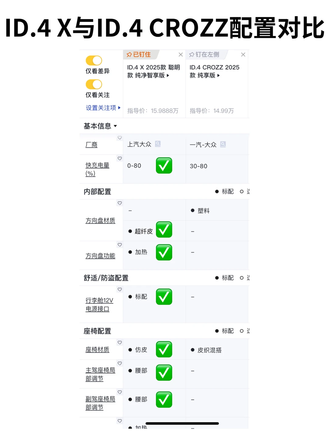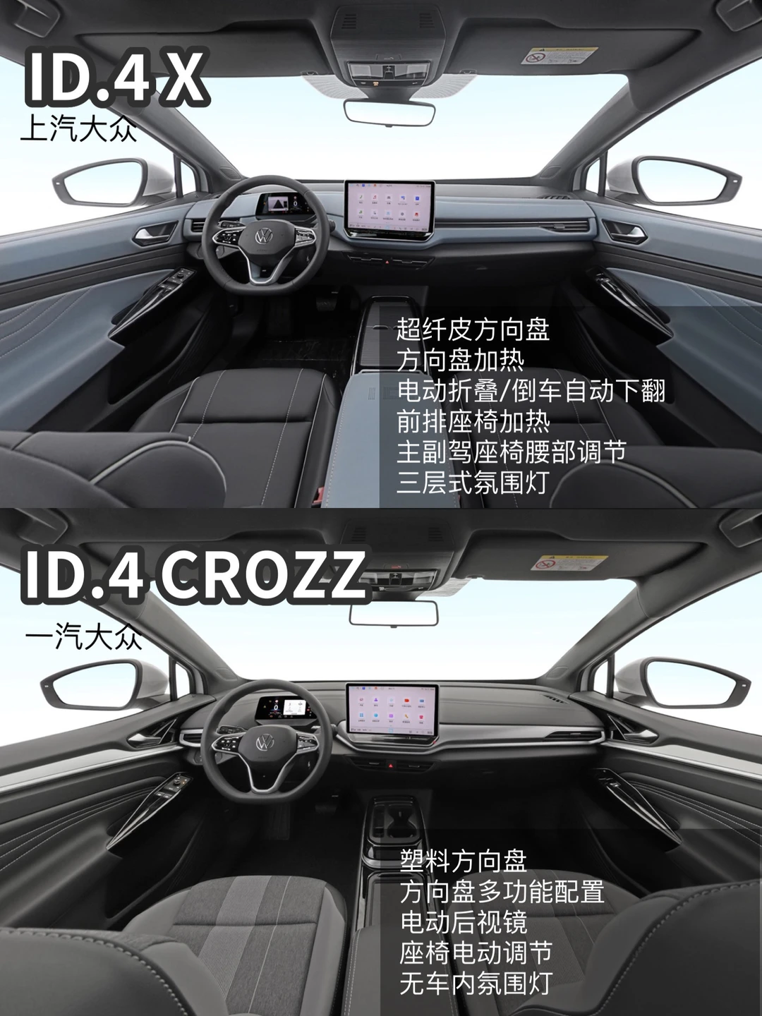 💆在驾驶体验和舒适性上,上汽大众ID.4 X小胜一筹。它的超纤皮质方向盘握感舒适,还有方向盘加热功能,冬天开车再也不用冻手了。电动折叠/倒车自动下翻的后视镜,方便又实用,女生/新手停车的时候能更轻松地观察后方情况。前排座椅加热和主副驾座椅腰部调节,全方位照顾到驾驶者和乘客的舒适感受。而且,上汽大众多了三层式氛围灯,能营造出浪漫的车内氛围;标配自适应远近光和前脸贯穿式LED灯带,不仅好看,还能提升夜间行车的安全性。而一汽大众ID.4 CROZZ在驾驶体验上表现中规中矩,短途日常代步还行。