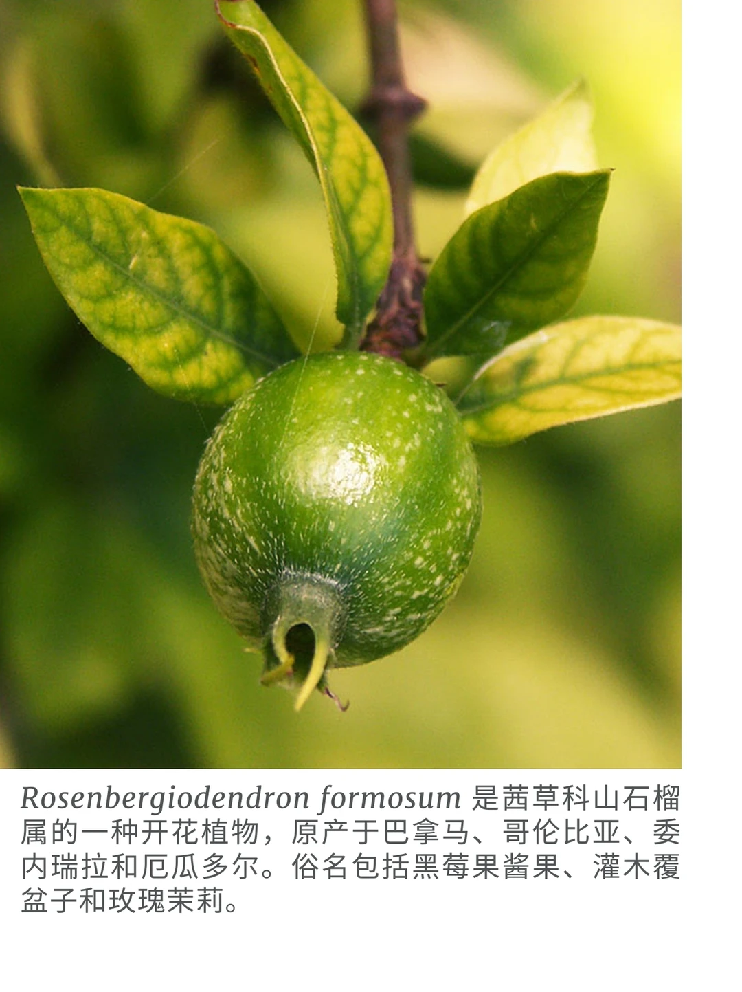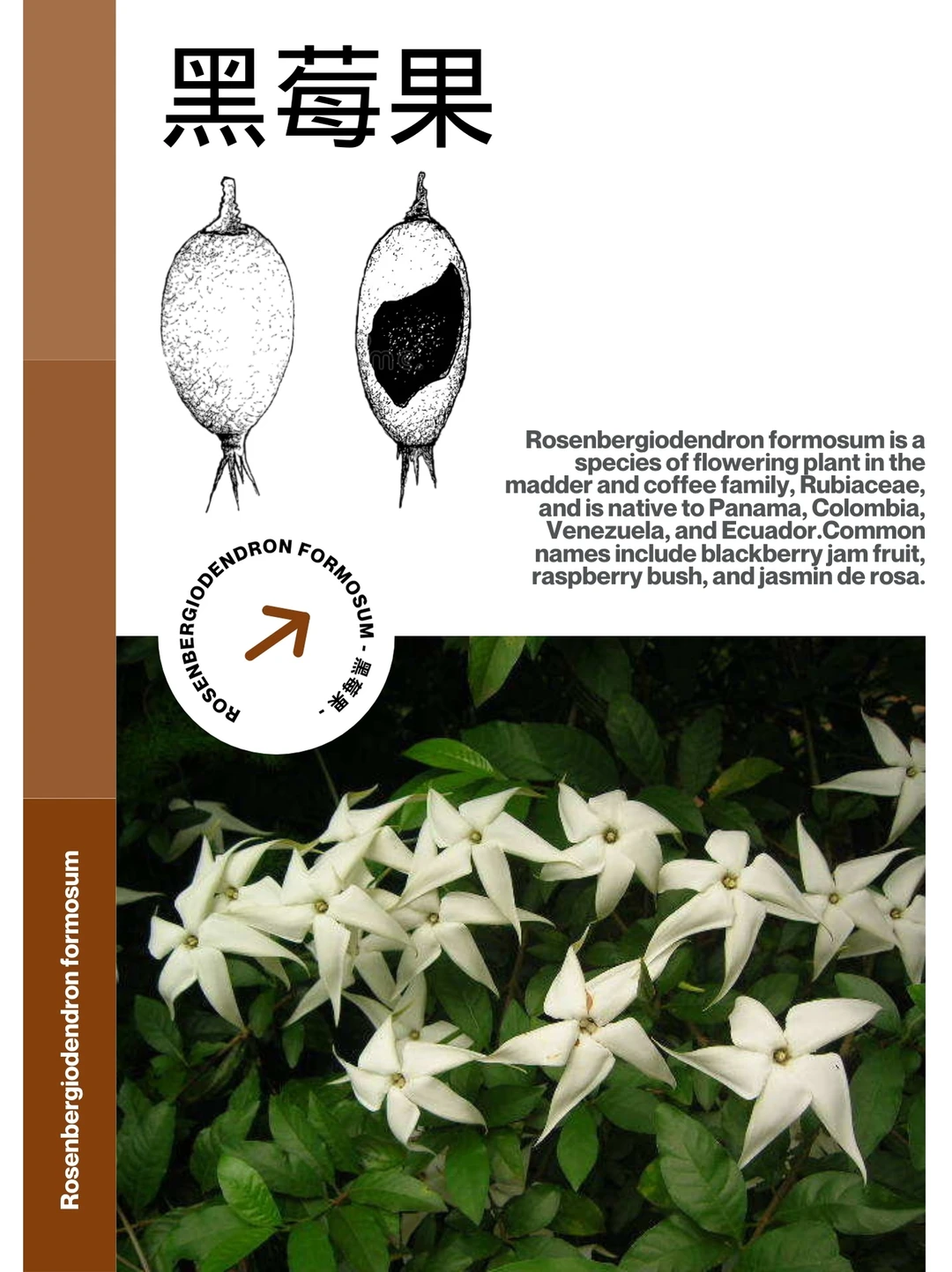 黑莓果 茜草科 山石榴属 栀子花 Rosenbergiodendron formosum 巴拿马 哥伦比亚 水果 热带水果 黑莓果Rosenbergiodendron formosum 是茜草科山石榴属的一种开花植物,原产于巴拿马、哥伦比亚、委内瑞拉和厄瓜多尔。俗名包括黑莓果酱果、灌木覆盆子和玫瑰茉莉。