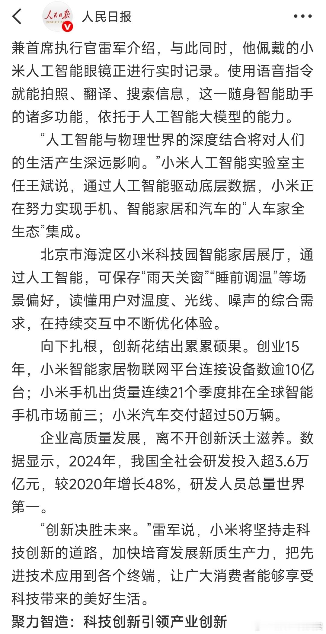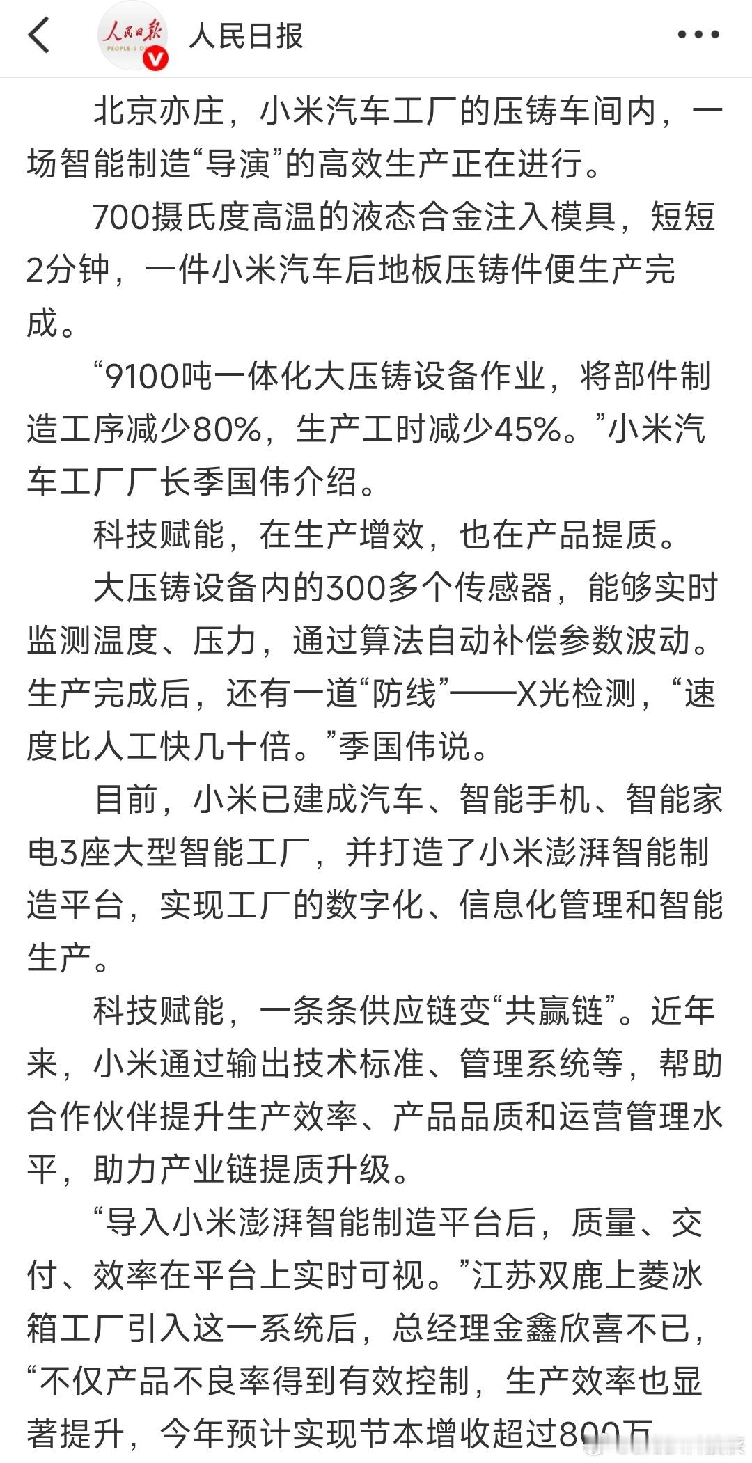 人民日报谈小米集团高质量发展人民日报头版直接盖章小米是硬核科技公司,谁还敢说它是“组装厂”?全文18次夸创新,小米玄戒O1芯片,3纳米制程塞了190亿个晶体管,直接填补内地先进制程空白。雷军更是真金白银砸研发,过去五年超千亿,未来五年还要再投2000亿,死磕芯片、AI、操作系统三大赛道。手机全球前三、智能家居连了10亿台设备、汽车19个月交付50万辆,还靠澎湃智能制造平台带动200多家企业升级,带着国产产业链一起飞!作为一直关注小米的数码爱好者,看着它从手机做到全生态,真的忍不住骄傲!