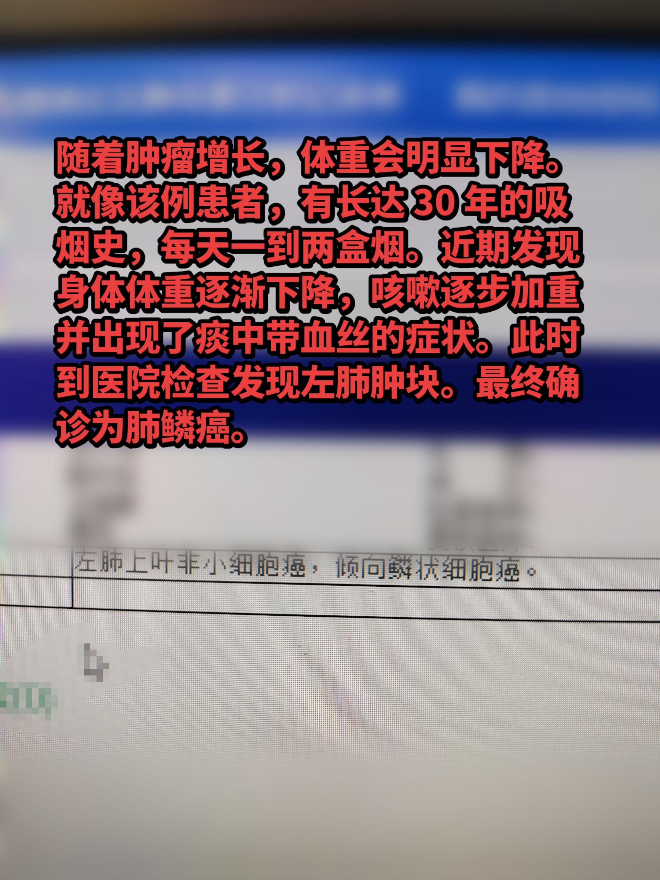 如果你长期抽烟,最近又突然出现咳嗽、胸闷气短、痰中带血及体重明显下降需要警惕肺部疾病。其中与抽烟直接相关的肺部肿瘤有肺鳞癌与小细胞癌。这两类肿瘤多属中心型肺癌,以刺激性干咳、痰中带鲜红血丝最为常见,如肿瘤增大可出现胸闷。随着肿瘤增长,体重会明显下降。就像该例患者,有长达 30 年的吸烟史,每天一到两盒烟。近期发现身体体重逐渐下降,咳嗽逐步加重并出现了痰中带血丝的症状。此时到医院检查发现左肺肿块。最终确诊为肺鳞癌。