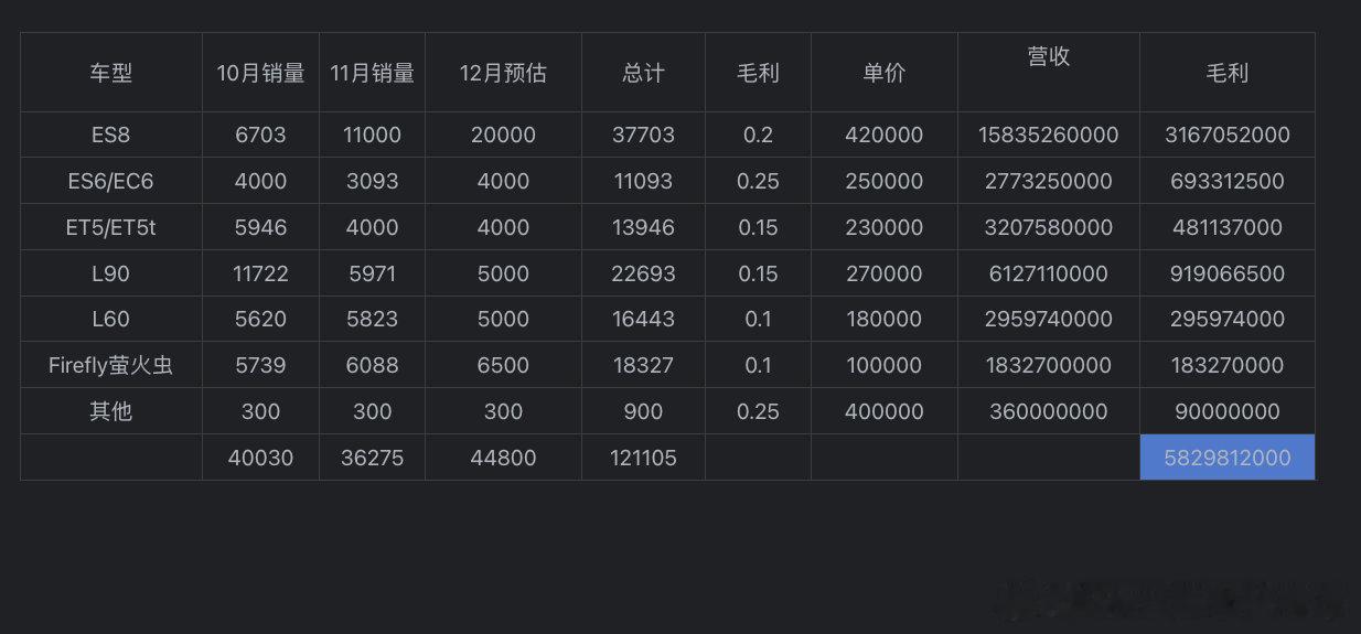 蔚来11月共交付36,275台新车,同比增长76.3%。其中,蔚来主品牌交付18,393台,连续四个月实现环比增长;乐道(ONVO)品牌交付11,794台;萤火虫(Firefly)表现尤为亮眼,交付达6,088台,同样连续四个月创下新高。受国家及地方新能源政策调整影响,今年汽车行业大概率不会重现往年的“翘尾效应”。这一变化对整个市场构成不小挑战,也导致部分消费者推迟了换车计划。不过,蔚来自身的基本面依然稳健——ES8订单异常火爆,目前下单预计要等到2025年4月才能交付;萤火虫的订单势头也同样强劲,为公司在年末冲刺阶段提供了有力支撑。据我了解,12月蔚来将大幅提升ES8产能,交付量有望再创新高;萤火虫也将继续冲击交付纪录。尽管部分车型可能受到整体消费环境影响,但ES8与萤火虫将成为Q4销量的核心驱动力。综合来看,蔚来12月整体交付量极有可能刷新历史单月新高。更值得关注的是,ES8作为高毛利车型,其在交付结构中的占比提升,将显著优化蔚来Q4的营收与利润表现。虽然整体交付规模略低于9月时的乐观预期,但产品结构的改善对盈利更具实质意义。基于我的预估模型,蔚来Q4总交付量有望达到12.2万台,同比增长65%–72%;对应营收预计在327亿至340亿元之间,毛利约58亿元。同时,CBU机制在Q3已初见成效,Q4将继续推动运营效率提升。公司此前在财报中明确表示,Q4实现盈利的目标不变,李斌(斌哥)也在财报会上强调:“对达成盈利目标有充足信心。”一切值得期待,静候佳音。