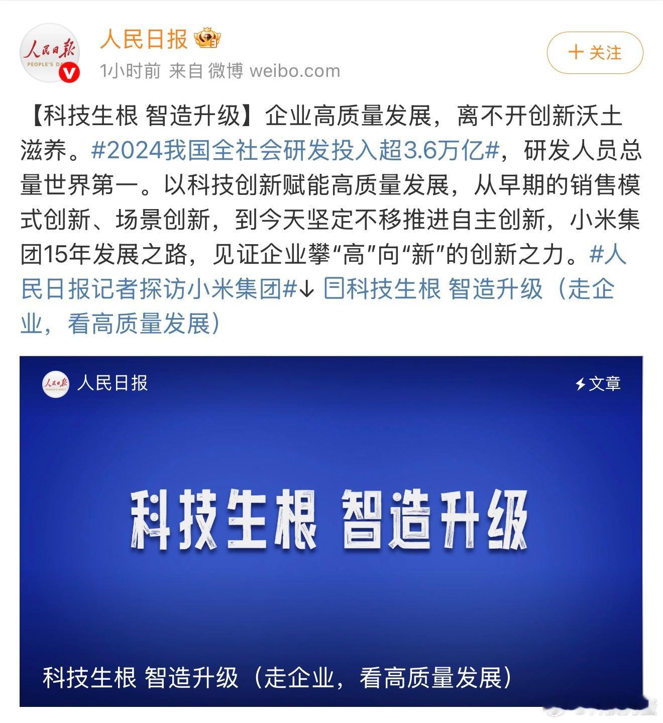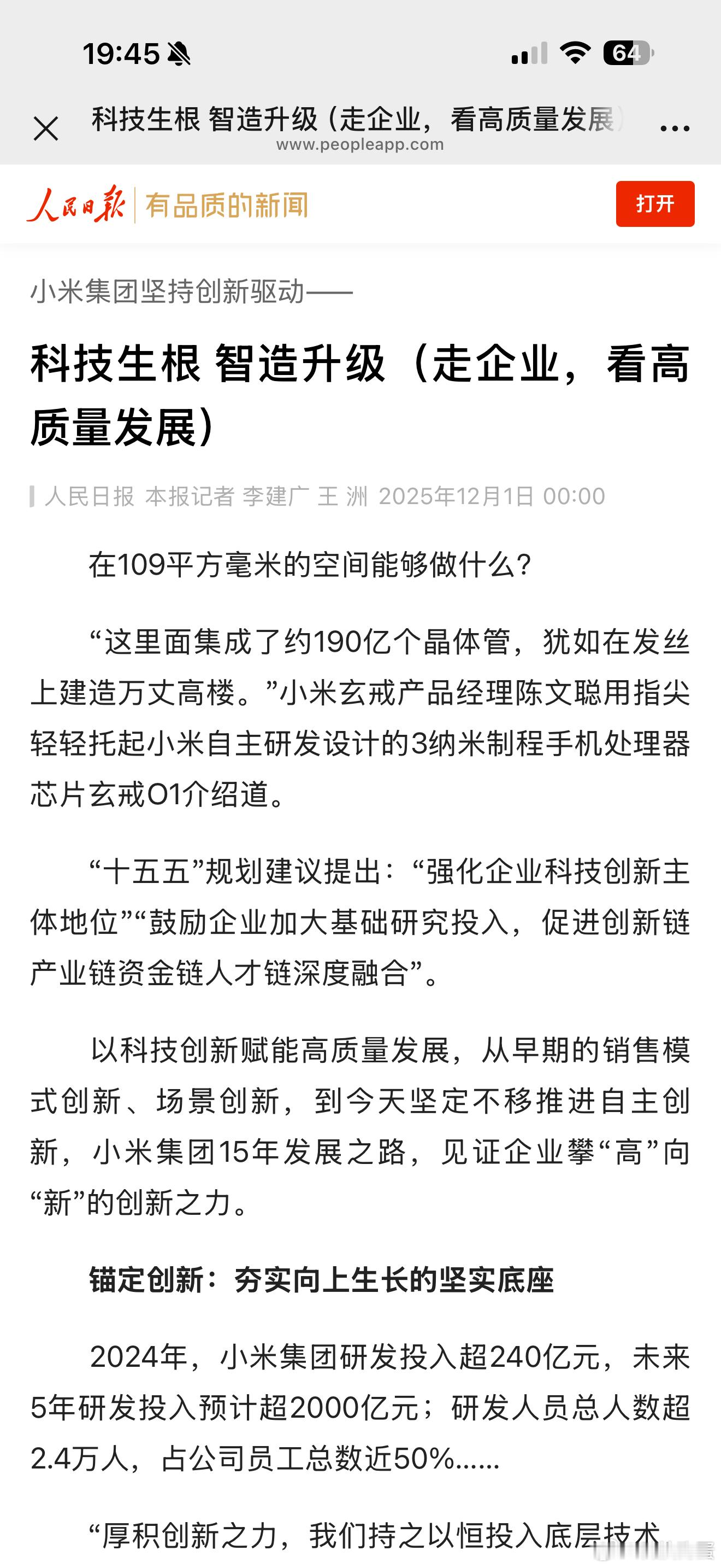 人民日报谈小米集团高质量发展今天刷到人民日报头版大篇幅报道小米,狗蛋是真的忍不住想多说几句。人民日报作为权威官媒,头版的含金量,这就不用多说了,这传递的就是最官方的认可信号,文章里光“创新”俩字就提了18次,开篇就重点讲小米自主研发的3纳米芯片玄戒O1,这技术实力可不是随便能组装出来的,11年造芯之路每一步都走的扎实。国家需要这样敢投研发、能搞创新的企业,我们也该珍惜这些让中国智造走向世界的品牌。与其鸡蛋里挑骨头,不如多看看小米在芯片、汽车、智能制造上的突破,为中国科技企业的成长多些鼓励。
