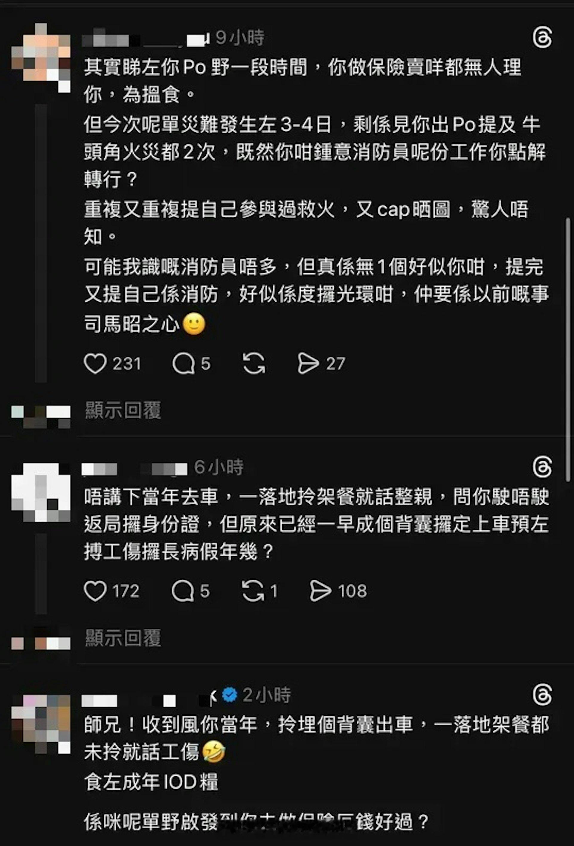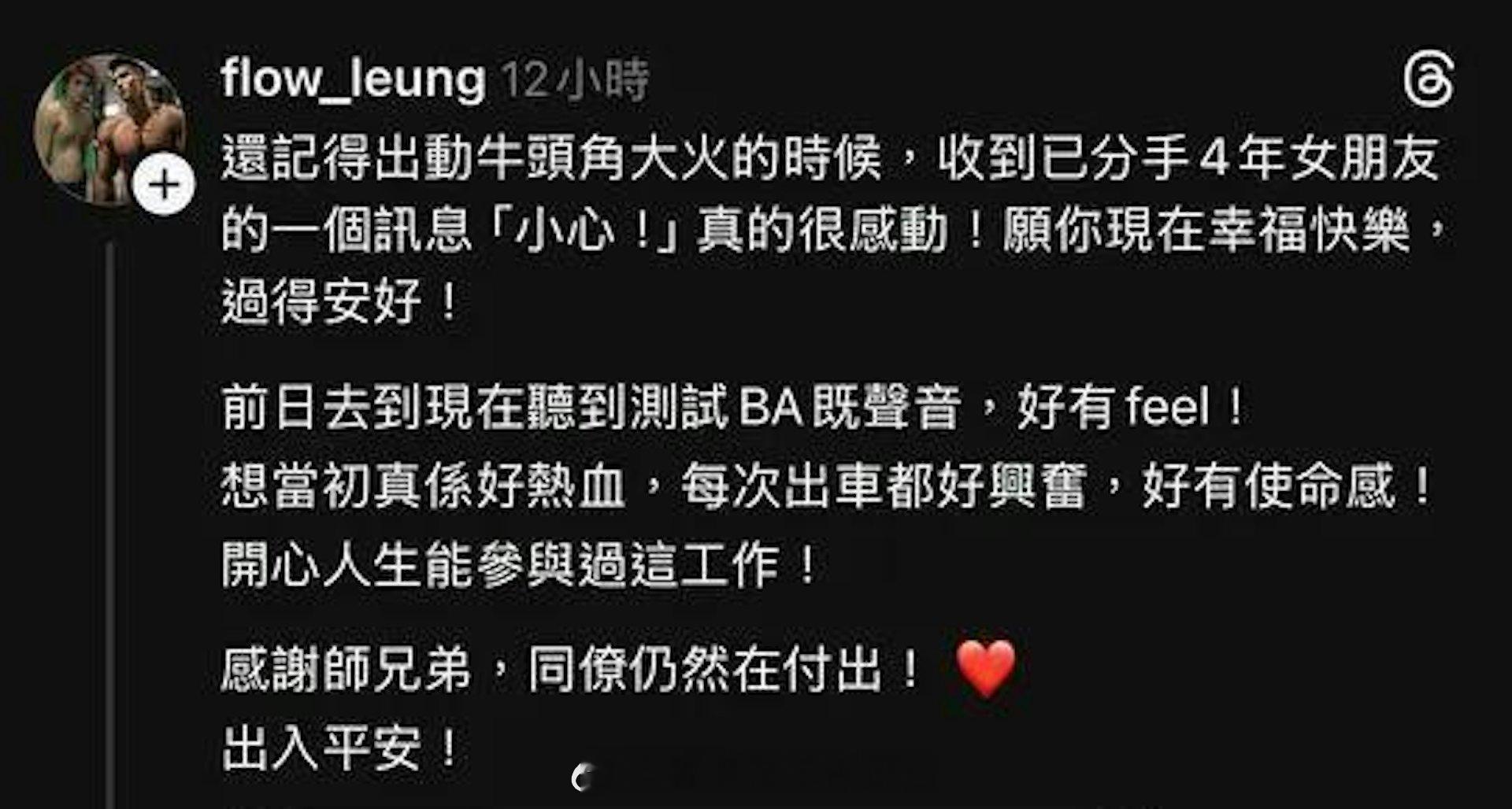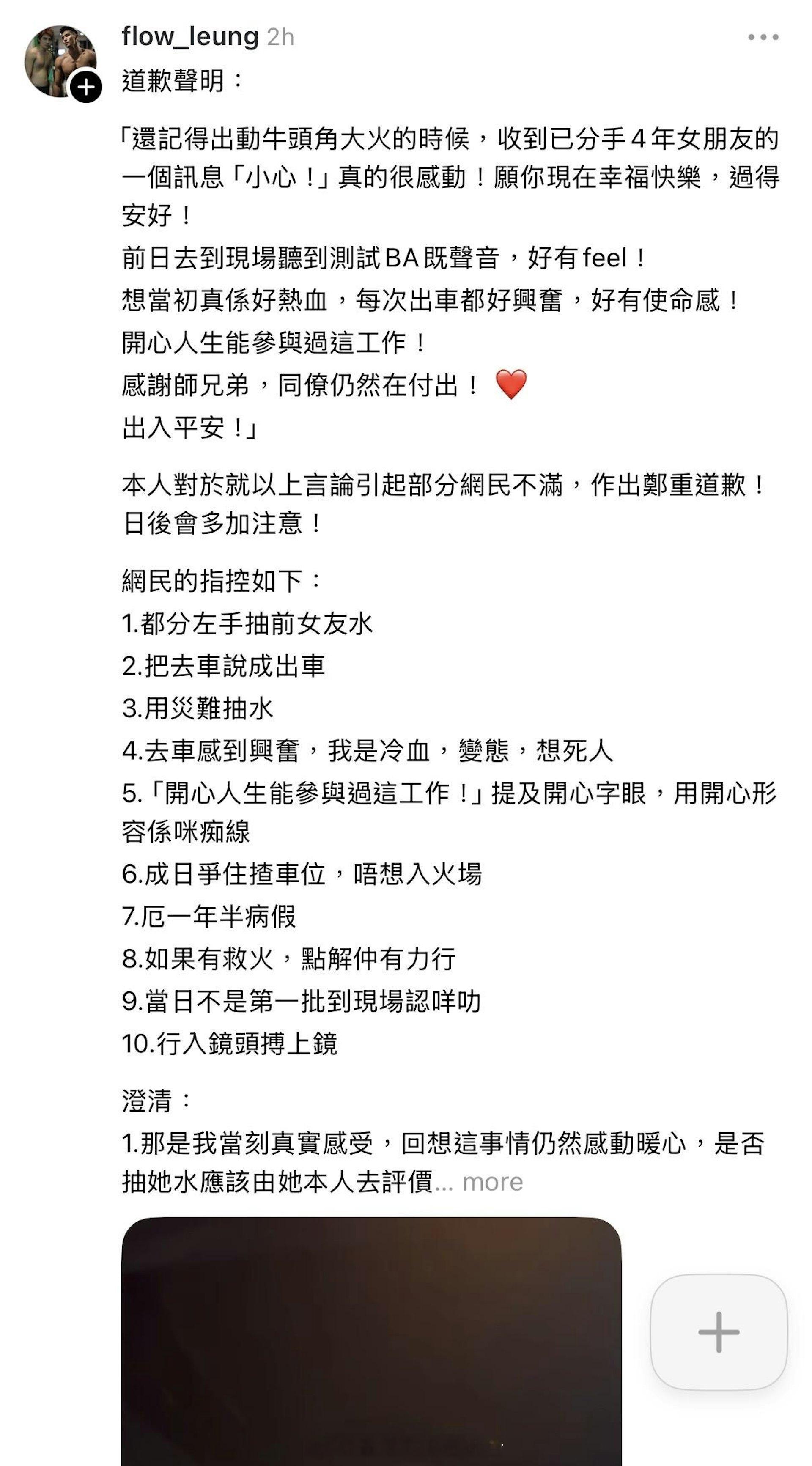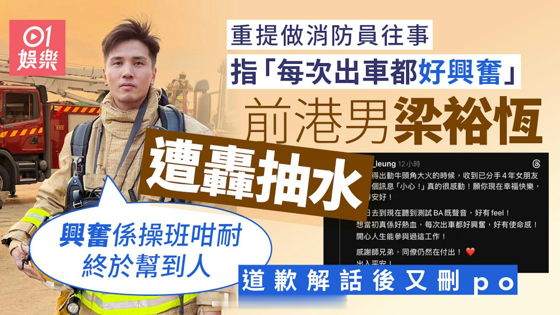 香港01:前港男梁裕恒忆做消防称"每次出车都兴奋" 遭网民轰抽水后致歉大埔宏福苑发生五级大火,全港市民都非常感谢消防员奋不顾身灭火和救人,而2016年度落选香港先生梁裕恒,因多年前做过消防员,近日开贴文讲述自己曾参与2016年牛头角迷你仓大火救援行动,却因提起收到前女友讯息及表示"每次出车都好兴奋",被网民批失言,他于一日后发片致歉,澄清自己绝无抽水之意,不过其后又删走道歉贴文。他贴出当年执勤时被拍得的新闻片段,发文:"还记得出动牛头角大火的时候,收到已分手4年女朋友的一个讯息'小心!'真的很感动!愿你現在幸福快乐,过得安好!前日到现在听到测试 BA 的声音,好有feel!想当初真是好热血,每次出车都好兴奋,好有使命感!开心人生能参与过这工作!感谢师兄弟,同僚仍然在付出!出入平安!"网民指每次消防员出动即是有意外发生,但他竟说"每次出车都好兴奋",极不恰当;亦有人指行内一般因意头问题会讲"去车"而非"出车",且不少人留言批评:"不说一下当年去车,一落地拿装备就说弄伤,问你要不要返局拿身份证,但原来已经一早整个背囊拿定上车,预了搏工伤拿长病假几年?"、"灾难发生了3至4日,净是见你出po提及牛头角火灾都2次,既然你这么喜欢消防员这份工,你为何转行?"、"用灾难来sell保险,怕不怕你儿子看不起你呀?"而梁裕恒昨晚终发文道歉,他回应网民10大指控,否认抽灾难水,纯粹是有感而发,至于"出车"争议,他回应:"最初出班去车感到兴奋,相信是大部分新仔的感受,我们不是因为事故发生而感到兴奋,而是因为训练了半年,终于可以发挥自己的价值,有能力贡献,有机会帮人而感到兴奋。"他亦拍了一条约三分钟的片,指早前帖文若令人有误会或不好受,他在此道歉,重申没想过抽水,只是因为大事发生回忆起以前的感受,对于"出车"失言,他解释:"我所指的兴奋出车,我想好多新仔都有我这一个感受,终于可以参与行动,终于可以贡献自己的价值,操了班这么久,终于可以帮到人,做着当时自己喜欢的工作。那个兴奋开心是这样形容,并不是我会想有什么事件发生,见到死人会好开心。"而"抽前女朋友"水,首先他认为只有旧爱有资格评断他是否抽水,又说:"那一个是我拍了十年拖的女朋友,当时分手了四年,那么我都还挂住她,那么我就……当时收到她讯息是好深感受的事实上是。我之后用了八年时间才放下了她。"由于梁裕恒近年转职做保险,网民觉得他想藉灾难sell保险,他则否认,先说自己在大火后有送物资,平时有做义工,今次都有同团队讲明不要将大火连系至保险,他强调:"那些人说我出个Post为了sell保险,我整个Post里面没有提及任何保险。如果上一个关于销售的保险是一月十……十一月十五号,相隔现在十五日。"片尾他再次道歉,不过其后他又再把道歉贴文删除。