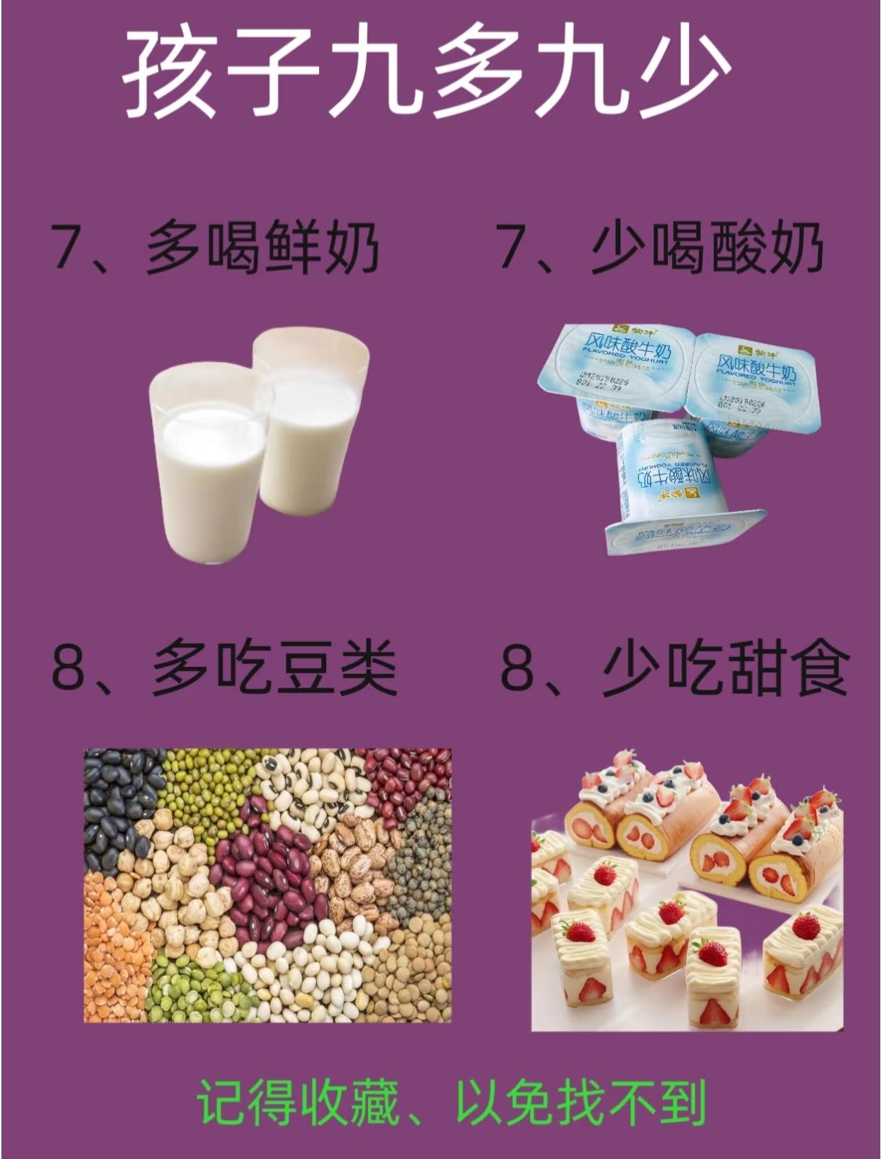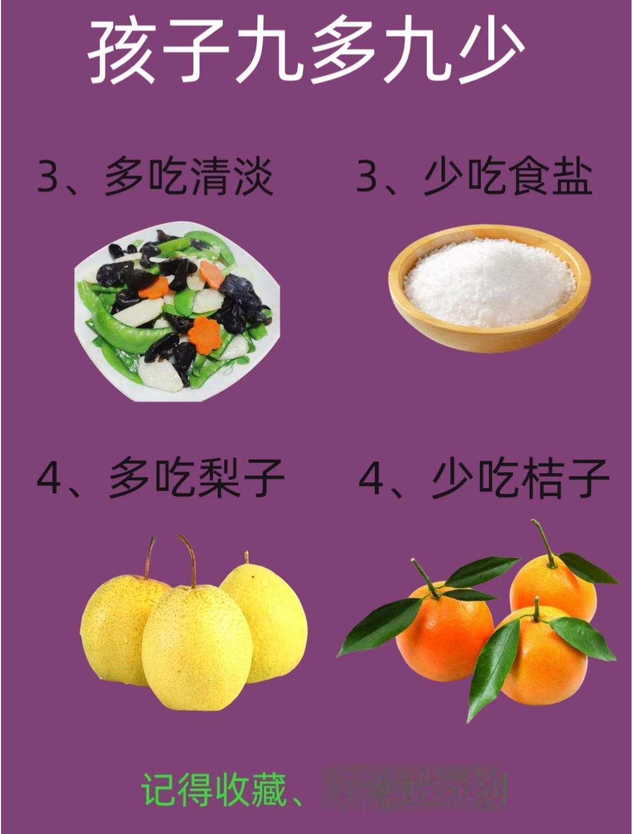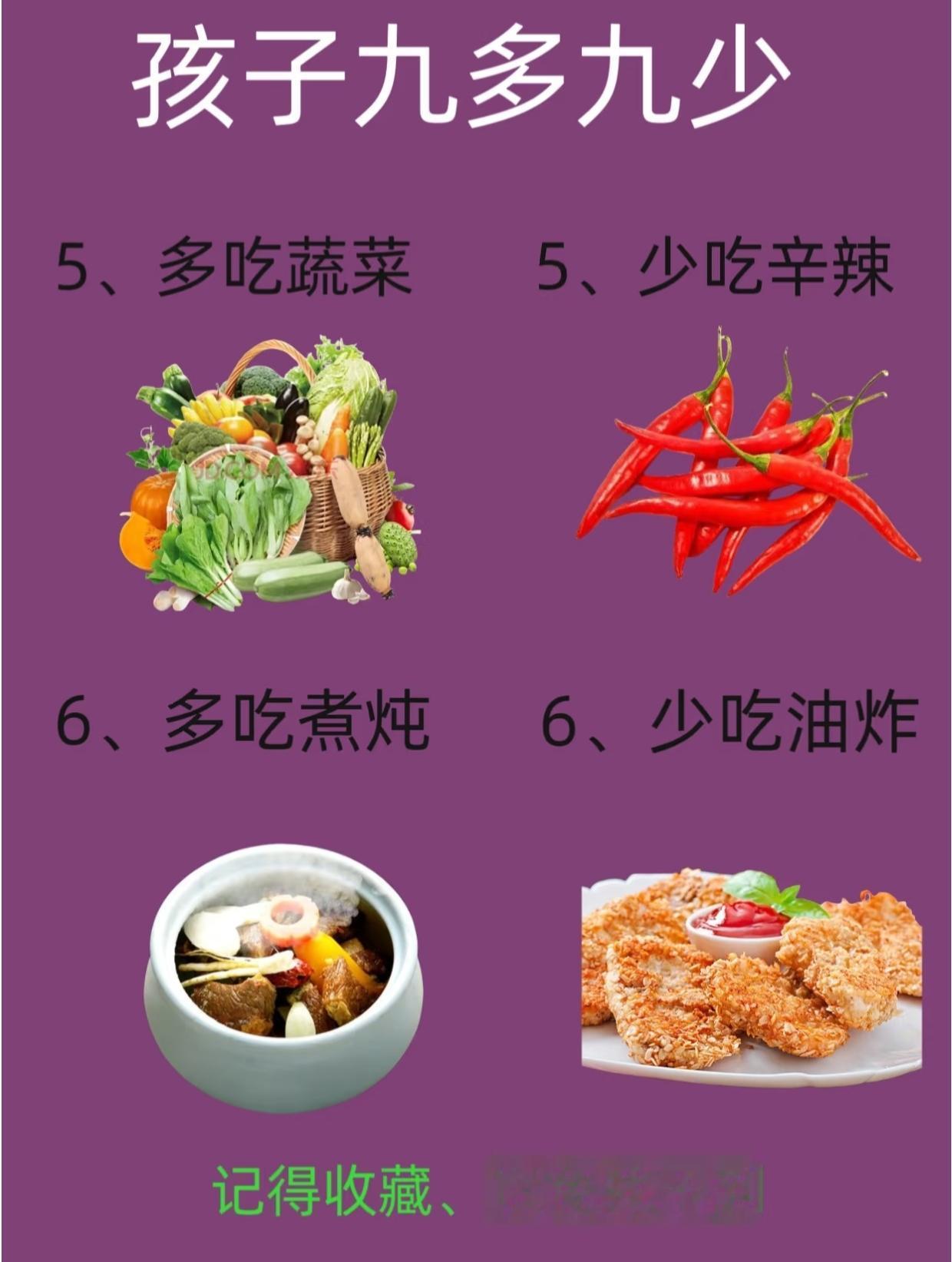日常孩子九多九少吃‼️建议妈妈们收藏‼️。1️⃣.多吃苹果🍎少吃草莓🍓.2️⃣.多吃鱼类🐟少吃肥肉🥩.3️⃣.多吃清淡🥬少吃食盐🧂.4️⃣.多吃梨子🍐少吃橘子🍊.5️⃣.多吃蔬菜🥦少吃辛辣🌶️.6️⃣.多吃清煮🫕少吃油炸🍟.7️⃣.多喝鲜奶🥛少喝酸奶🧃.8️⃣.多吃豆类🥔少吃甜食🍰.9️⃣.多吃温热♨️少吃寒凉🧊